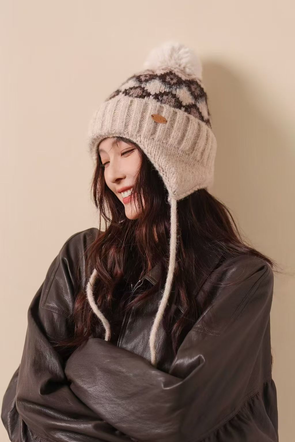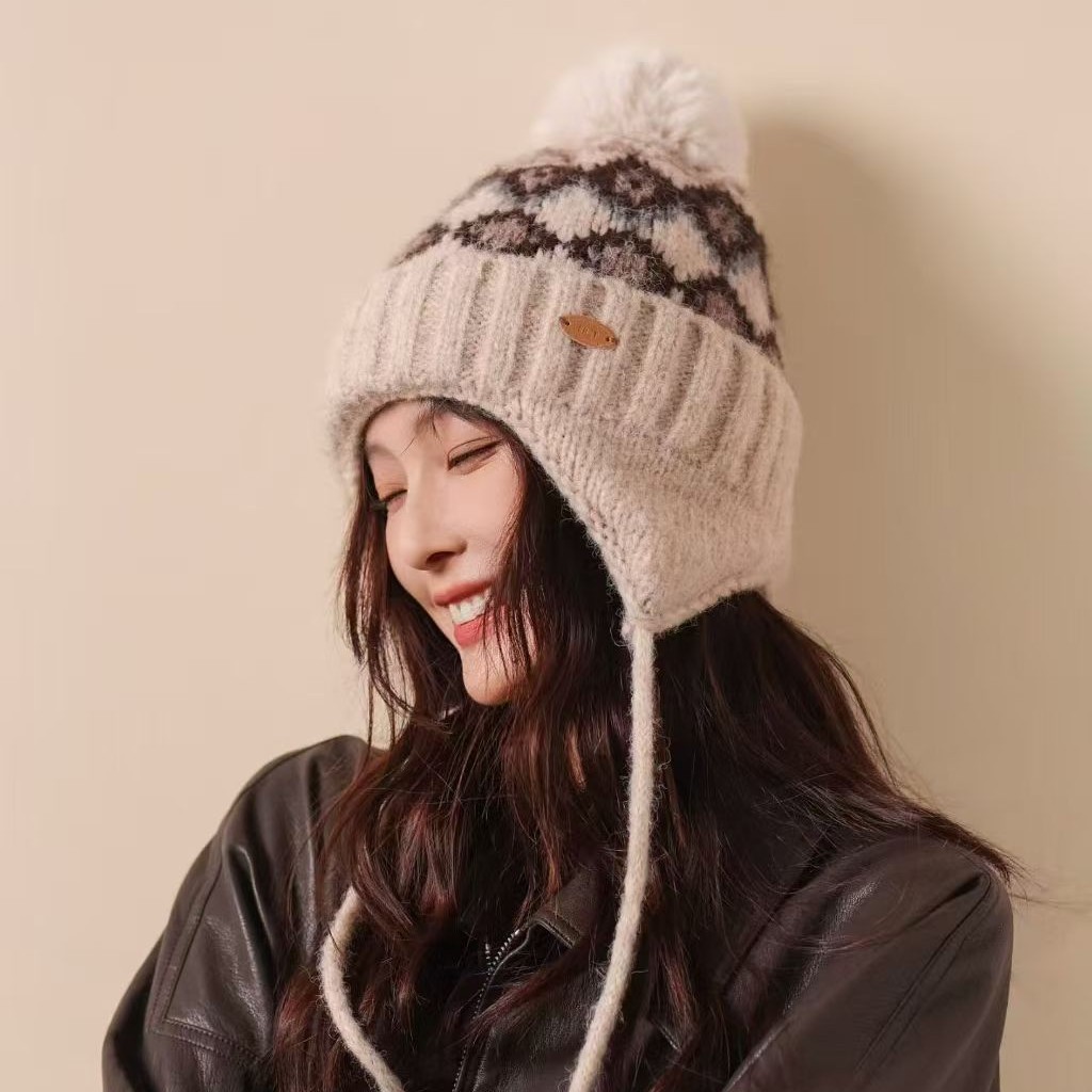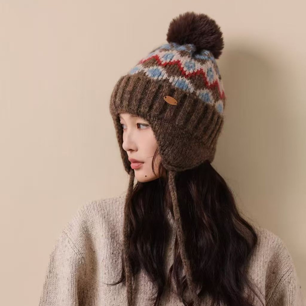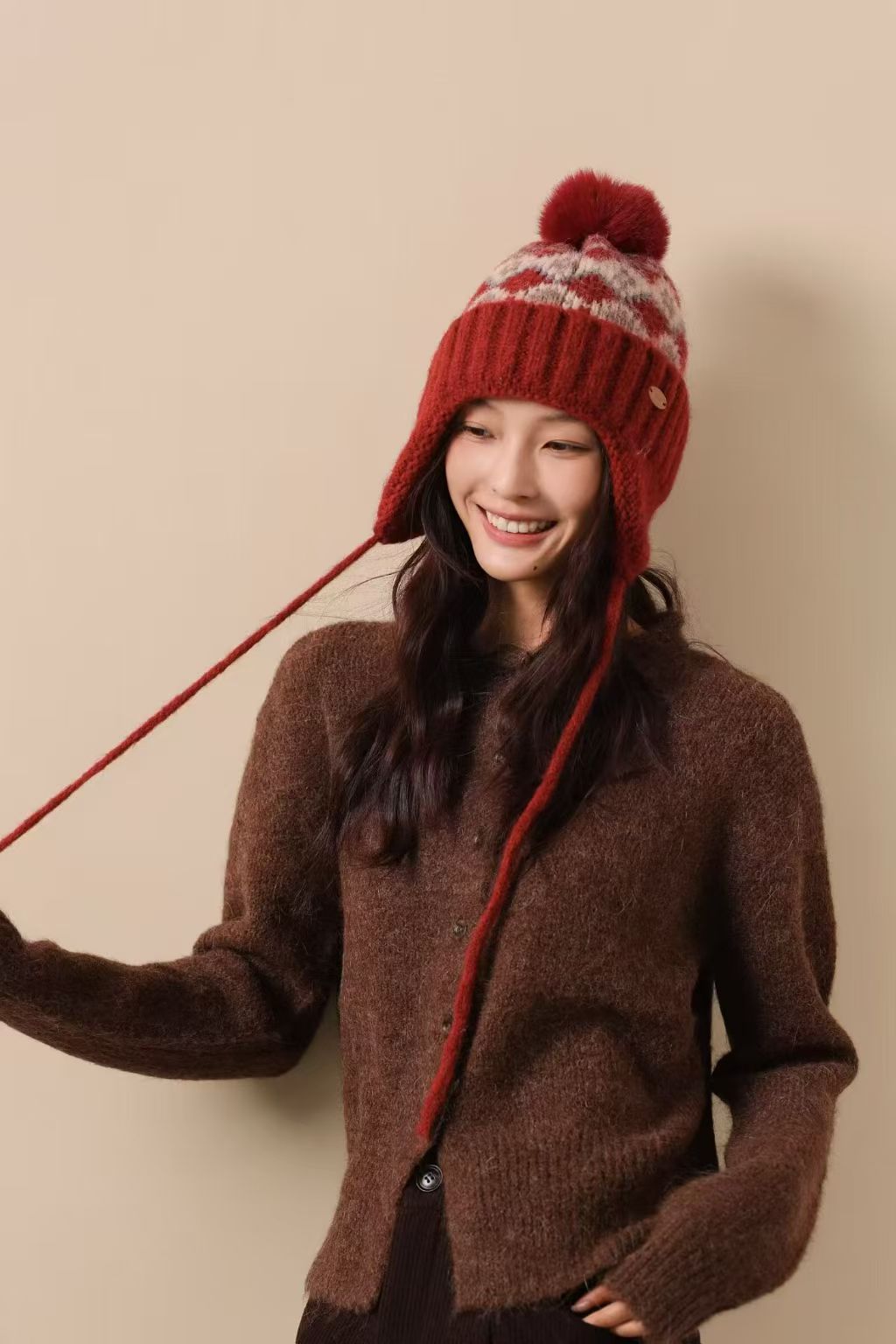费尔岛风帽子秋冬防风保暖针织毛线帽男女红色加厚骑车护耳雷锋帽