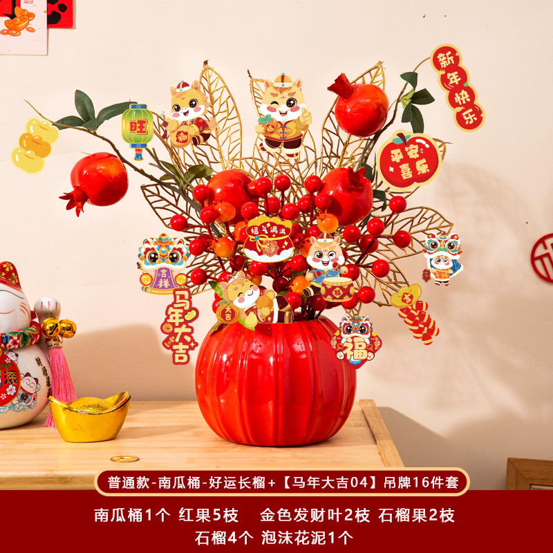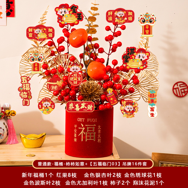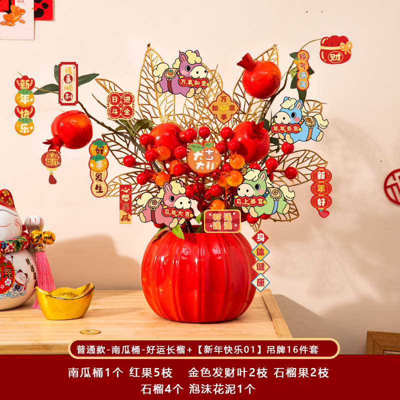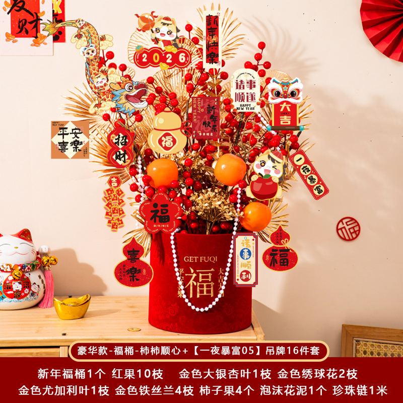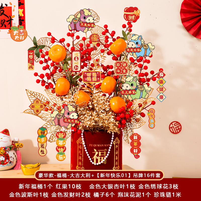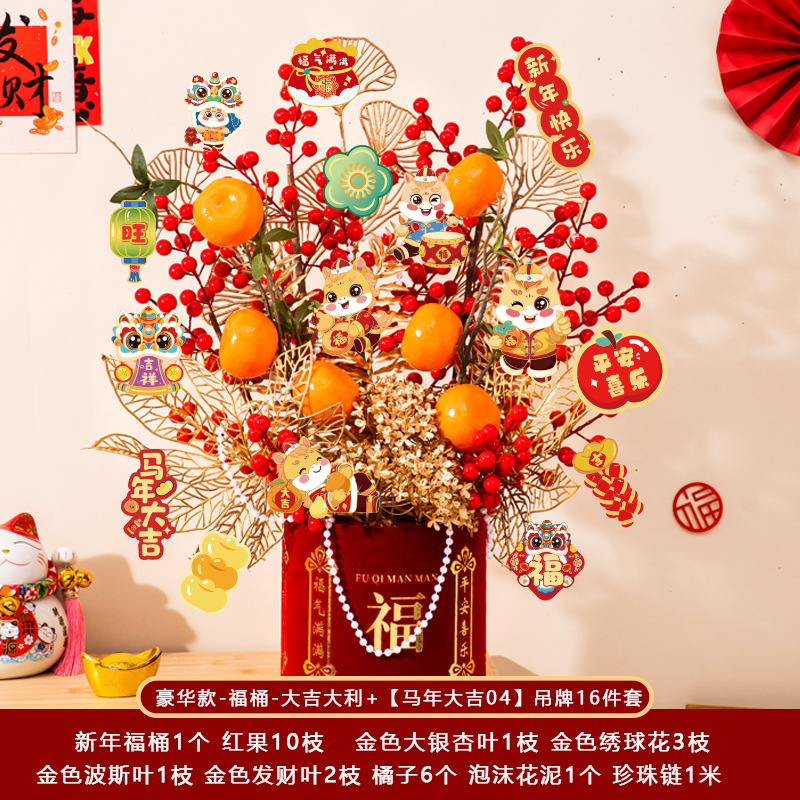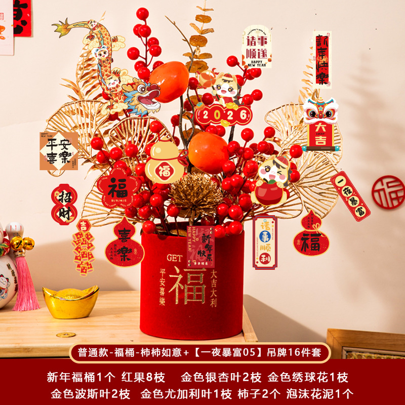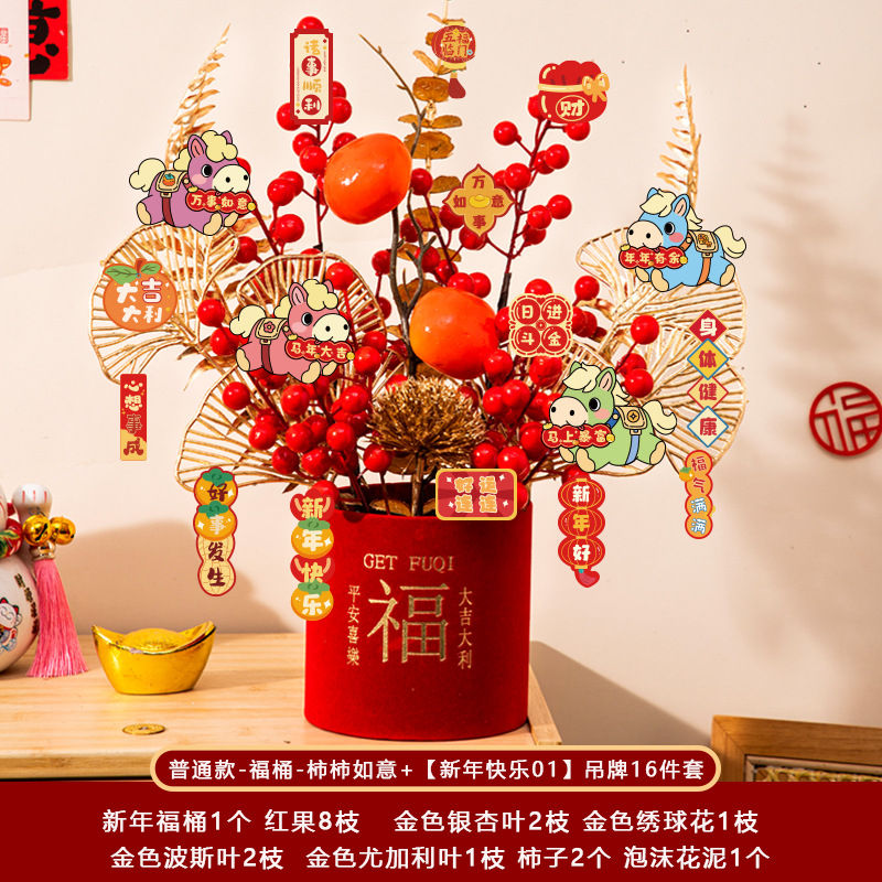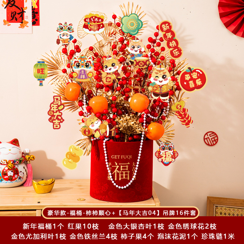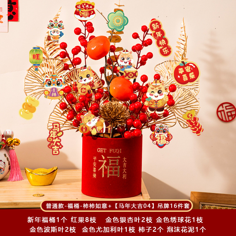 新年福桶摆件2026马年装饰发财红果春节过年花盆栽抱抱桶过年布置
