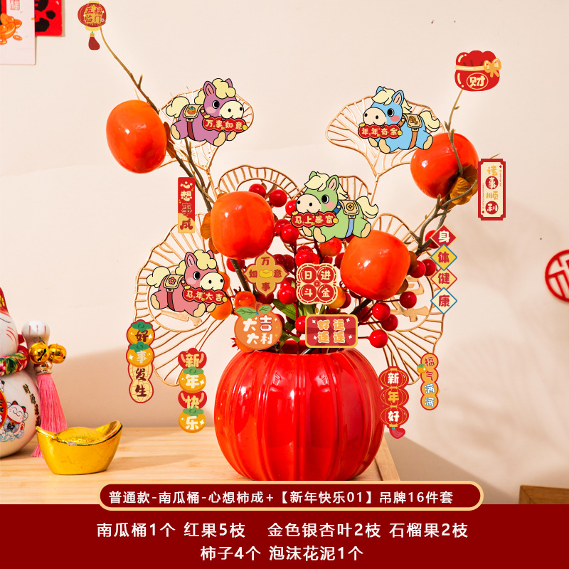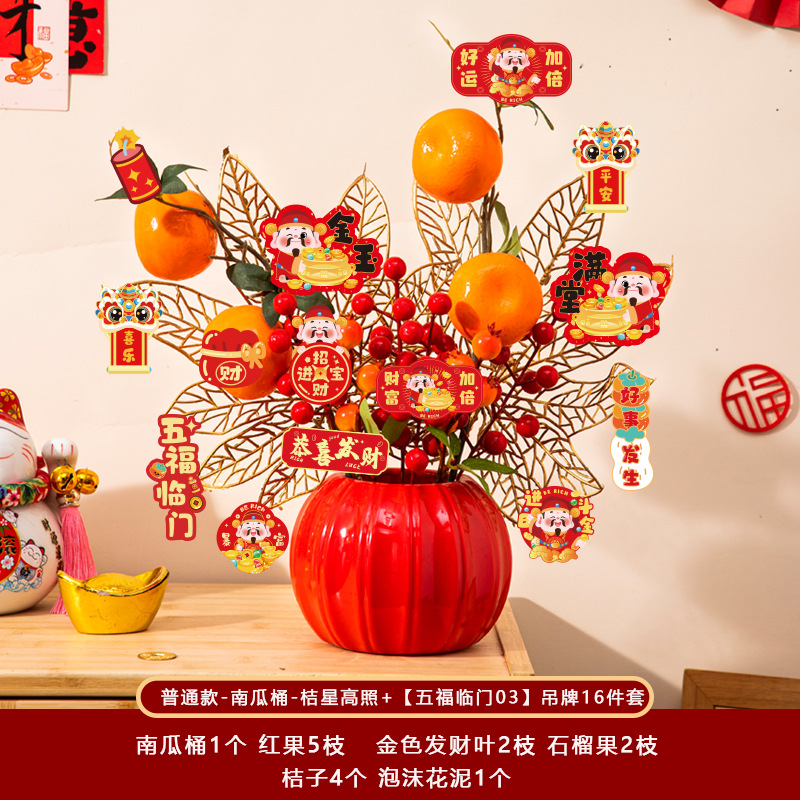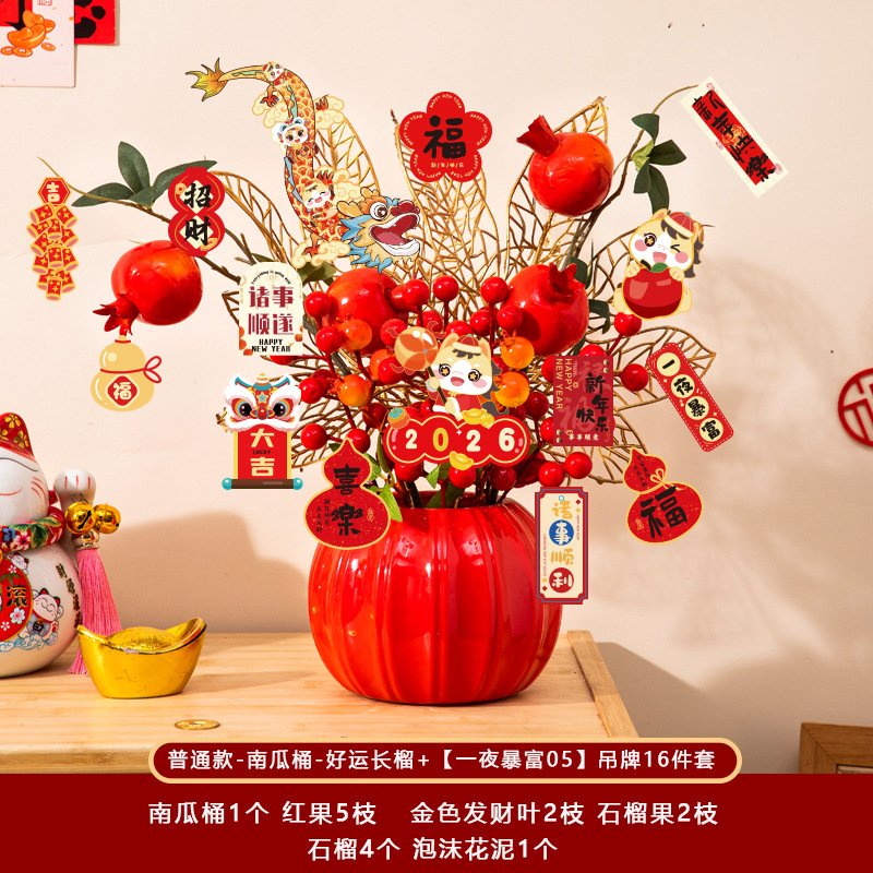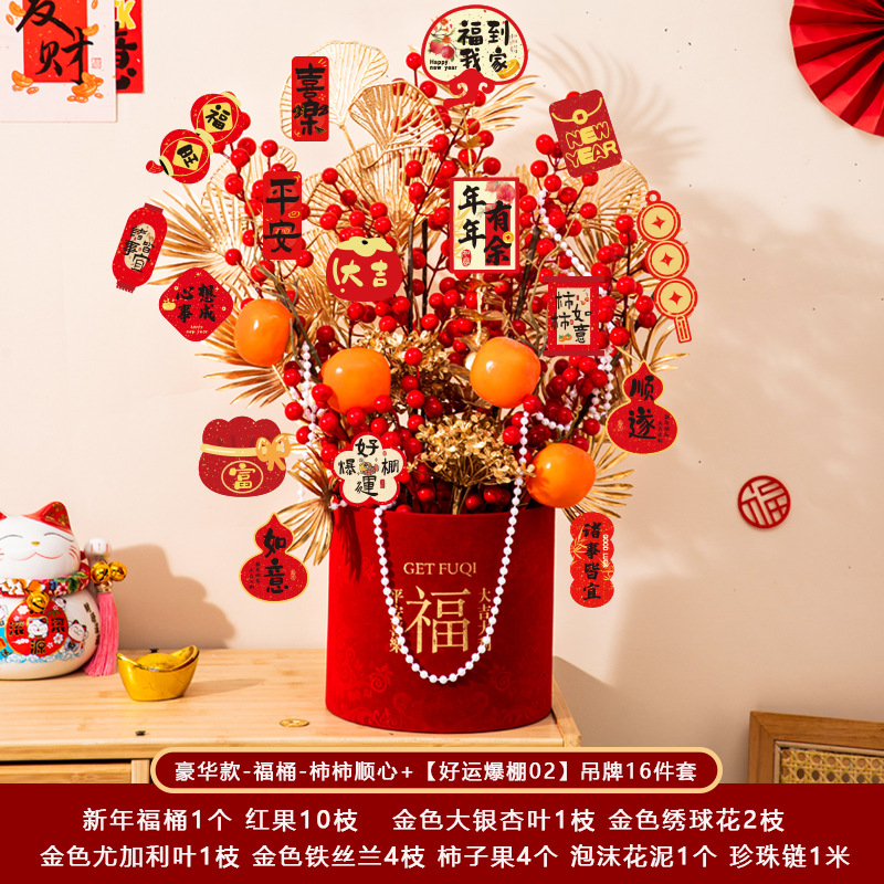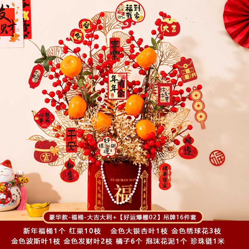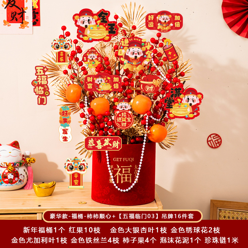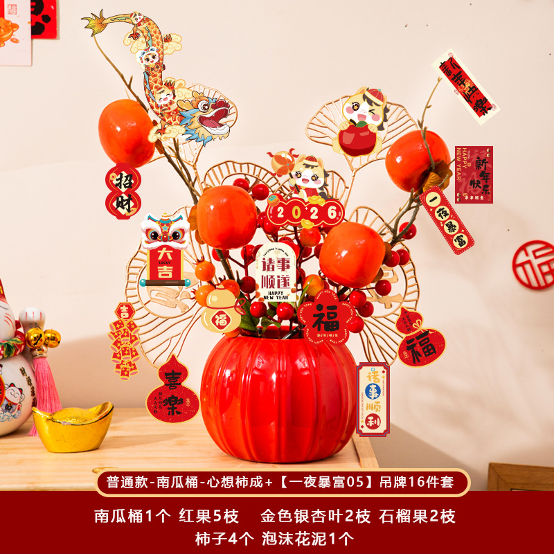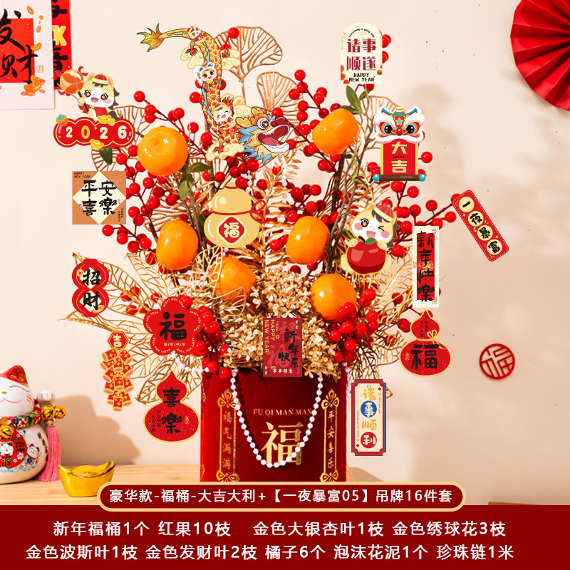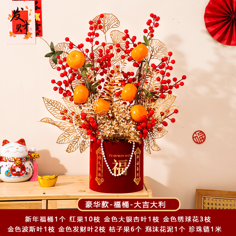 新年福桶摆件2026马年装饰发财红果春节过年花盆栽抱抱桶过年布置