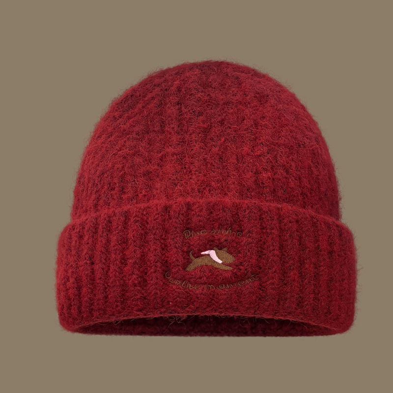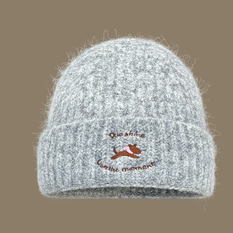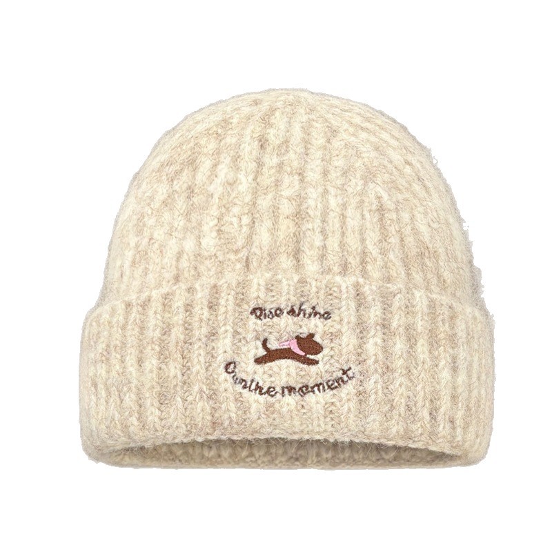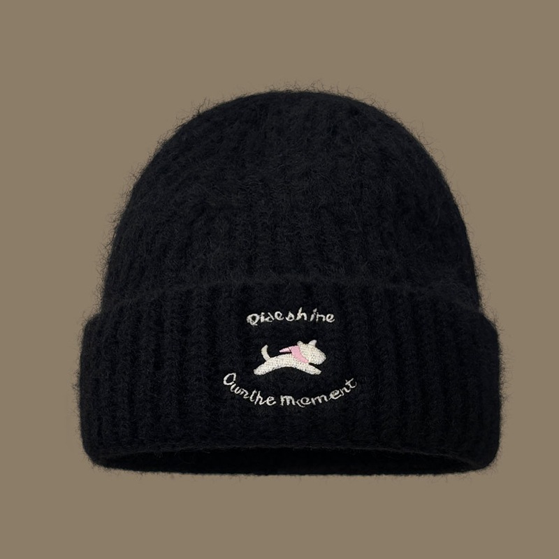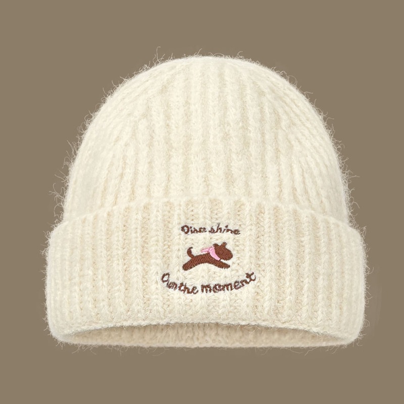 日系奔跑小狗刺绣针织毛线帽女秋冬季显脸小护耳帽百搭大头围帽子