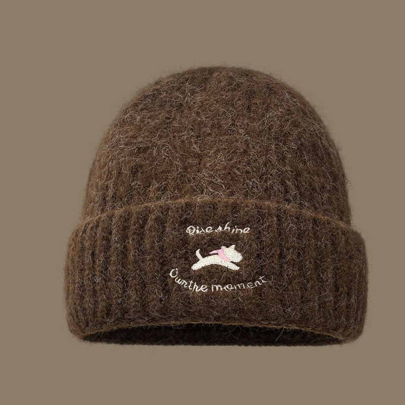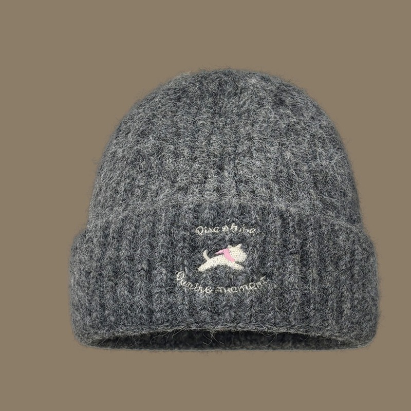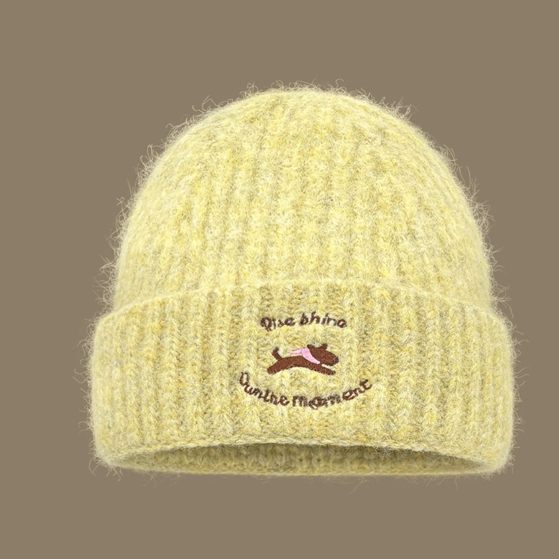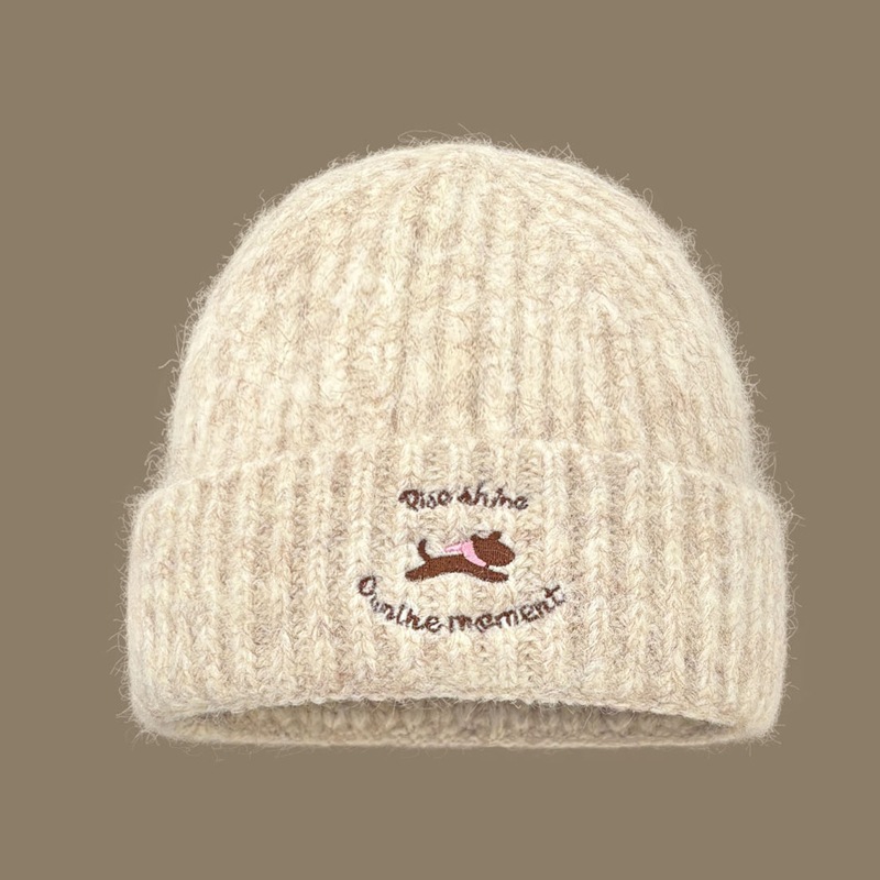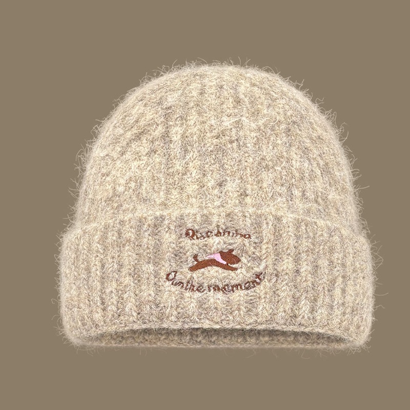 日系奔跑小狗刺绣针织毛线帽女秋冬季显脸小护耳帽百搭大头围帽子
