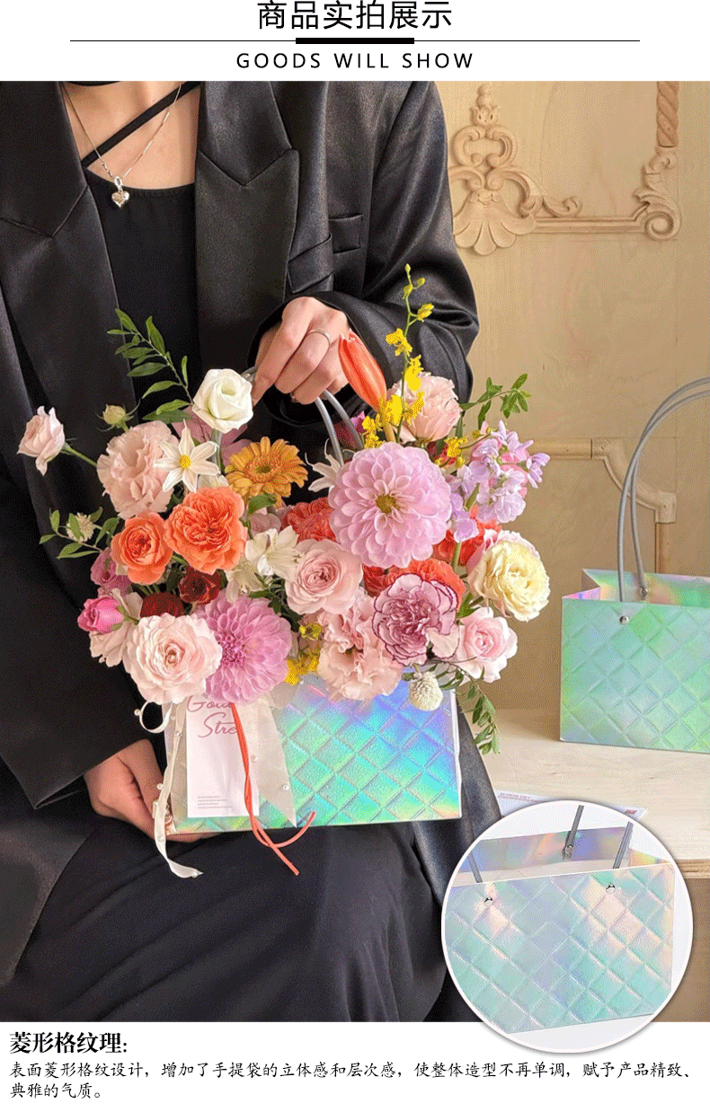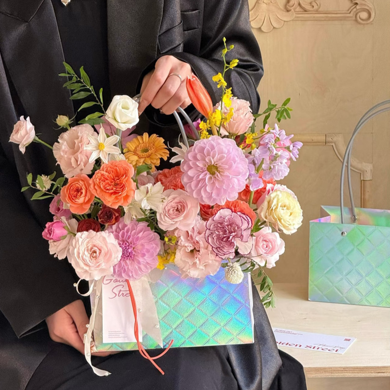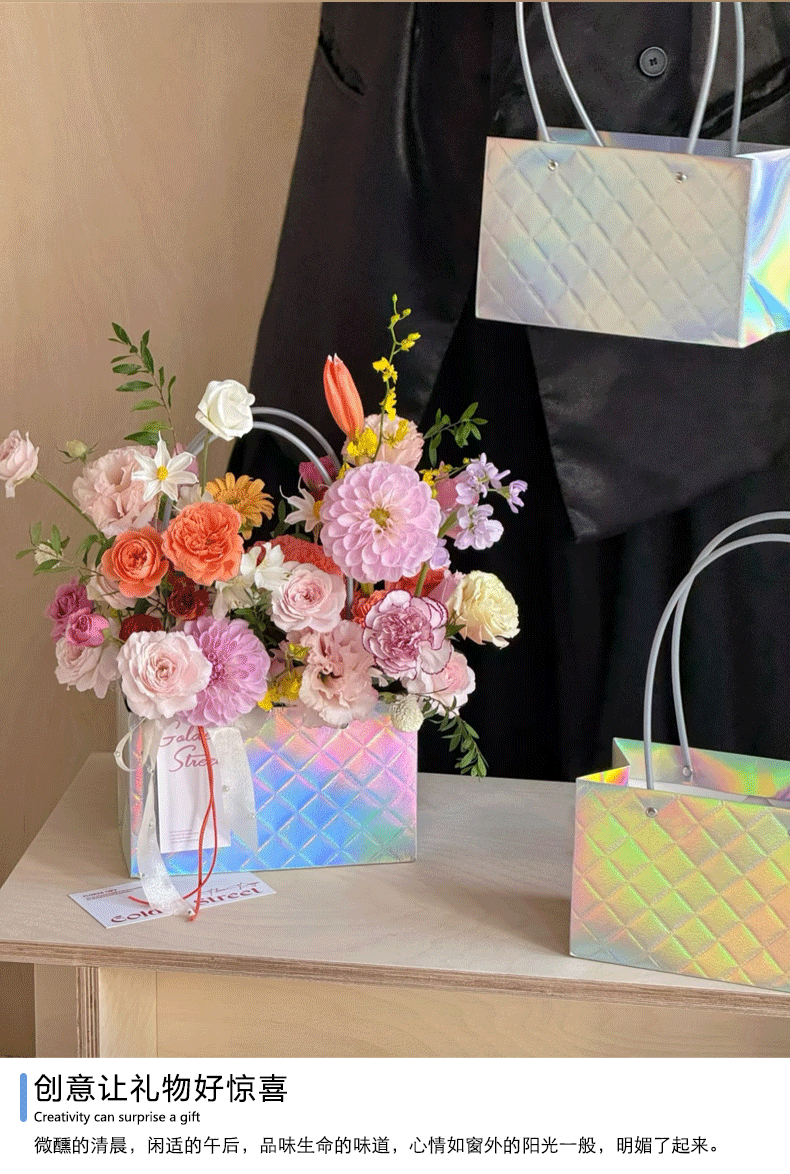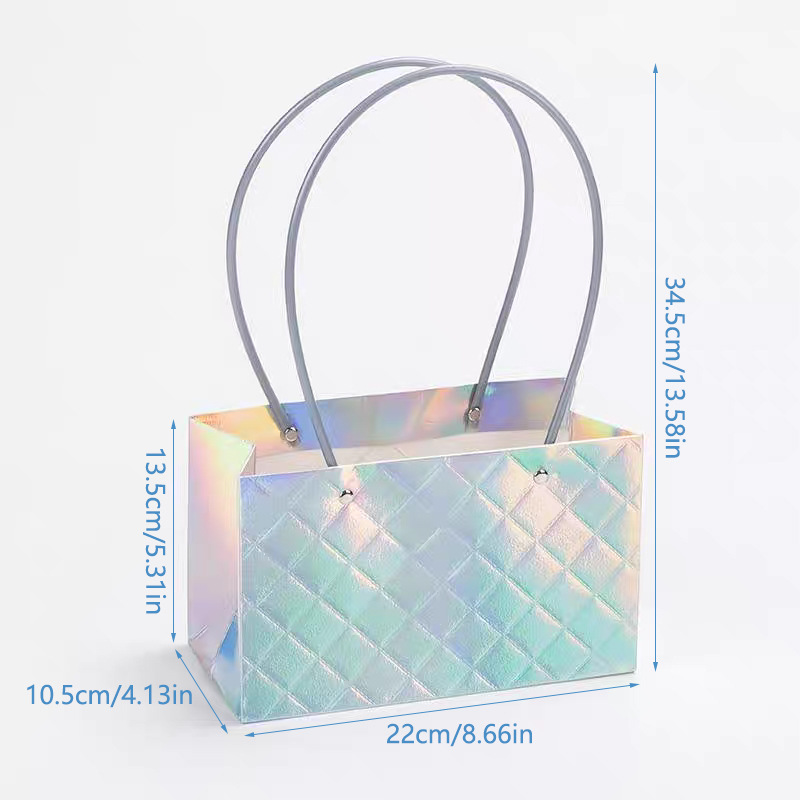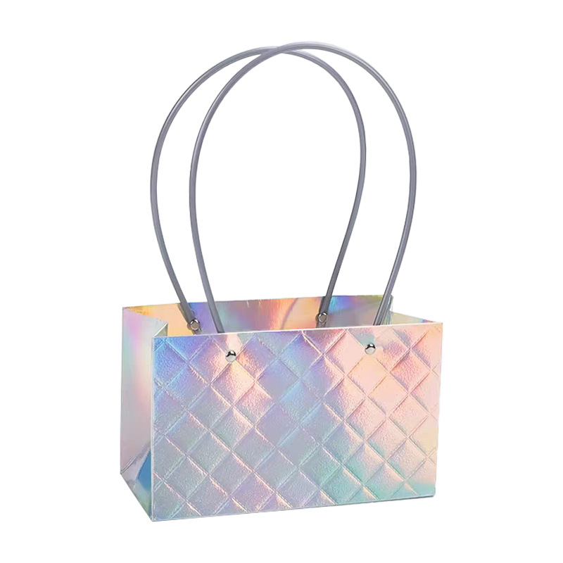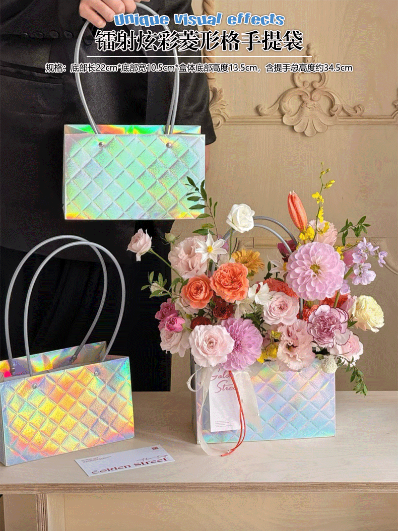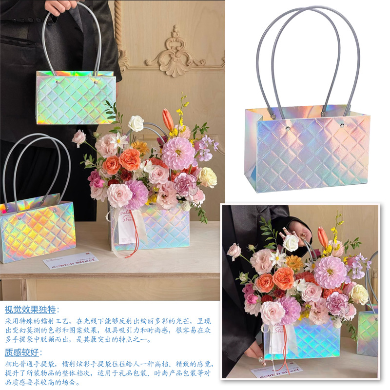 镭射炫彩花束手提袋菱形格包装袋鲜花插花礼品袋礼物伴手礼袋批发
