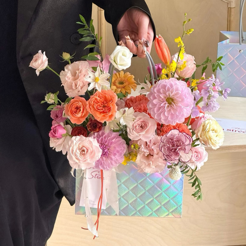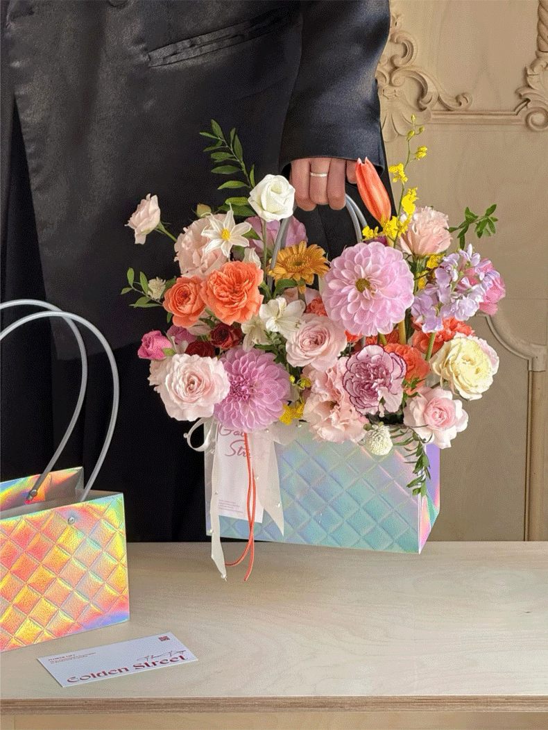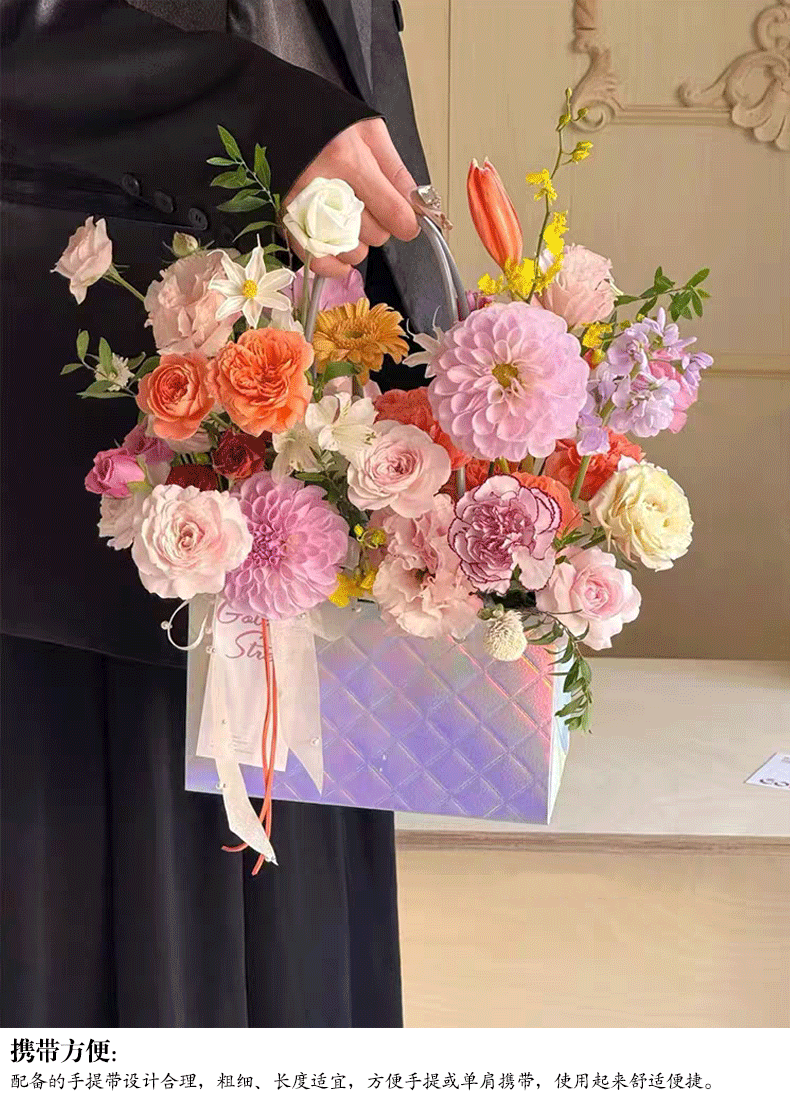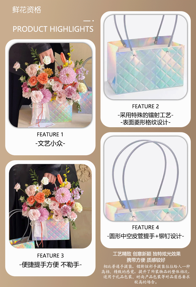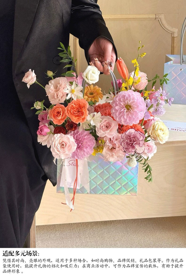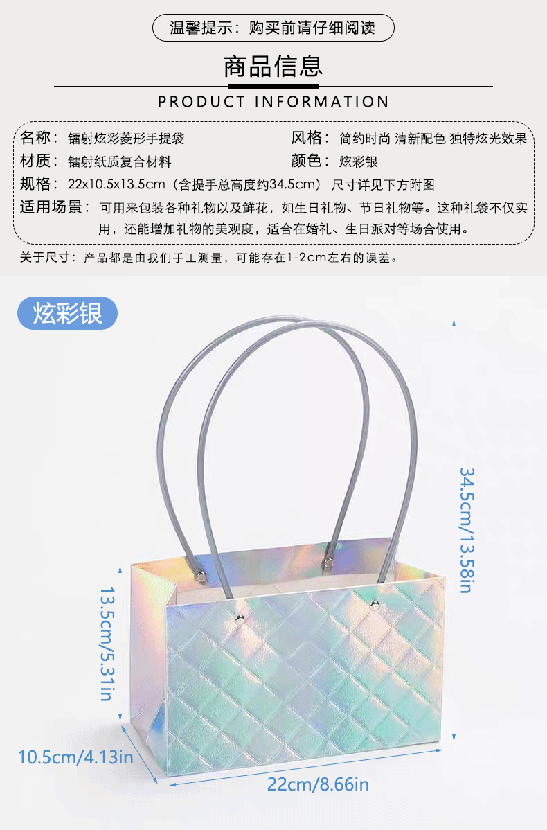 镭射炫彩花束手提袋菱形格包装袋鲜花插花礼品袋礼物伴手礼袋批发