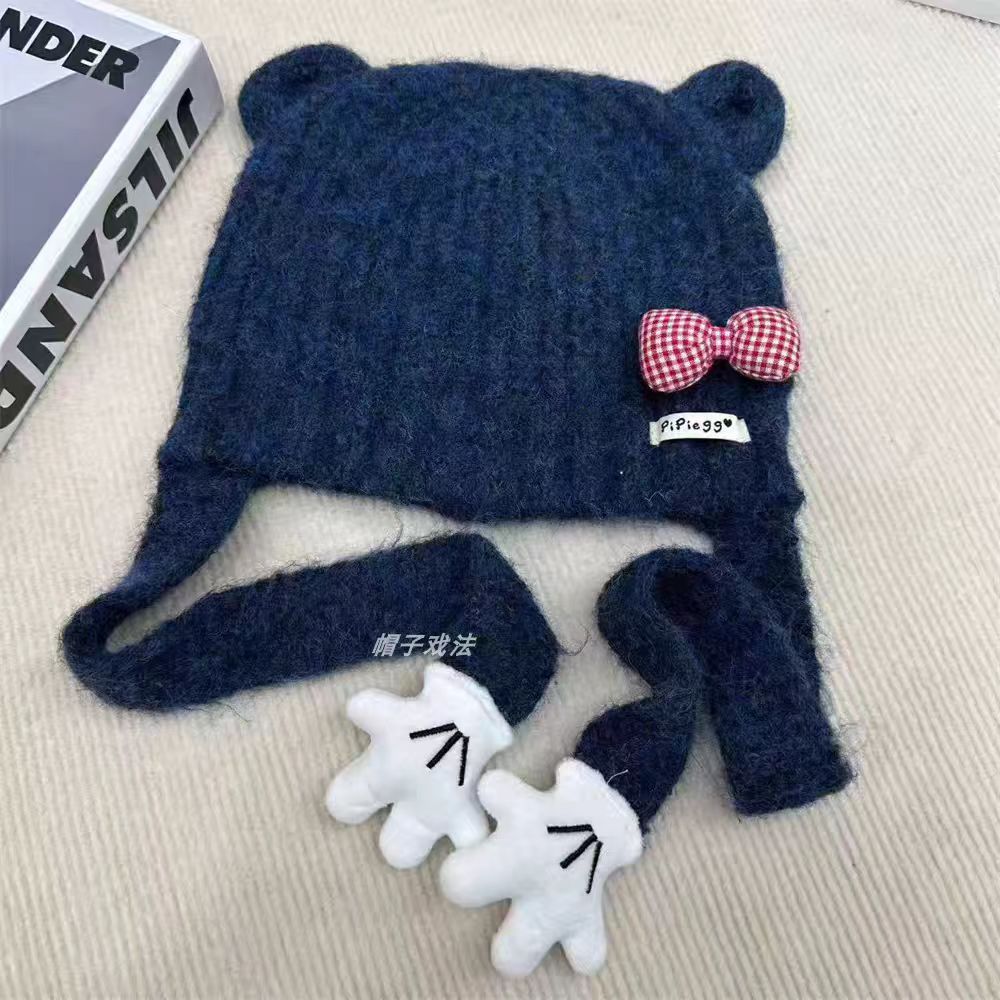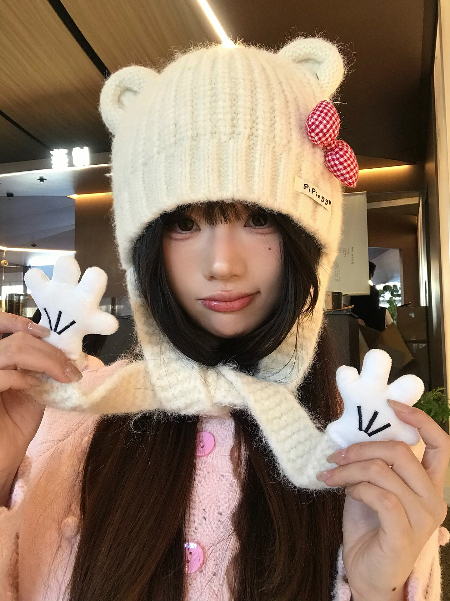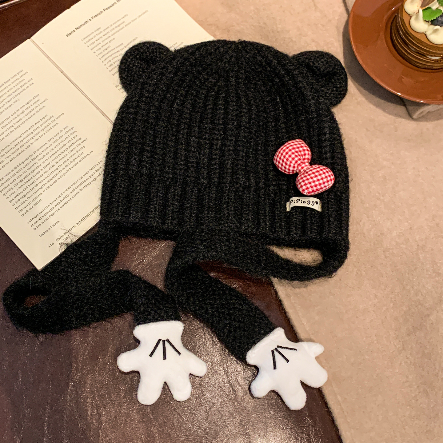 甜美蝴蝶结可爱猫耳针织帽女秋冬季防寒保暖百搭大头围毛线雷锋帽