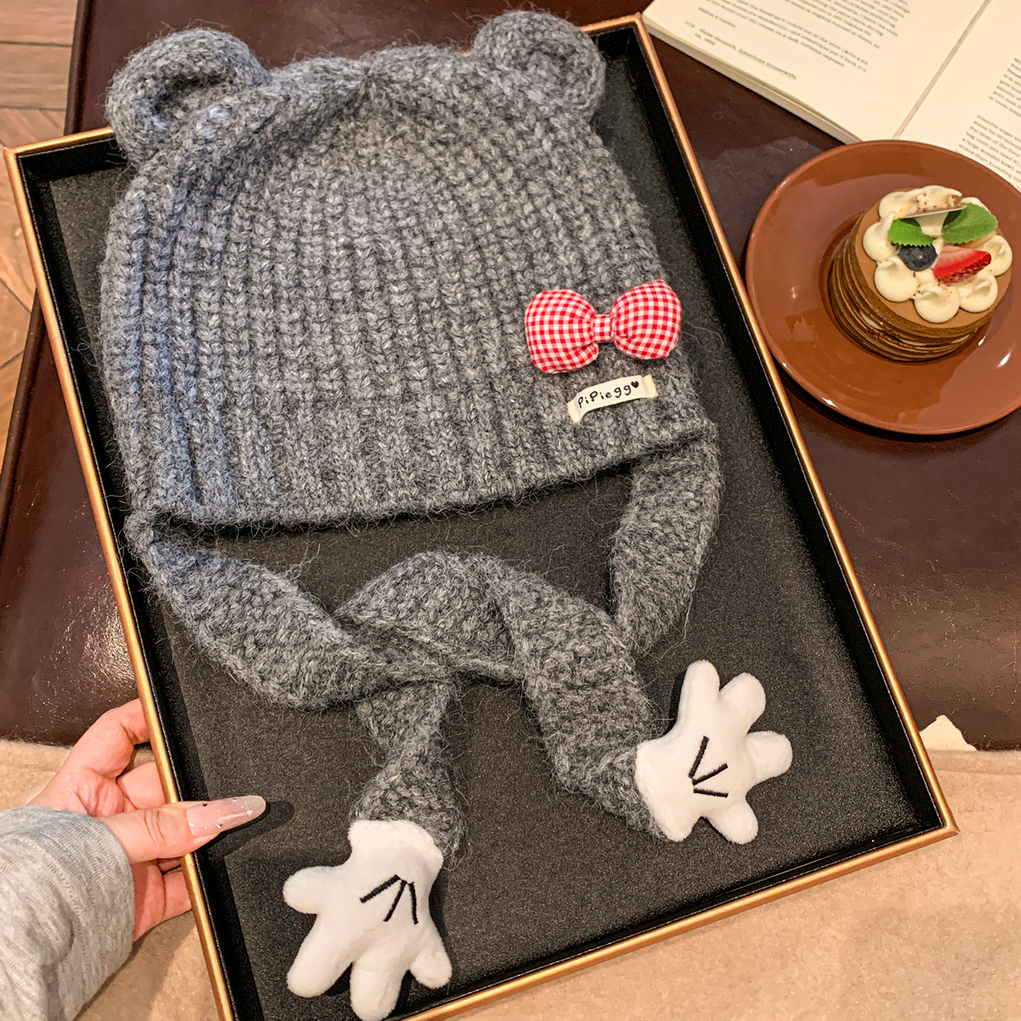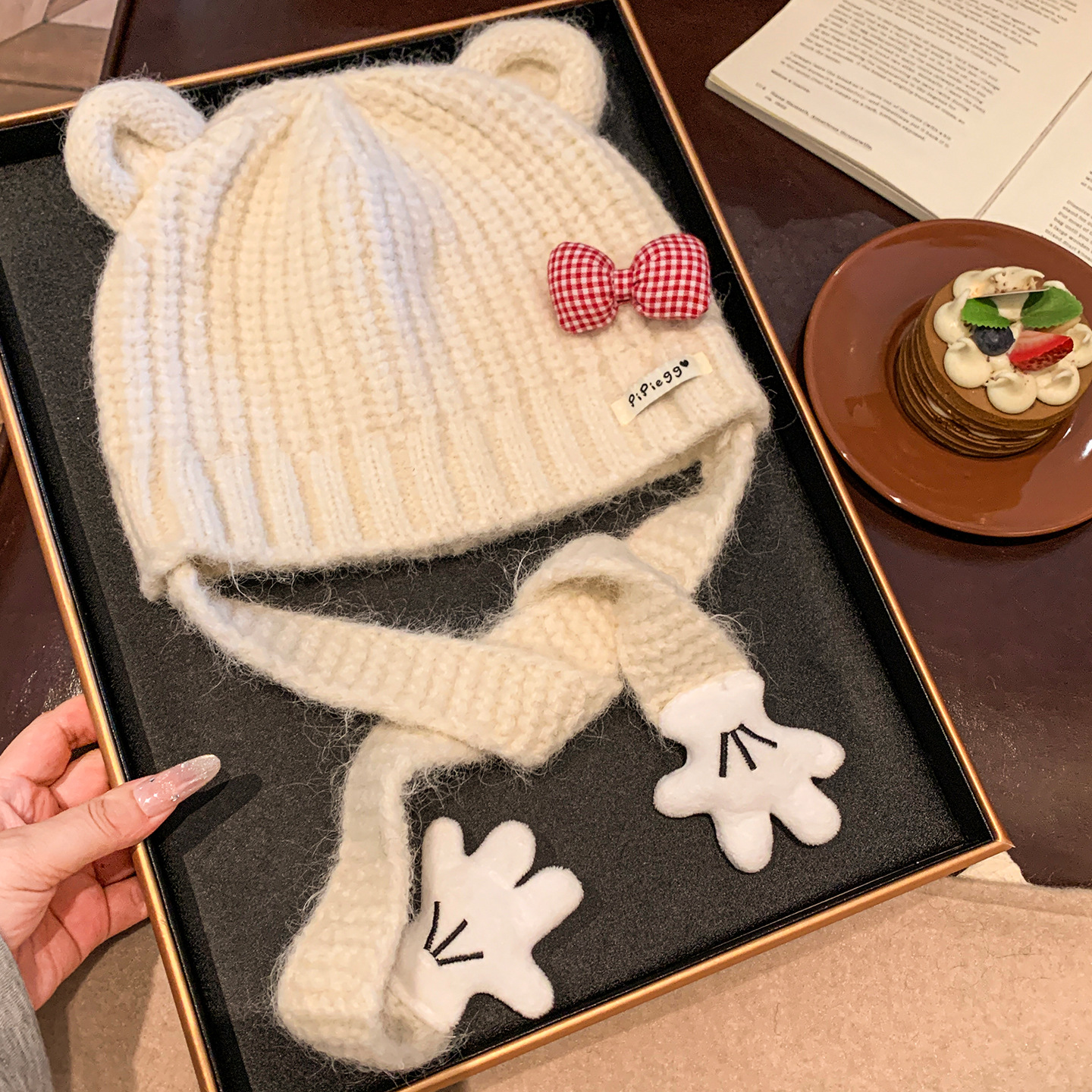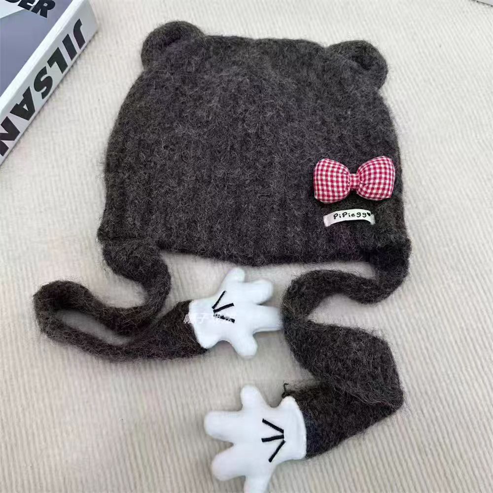 甜美蝴蝶结可爱猫耳针织帽女秋冬季防寒保暖百搭大头围毛线雷锋帽