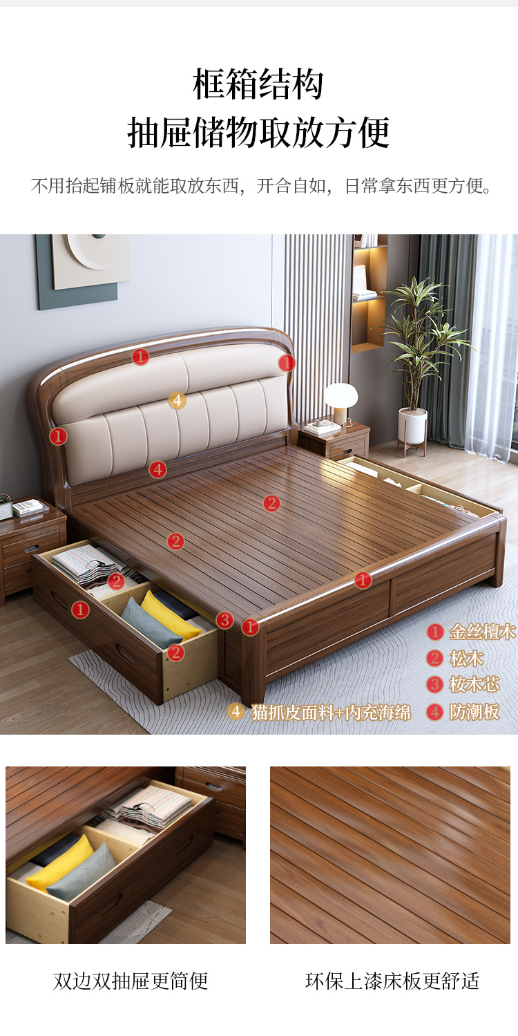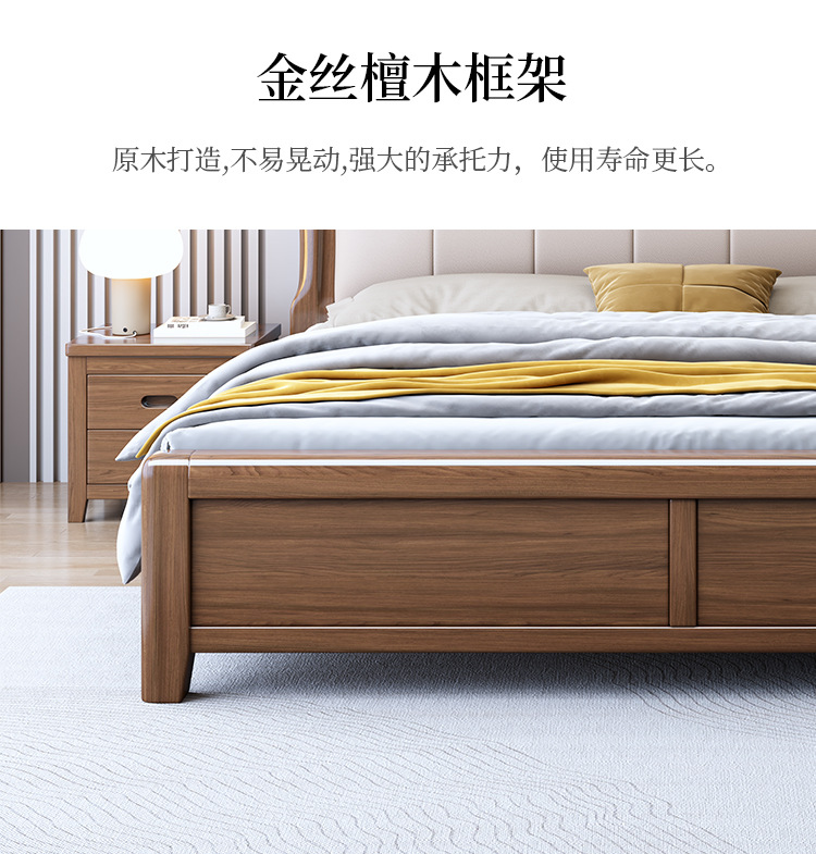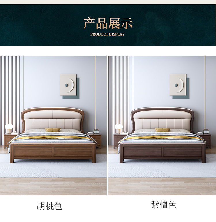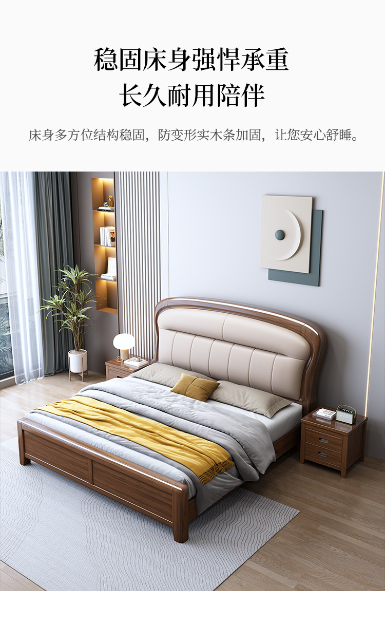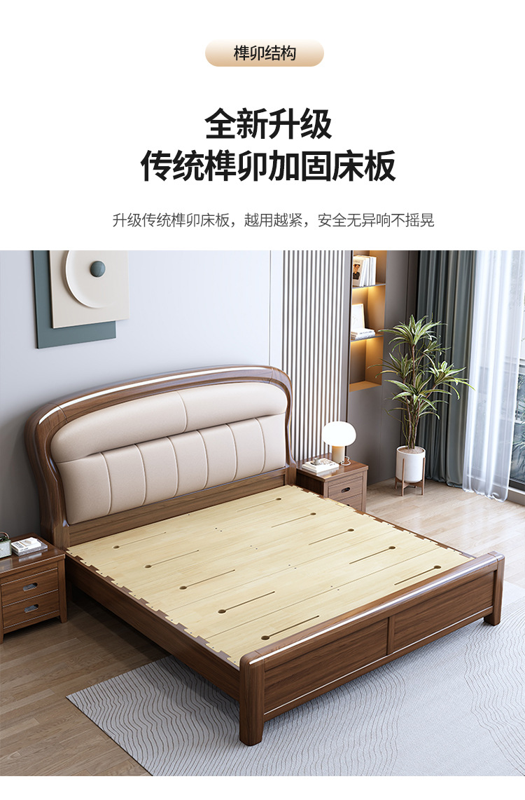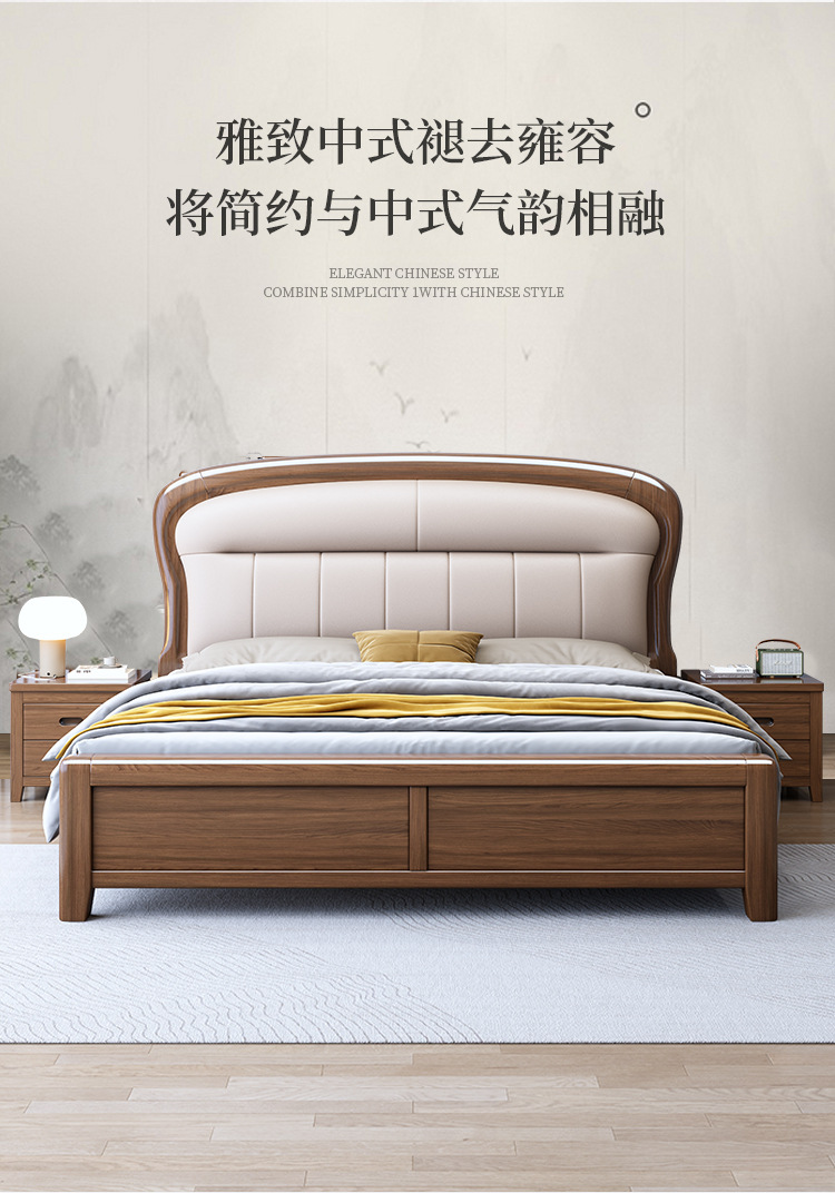 现代中式实木床胡桃木色软靠1.8米双人卧室主卧室1.5米单人抽屉床