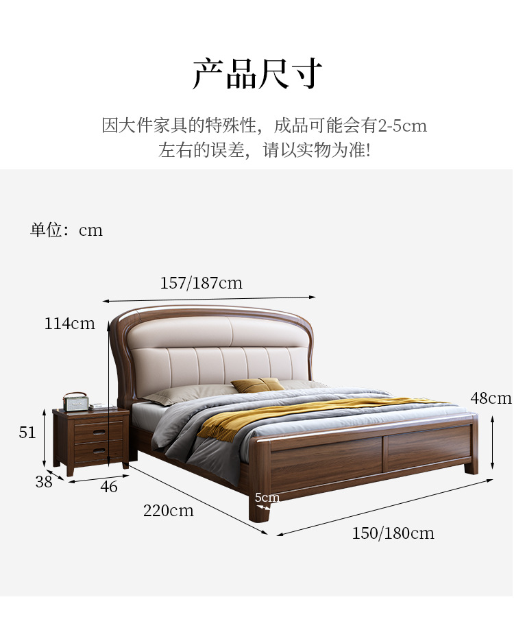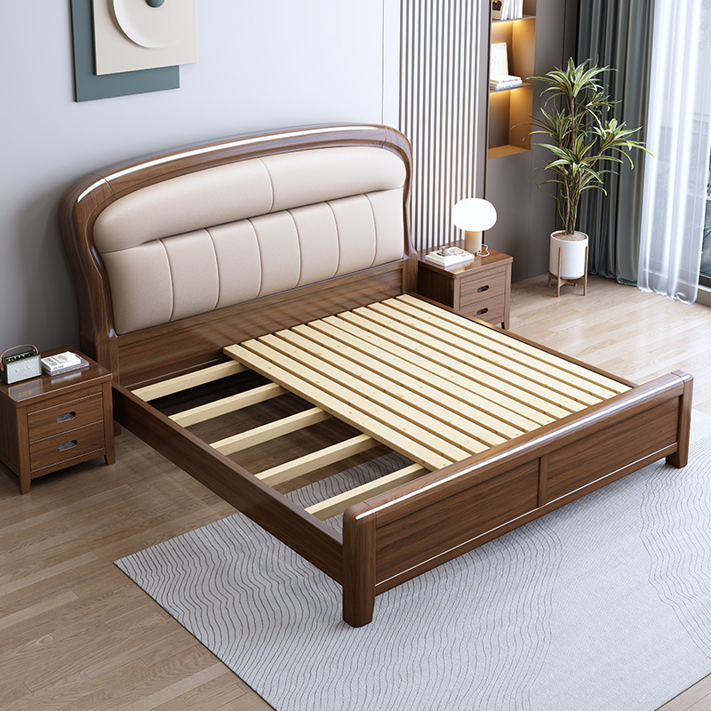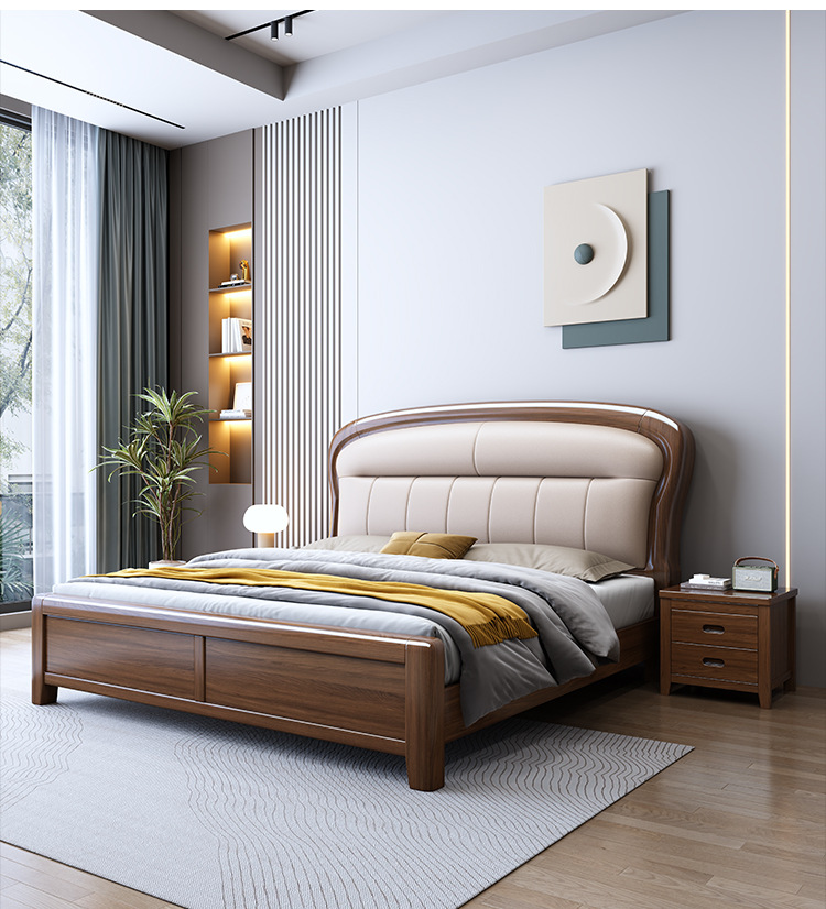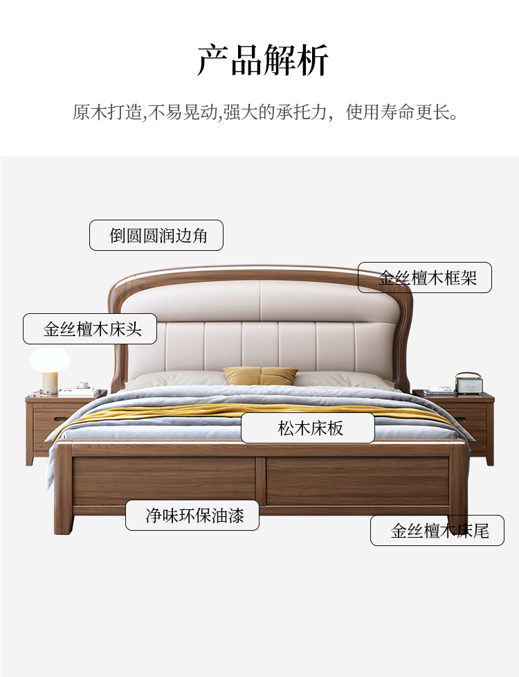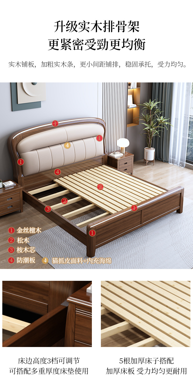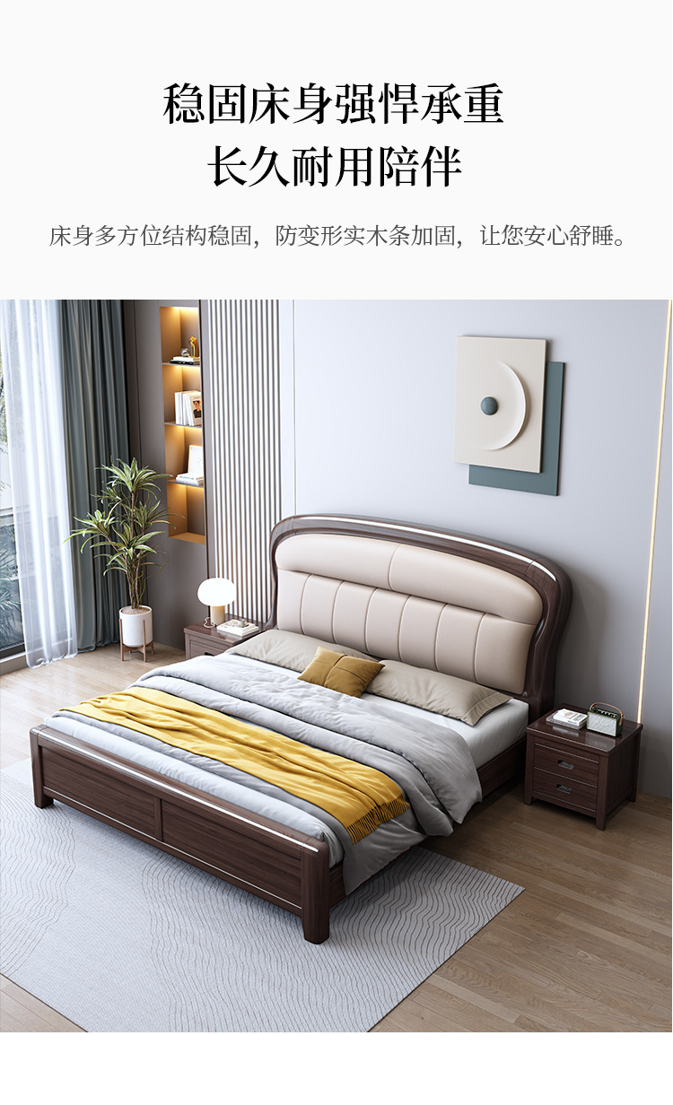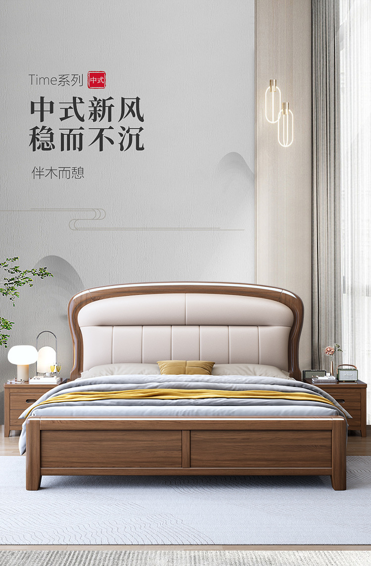 现代中式实木床胡桃木色软靠1.8米双人卧室主卧室1.5米单人抽屉床
