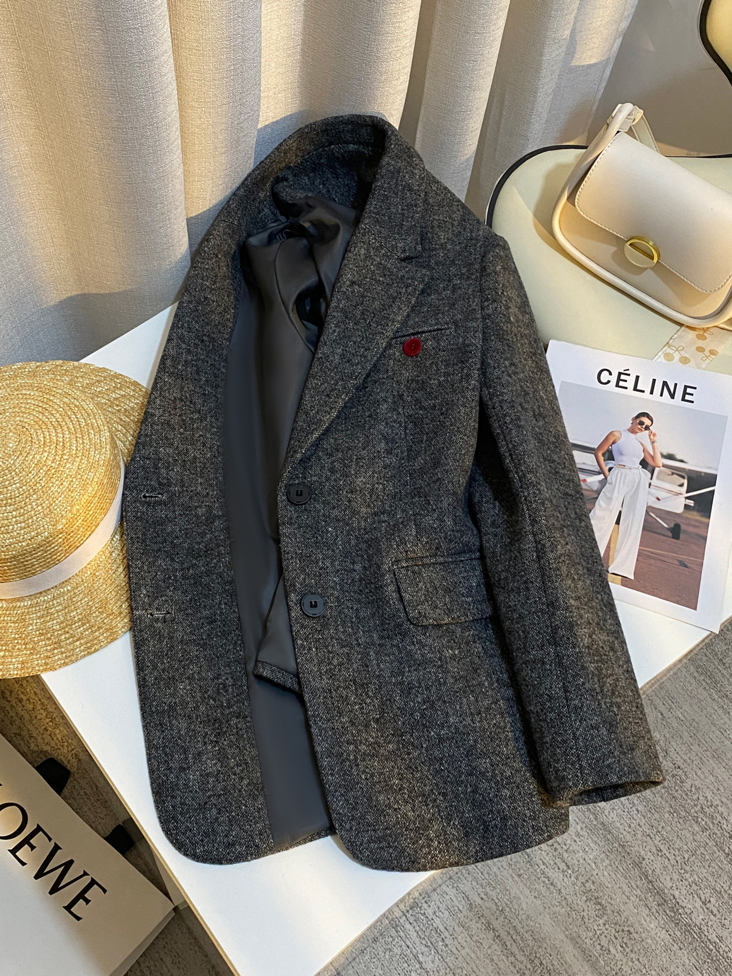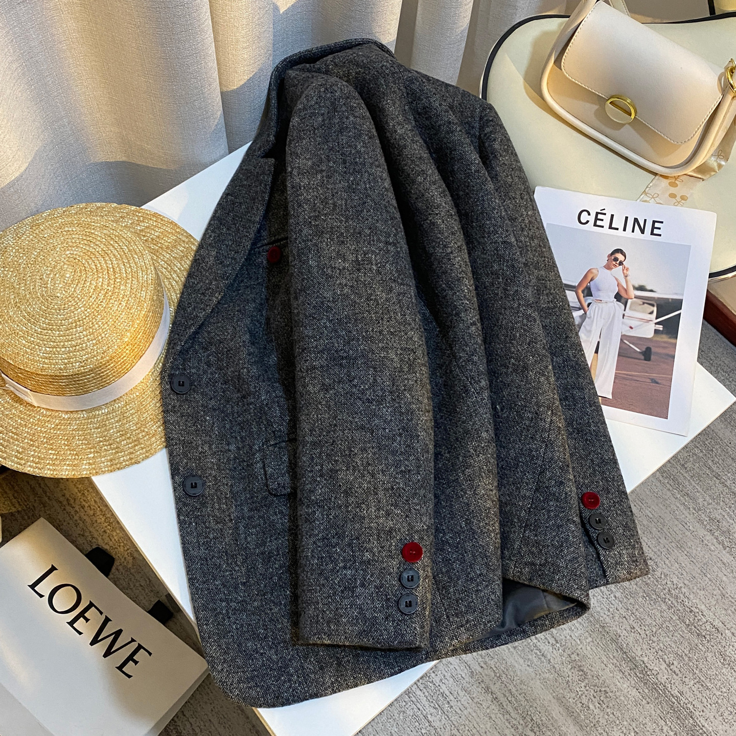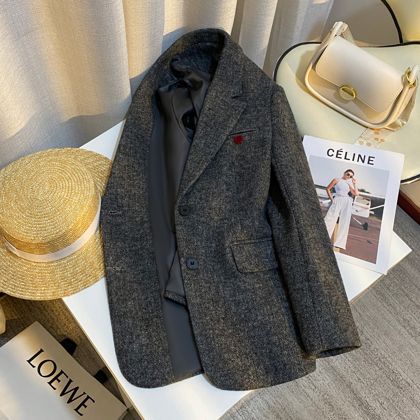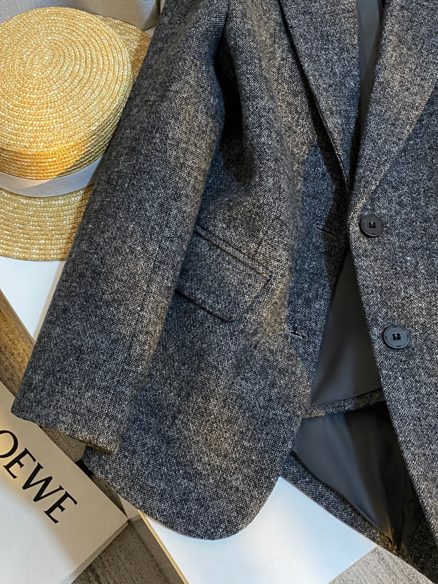 灰色复古高级感人字纹毛呢西装外套女2025秋冬新款慵懒风通勤西服