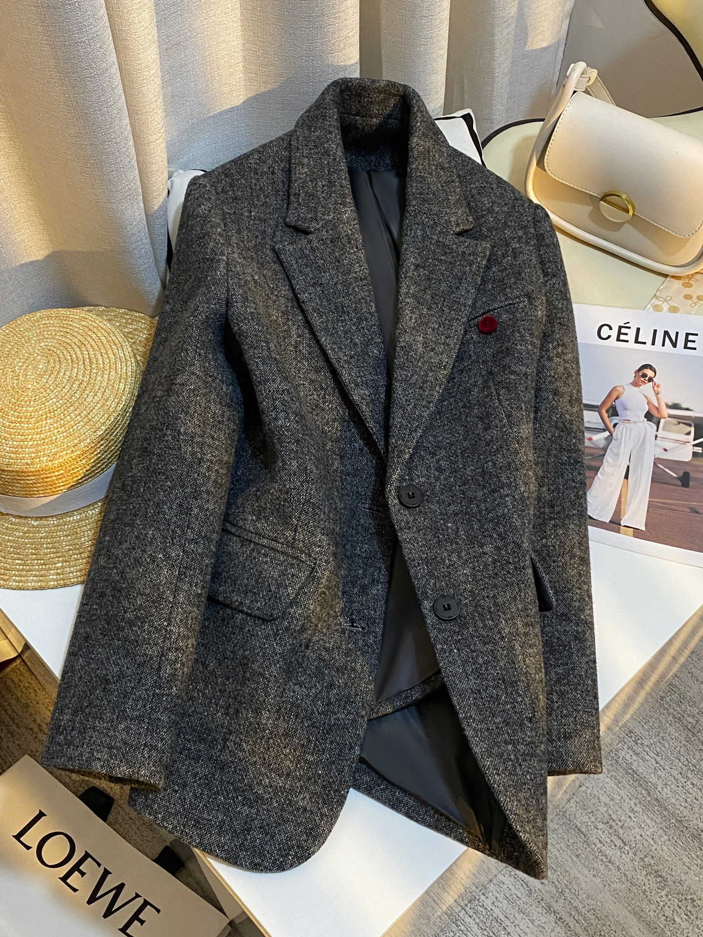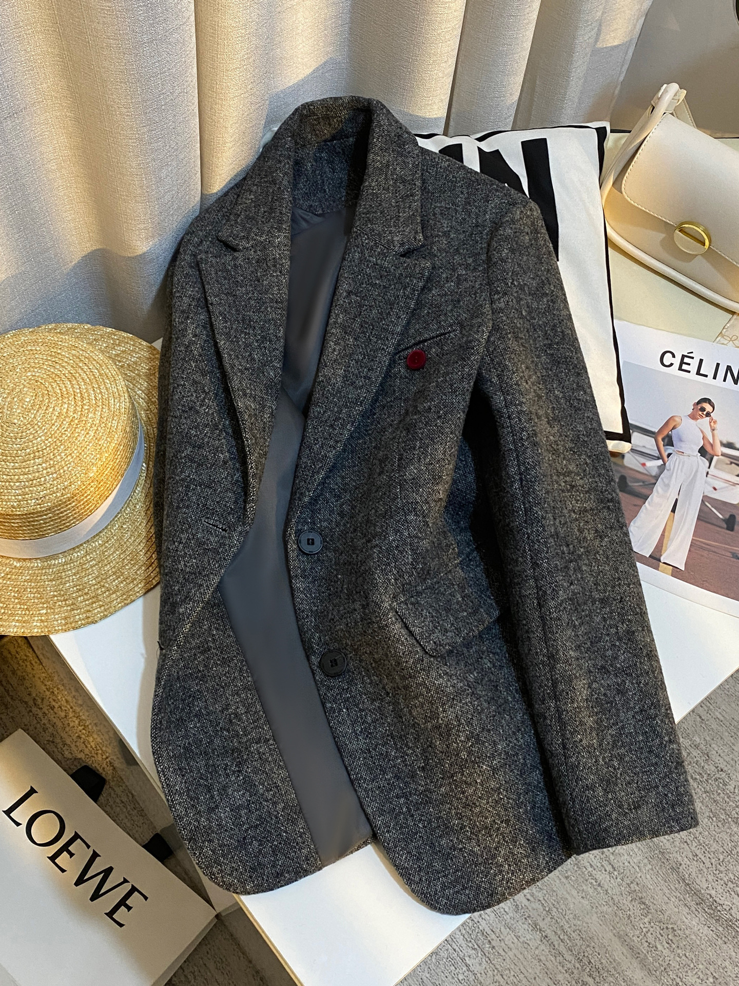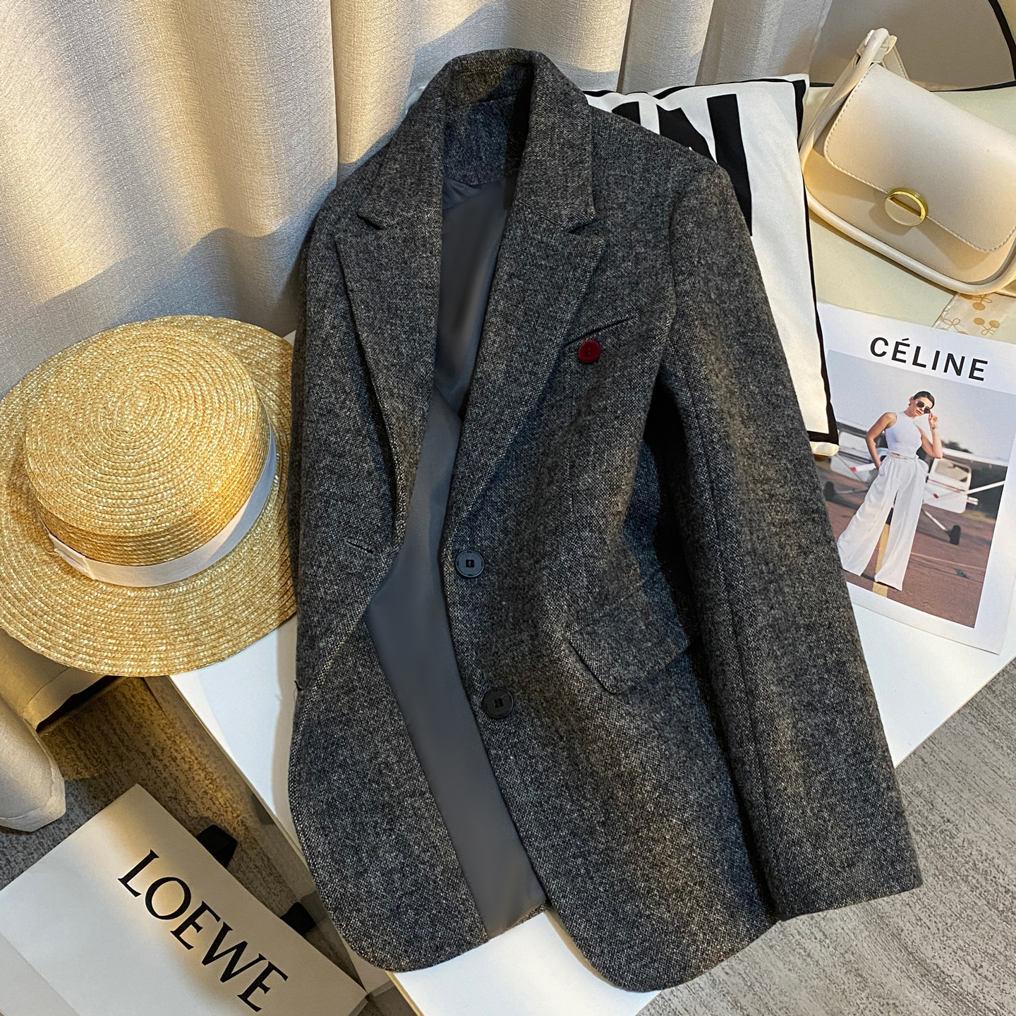 灰色复古高级感人字纹毛呢西装外套女2025秋冬新款慵懒风通勤西服