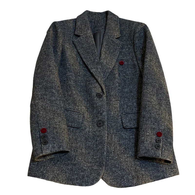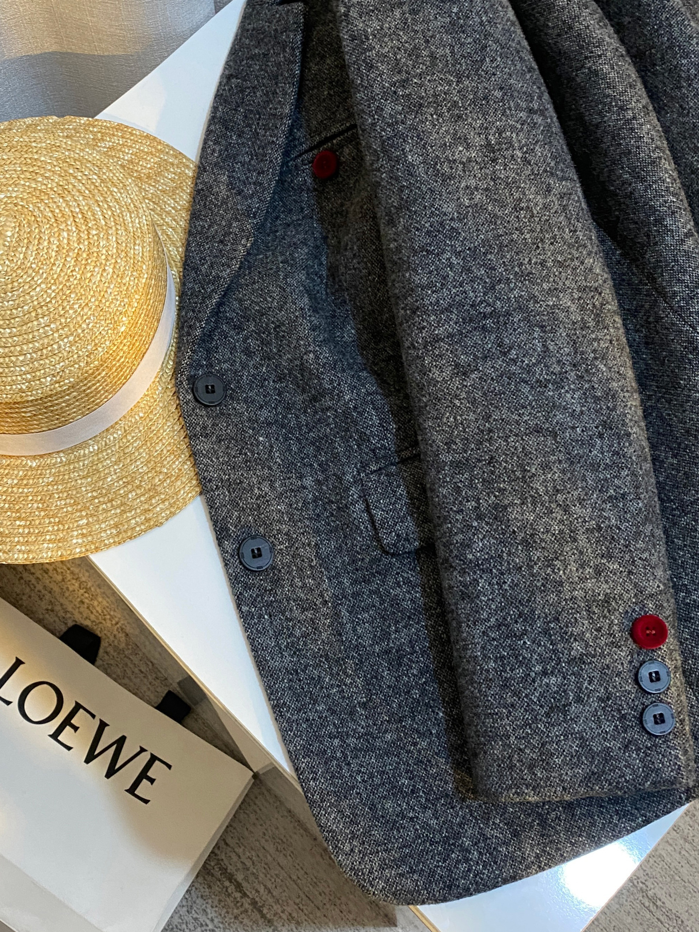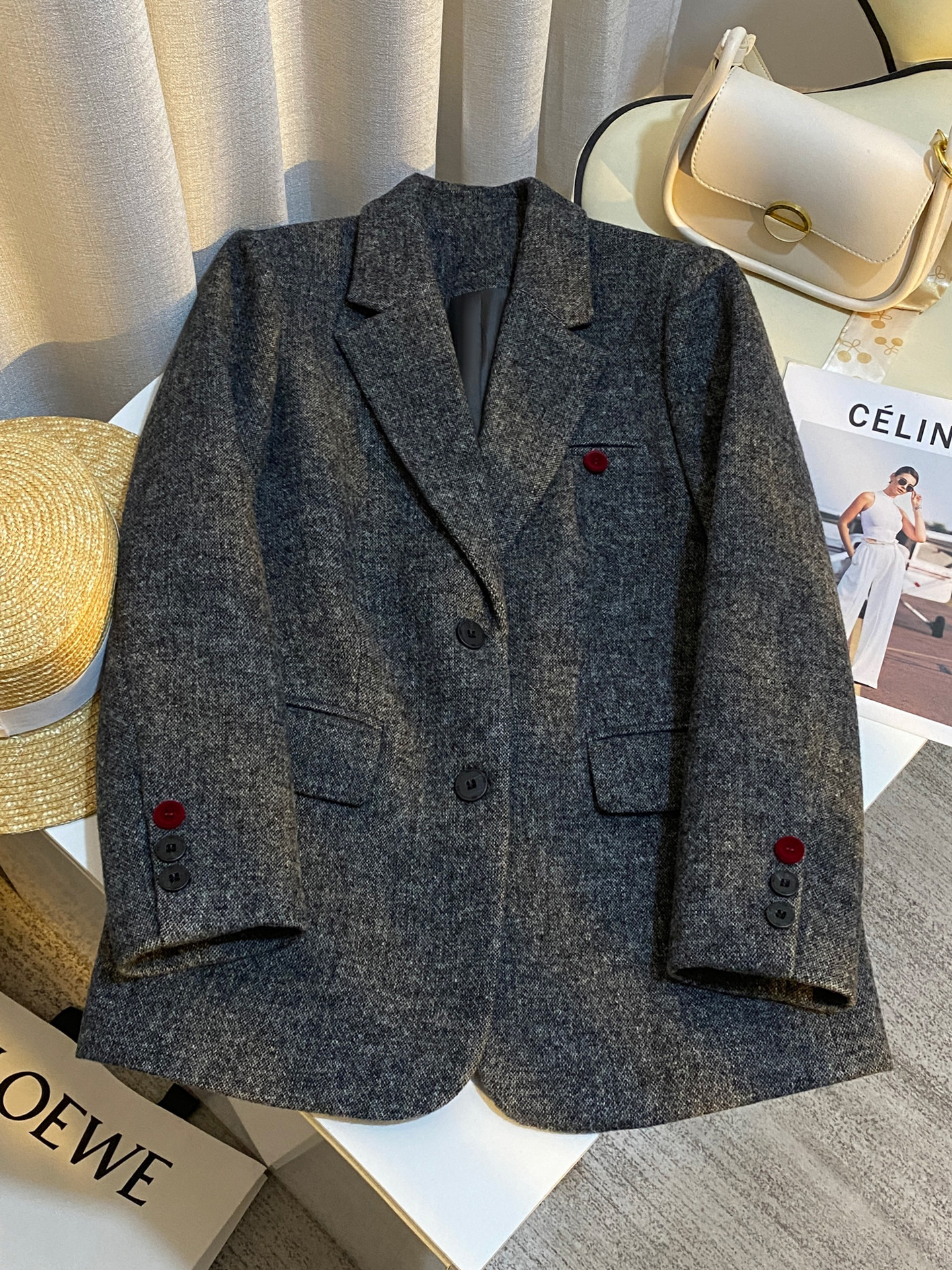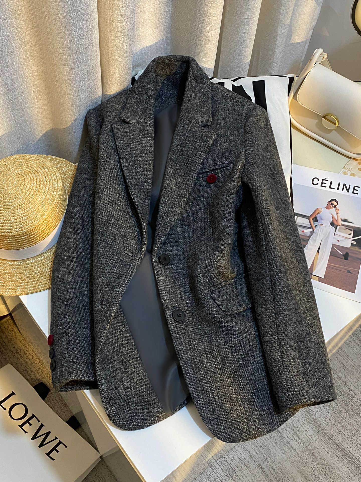 灰色复古高级感人字纹毛呢西装外套女2025秋冬新款慵懒风通勤西服