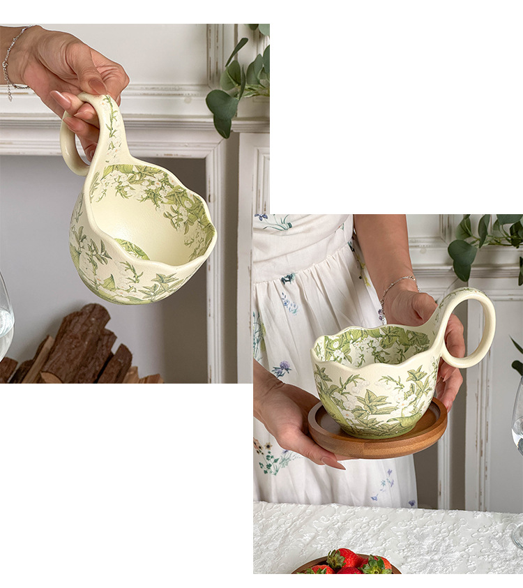 陶瓷马克杯曲把杯带勺早餐杯燕麦碗加热牛奶铃兰花开咖啡杯碟