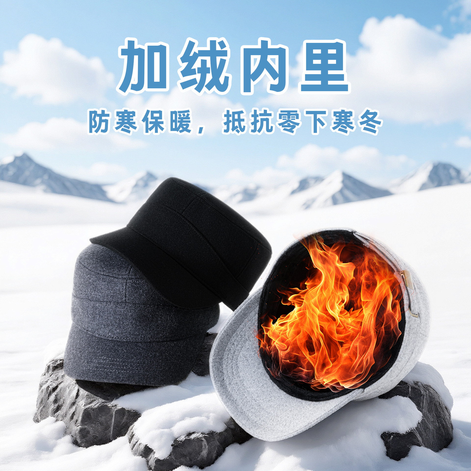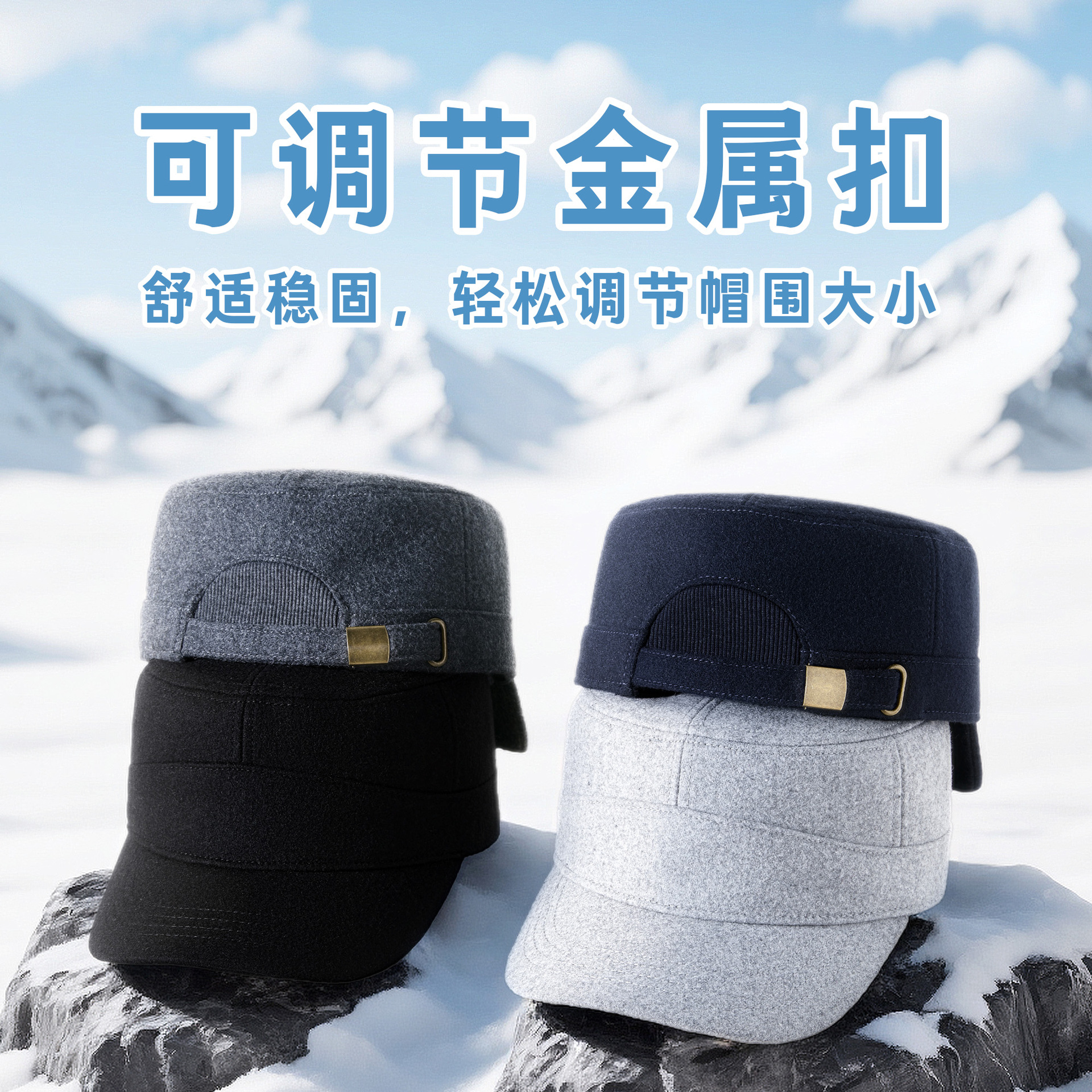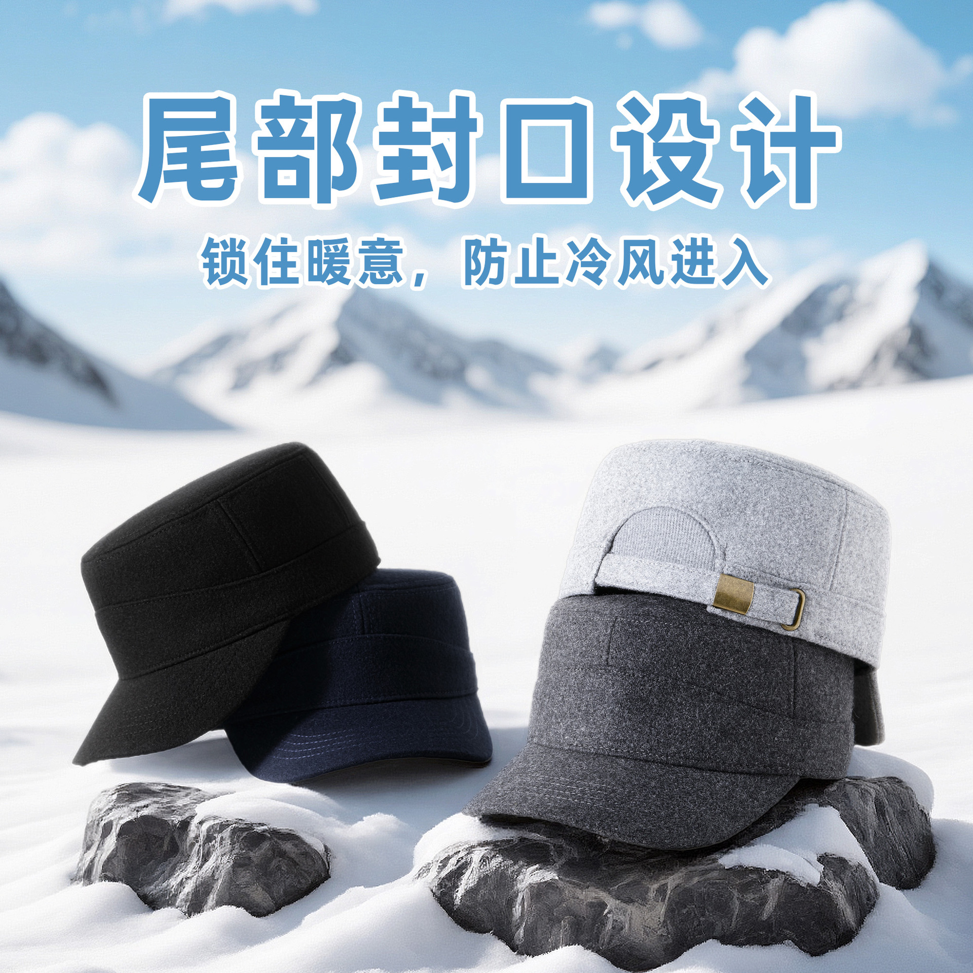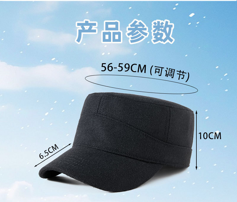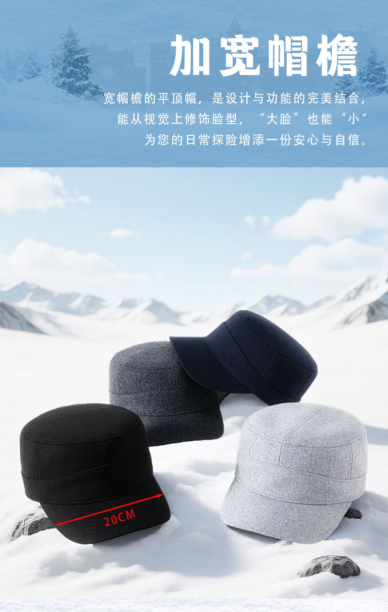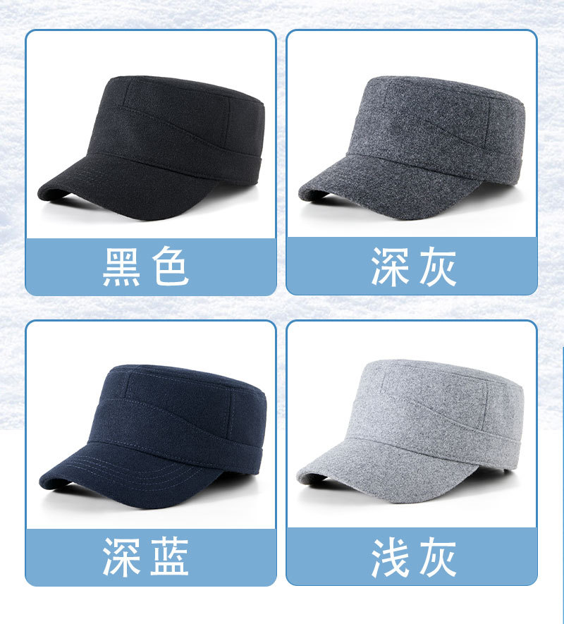 新款冬季羊毛呢帽子加绒加厚平顶帽男后封口中老年户外保暖鸭舌帽