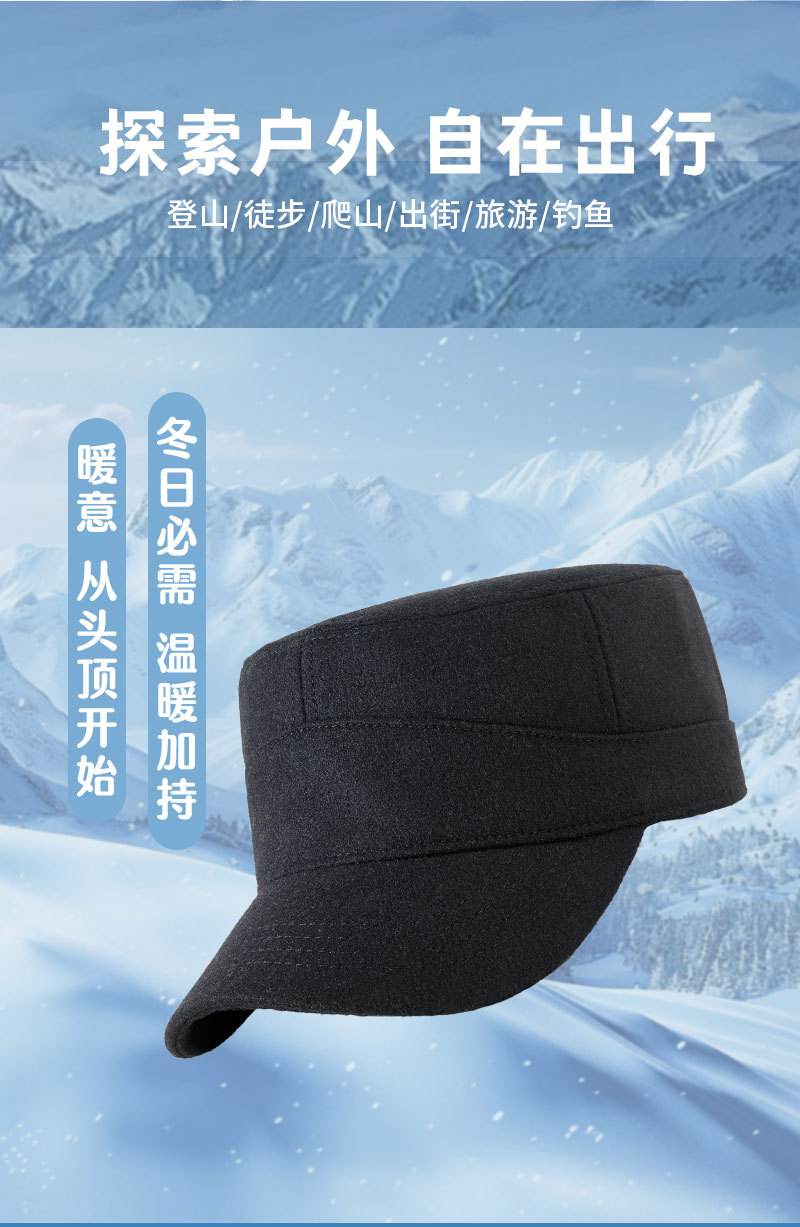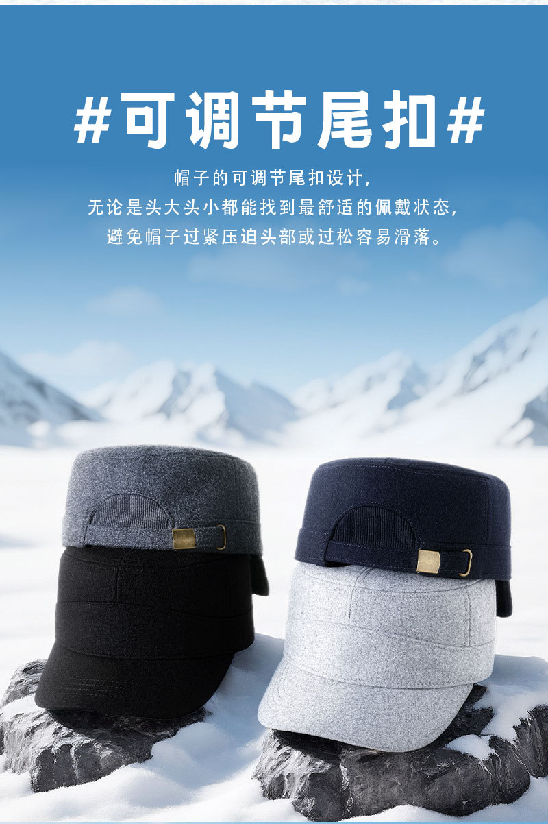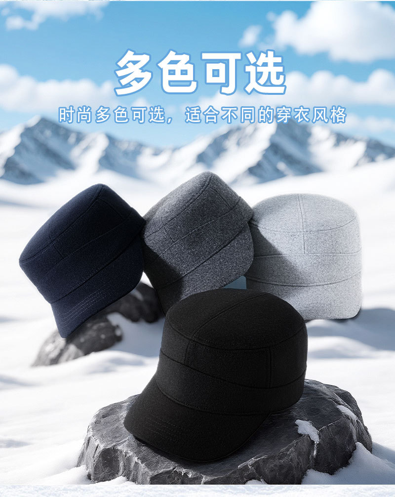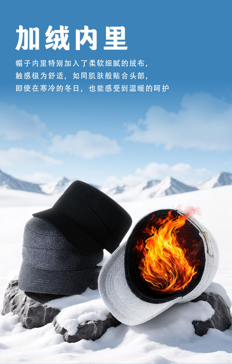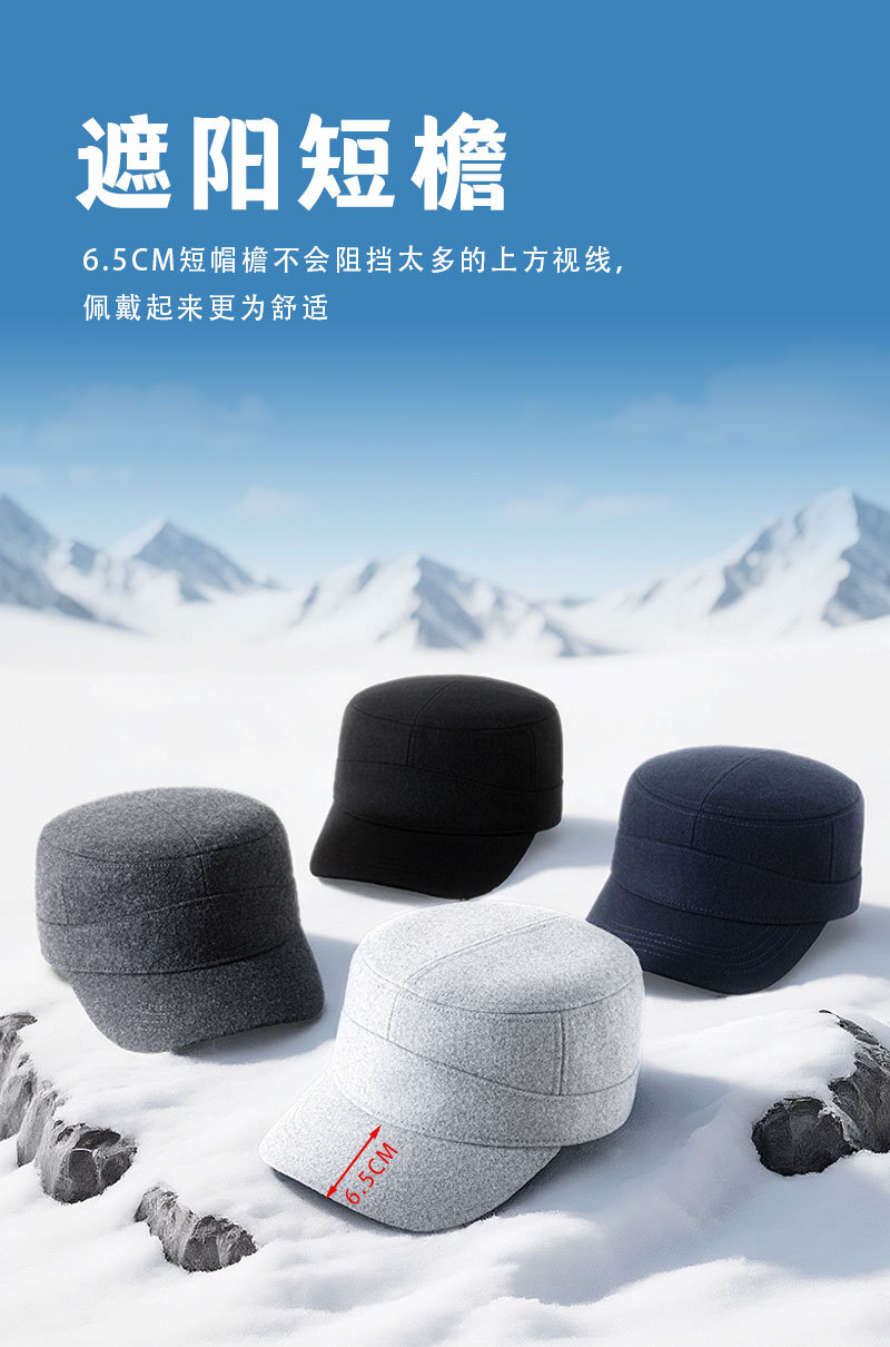新款冬季羊毛呢帽子加绒加厚平顶帽男后封口中老年户外保暖鸭舌帽