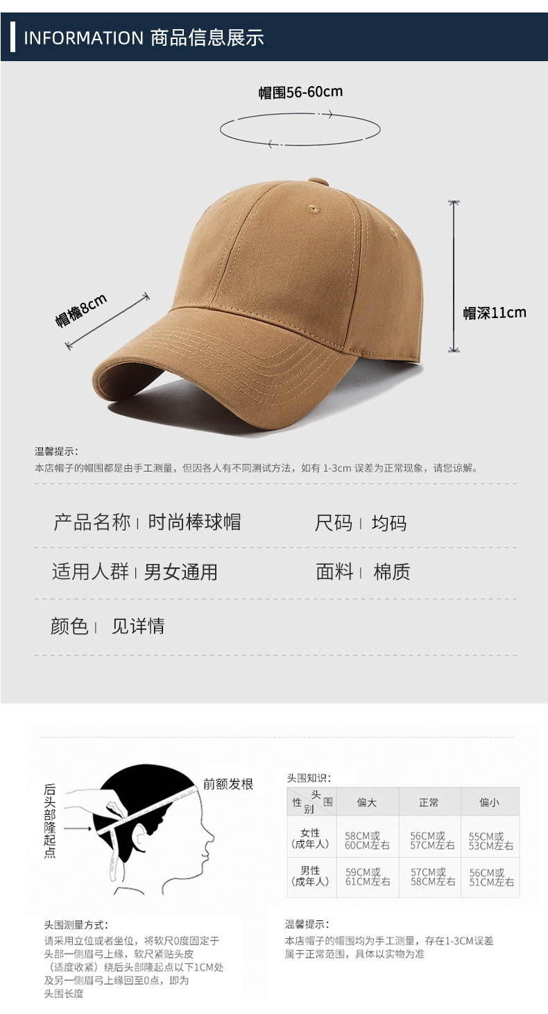 纯棉软顶纯色光板棒球帽鸭舌帽女显脸小加大加深宽帽檐棒球帽男士