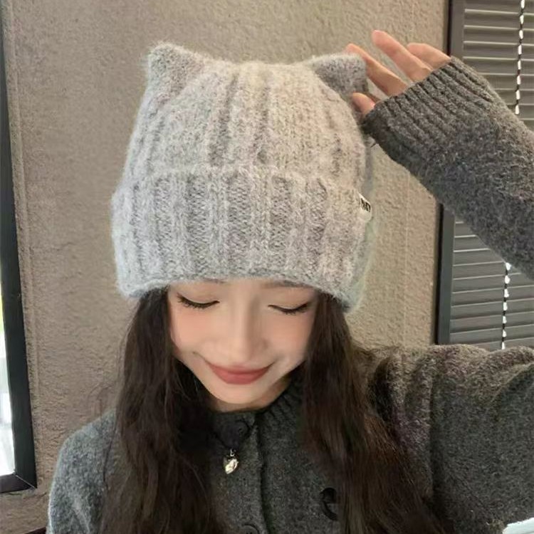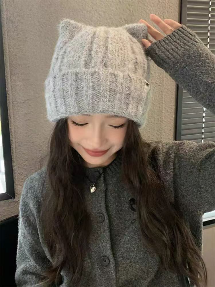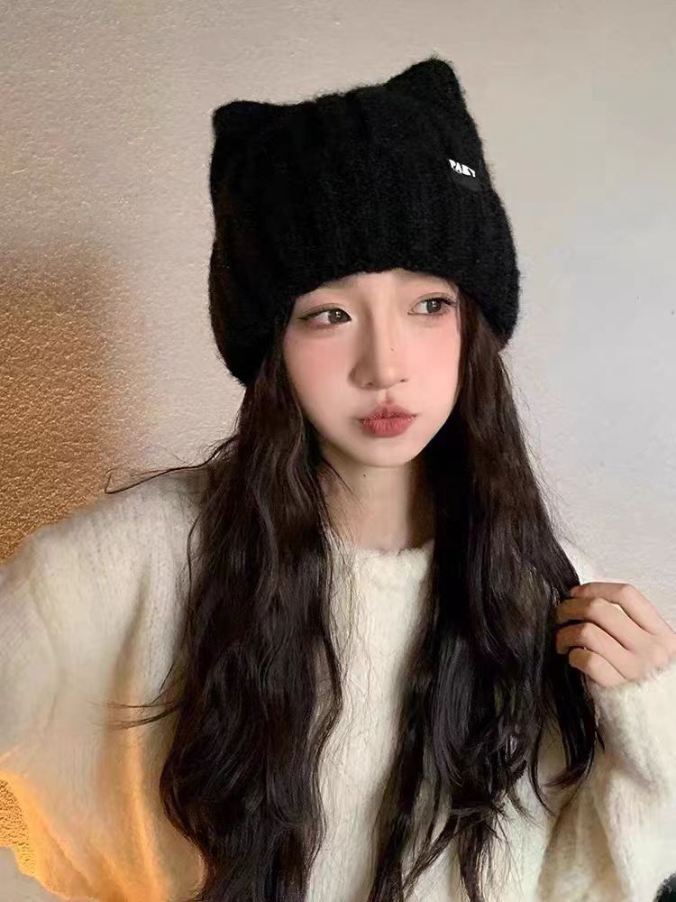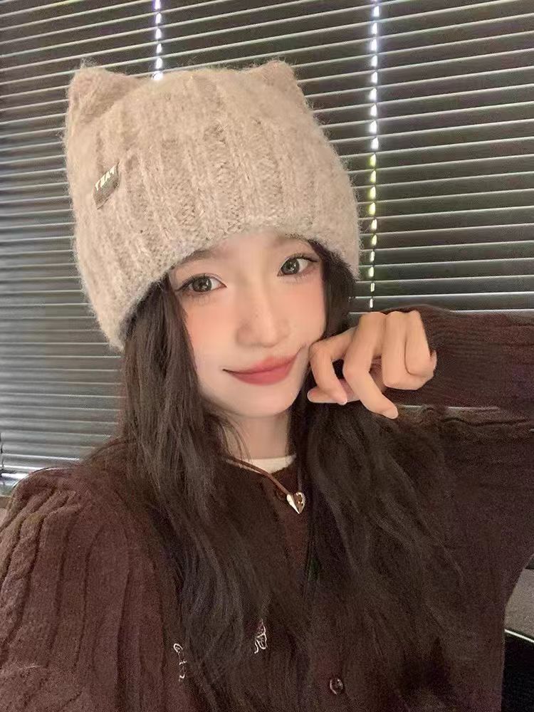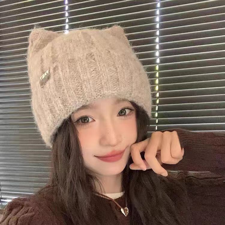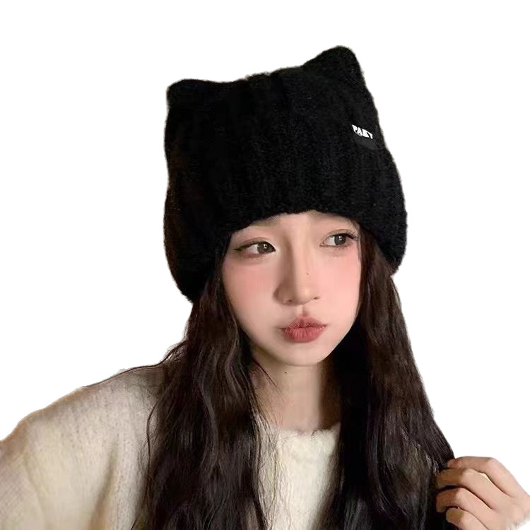 韩版秋冬针织帽子女时尚字母标可爱猫耳朵毛线帽保暖显脸小套头帽