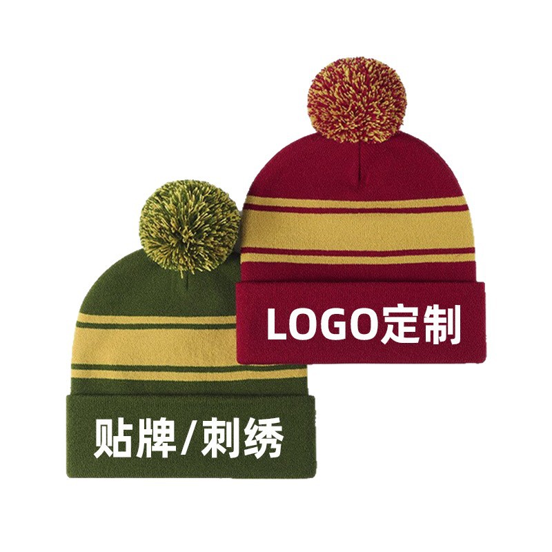 欧美大头围保暖帽针织提花帽男女针织帽户外拼色毛球毛线帽子腈纶