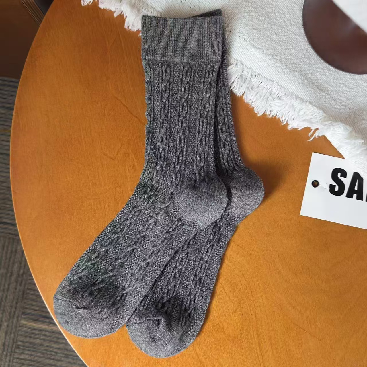 袜子女秋冬季中筒棉袜加厚麻花长袜纯白色女士棉袜初春长筒月子袜