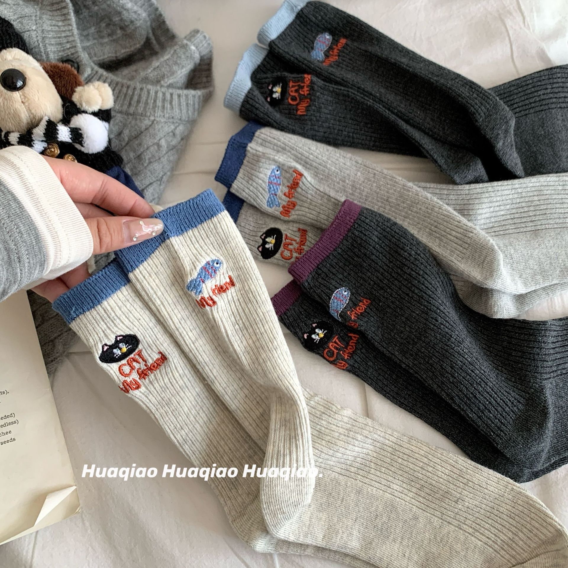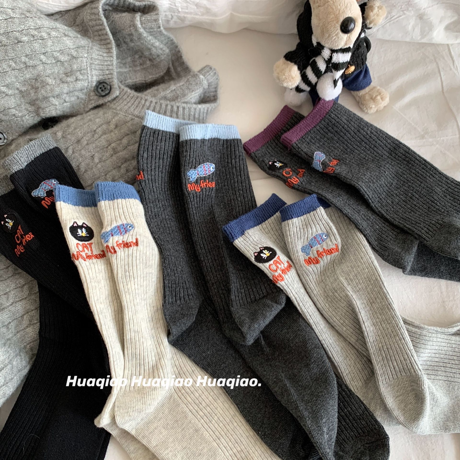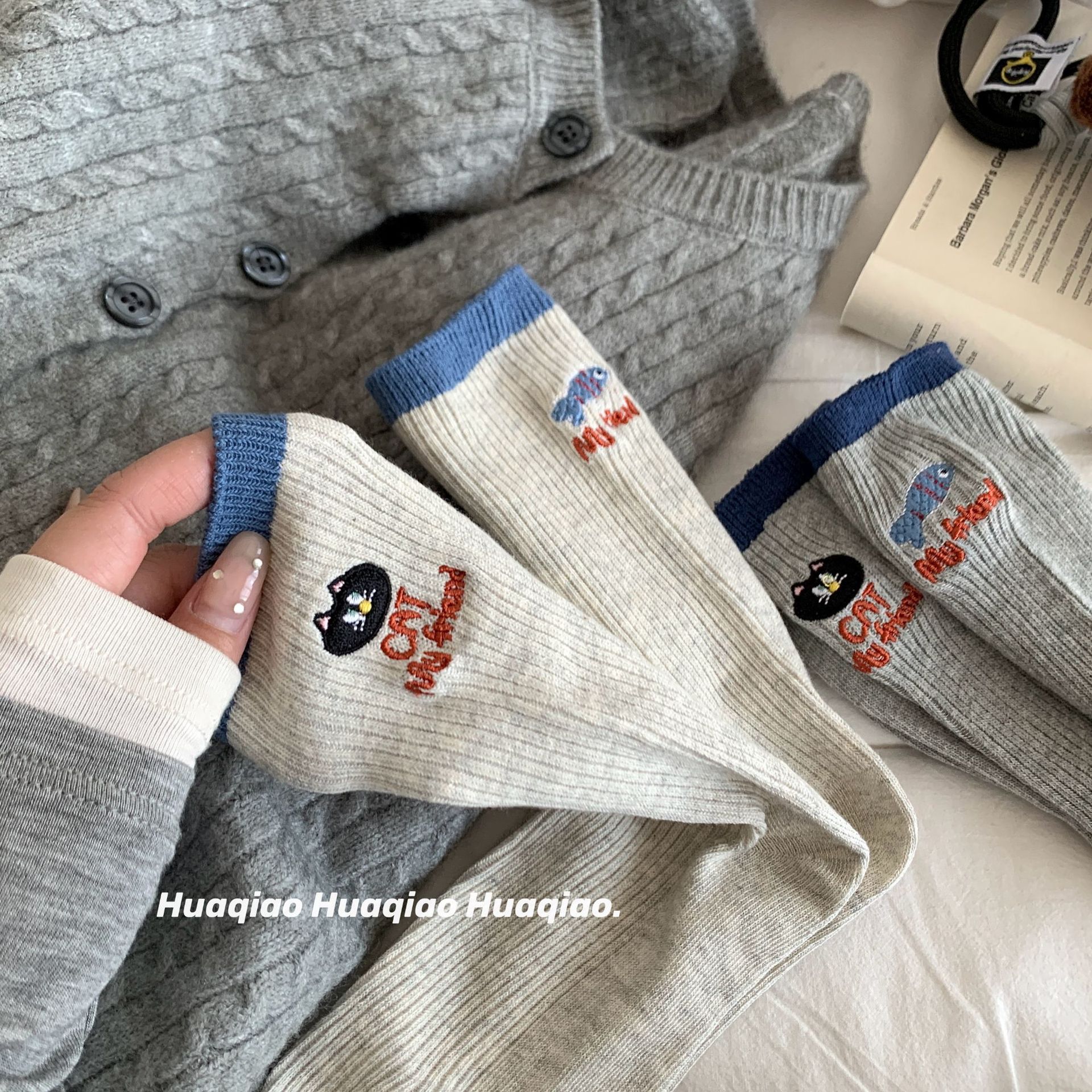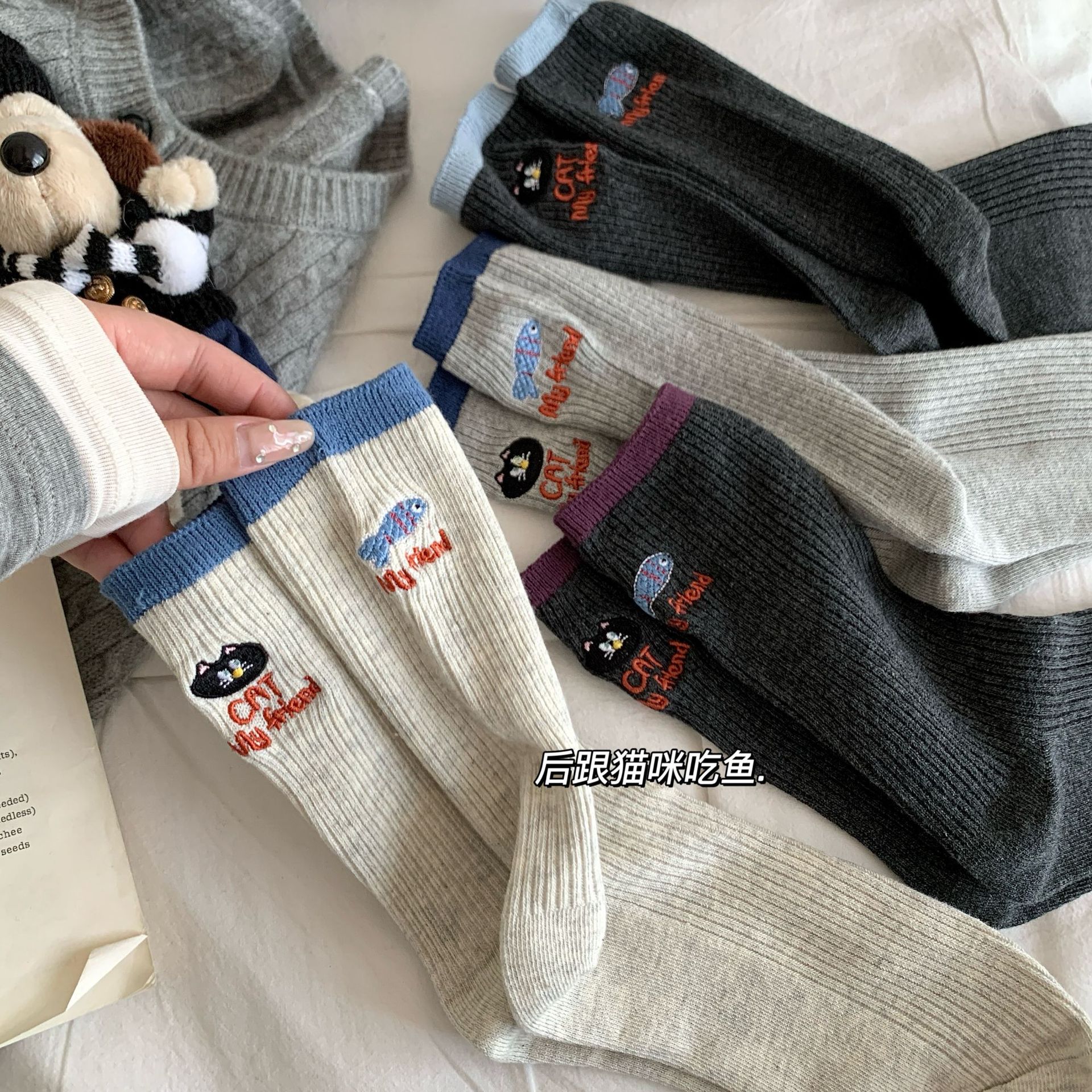 “猫吃鱼AB款”早秋袜子刺绣卡通字母中筒袜韩系拼色双针棉堆堆袜