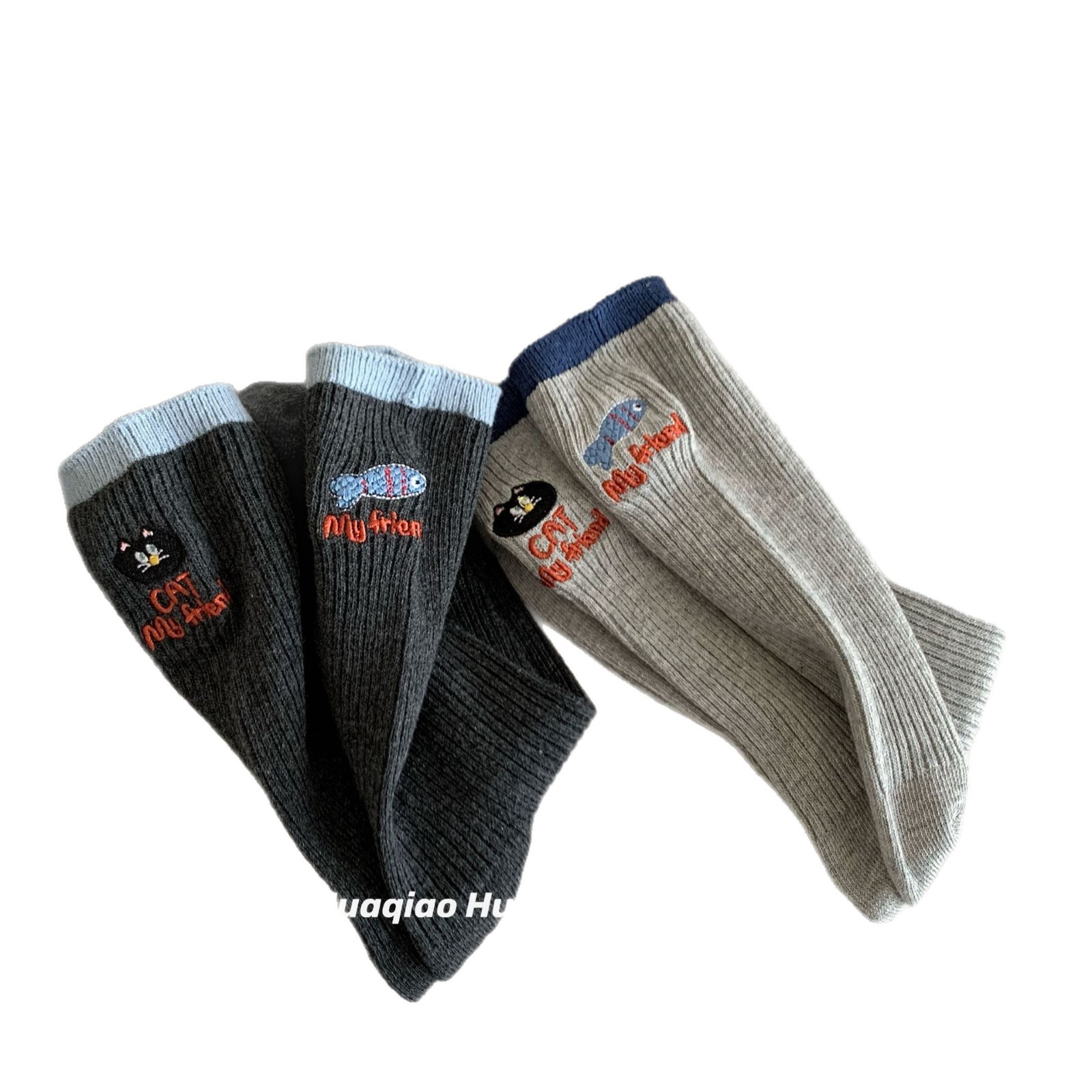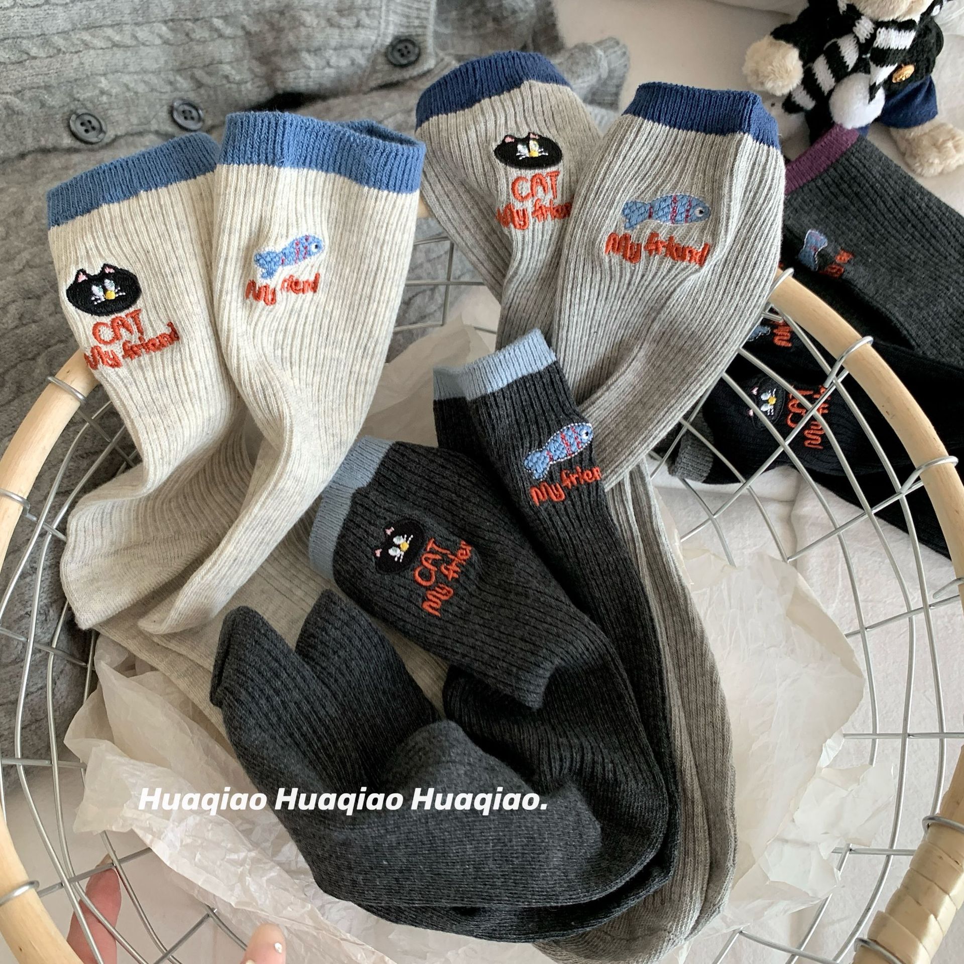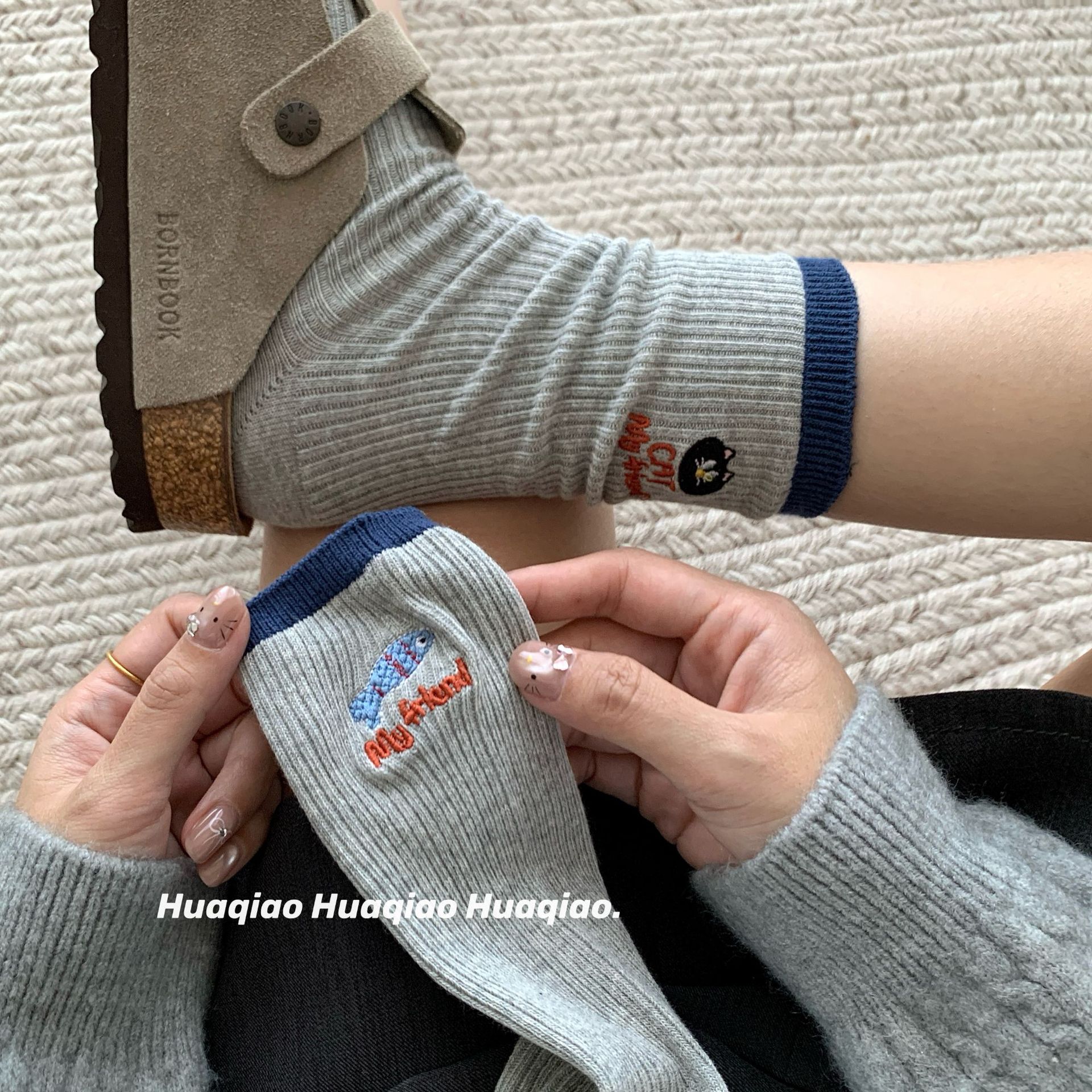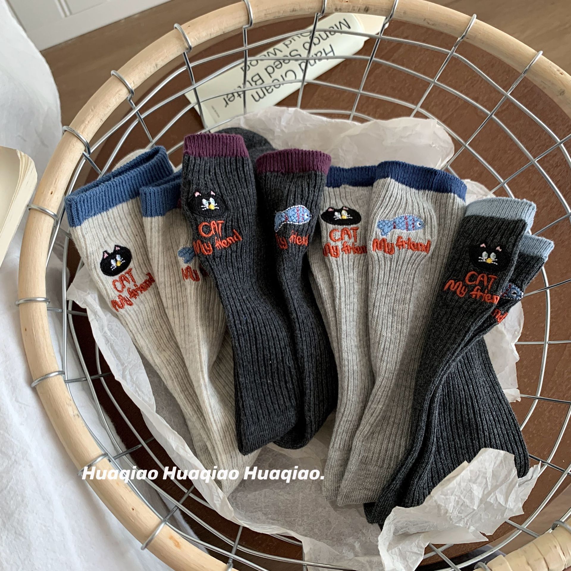 “猫吃鱼AB款”早秋袜子刺绣卡通字母中筒袜韩系拼色双针棉堆堆袜