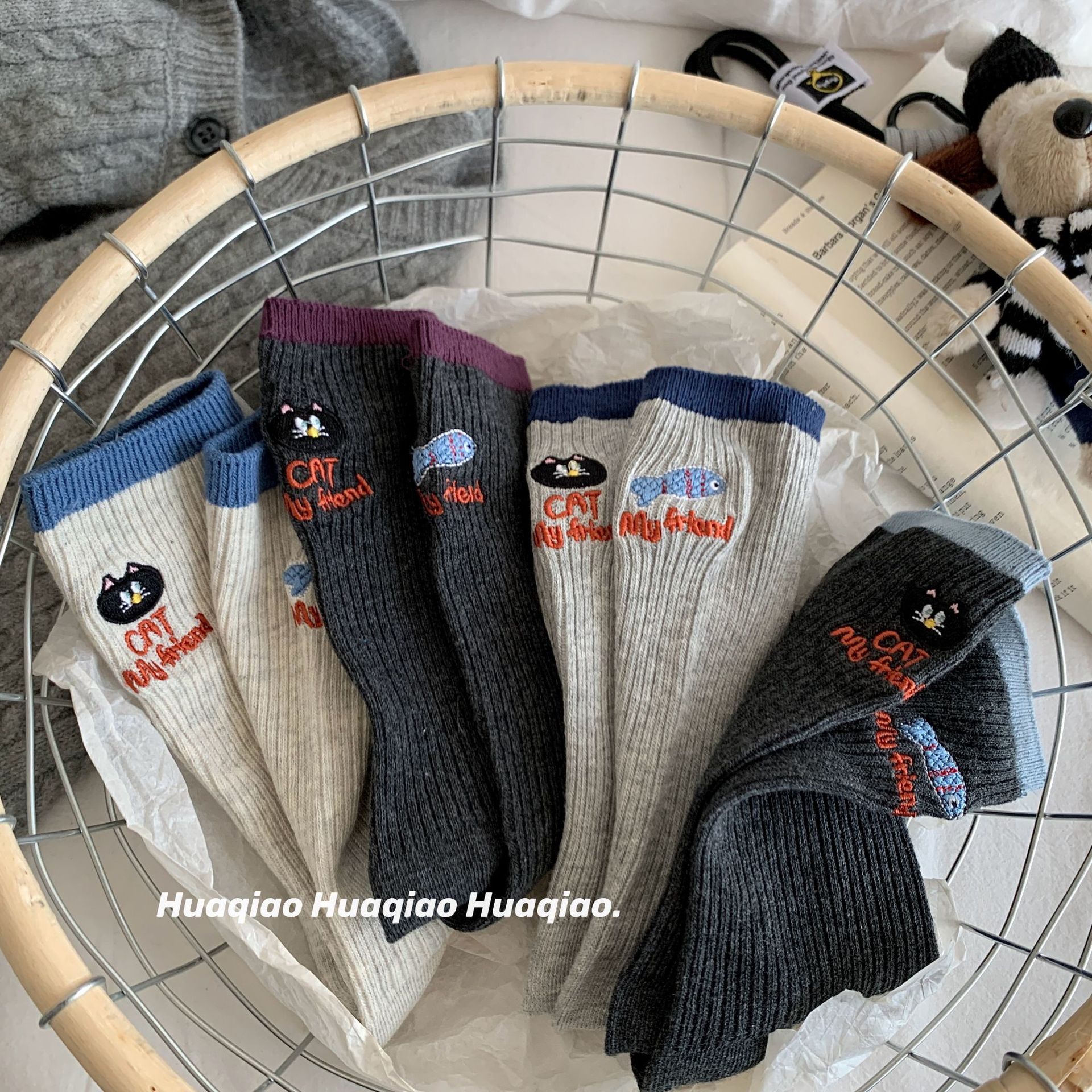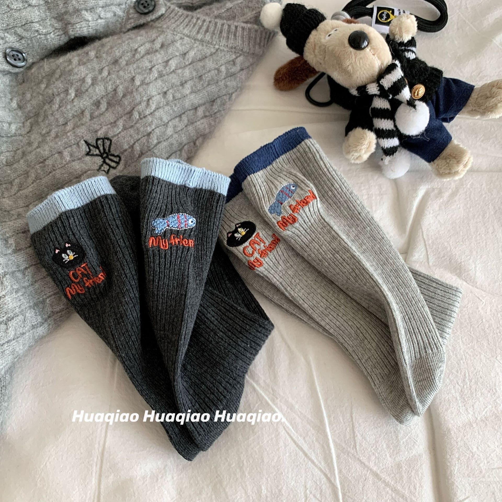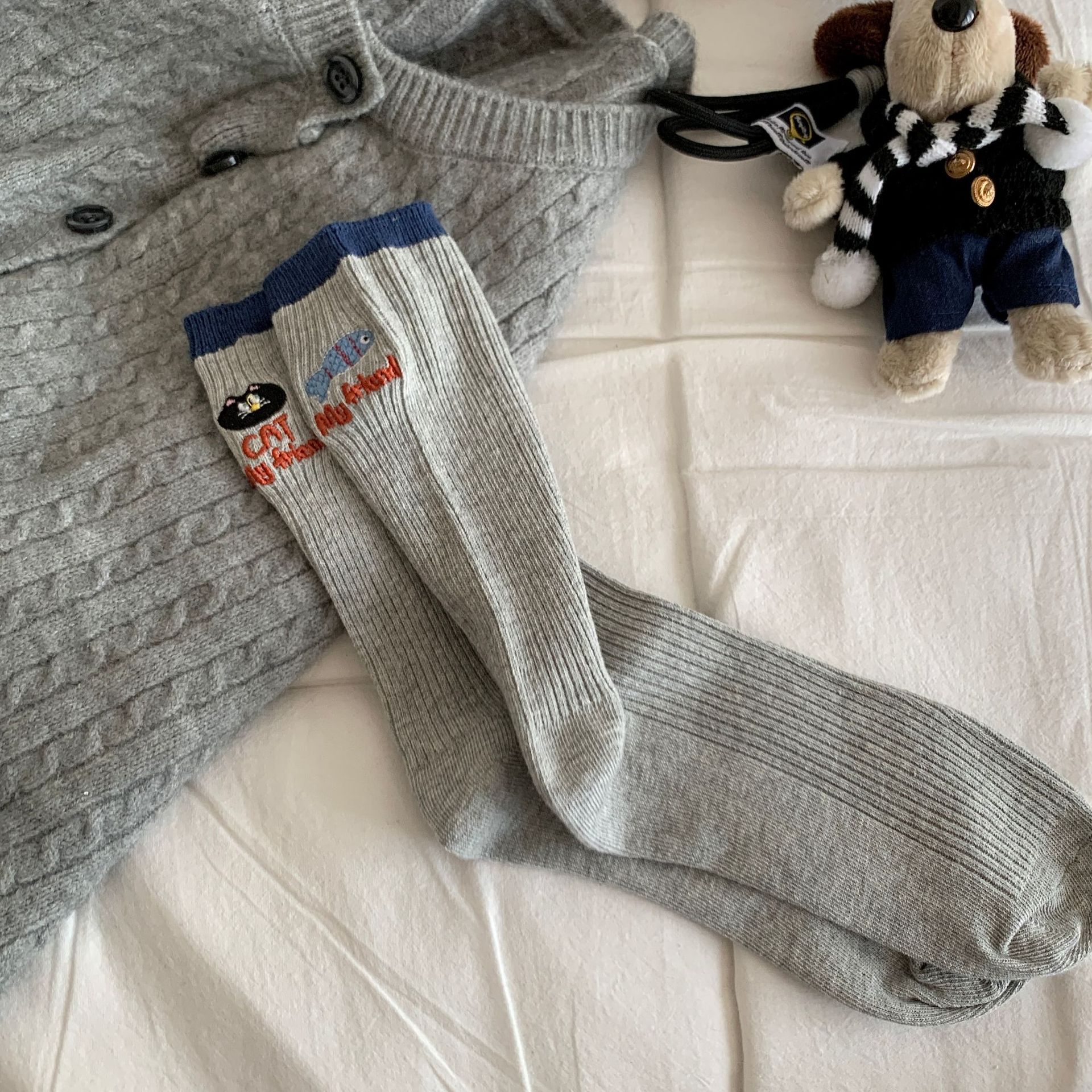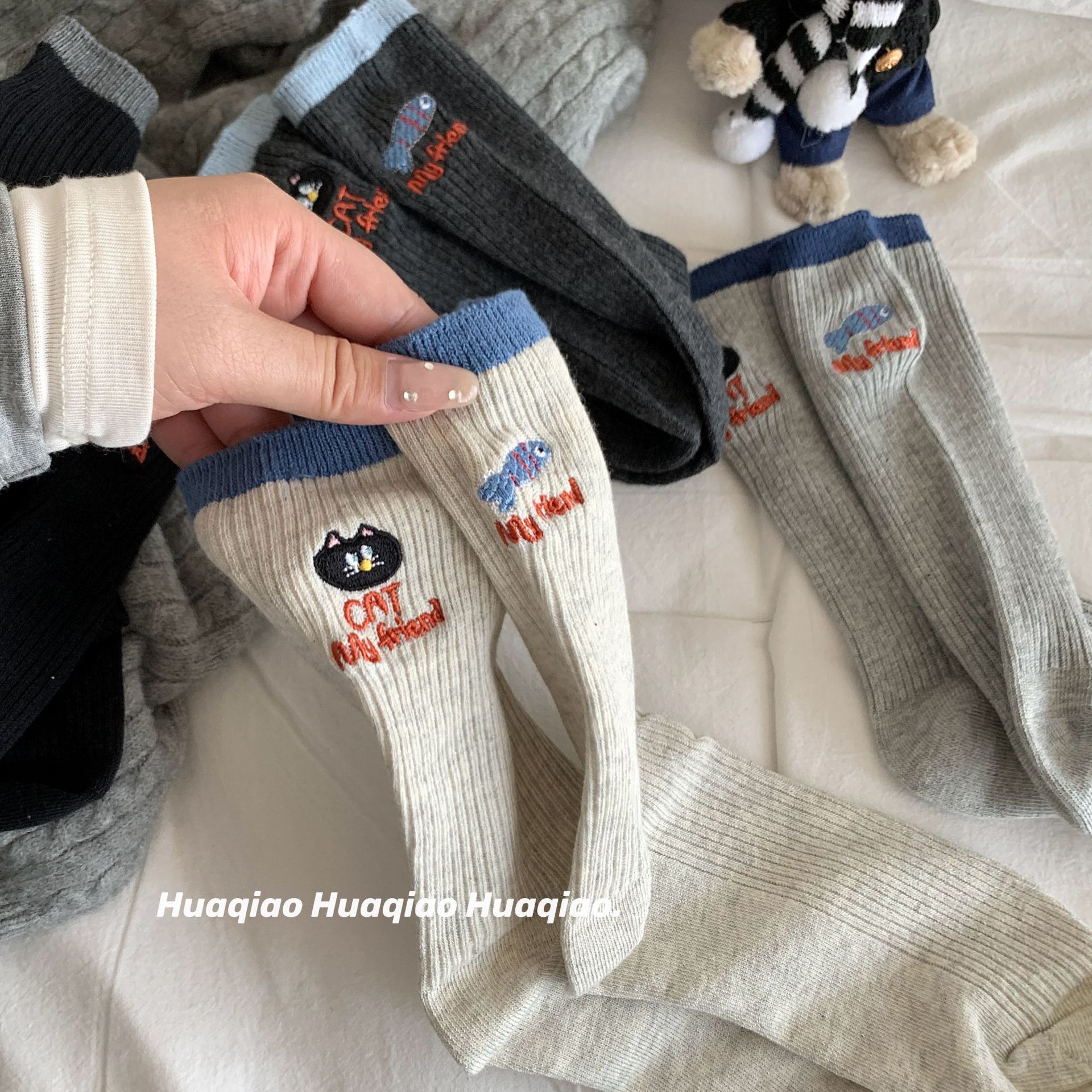 “猫吃鱼AB款”早秋袜子刺绣卡通字母中筒袜韩系拼色双针棉堆堆袜