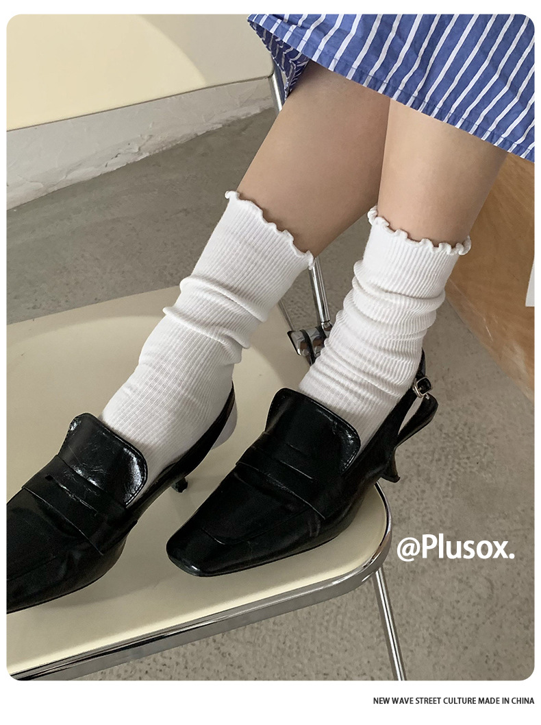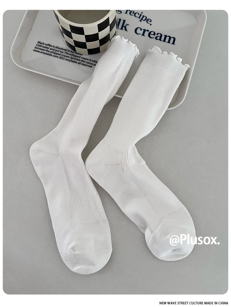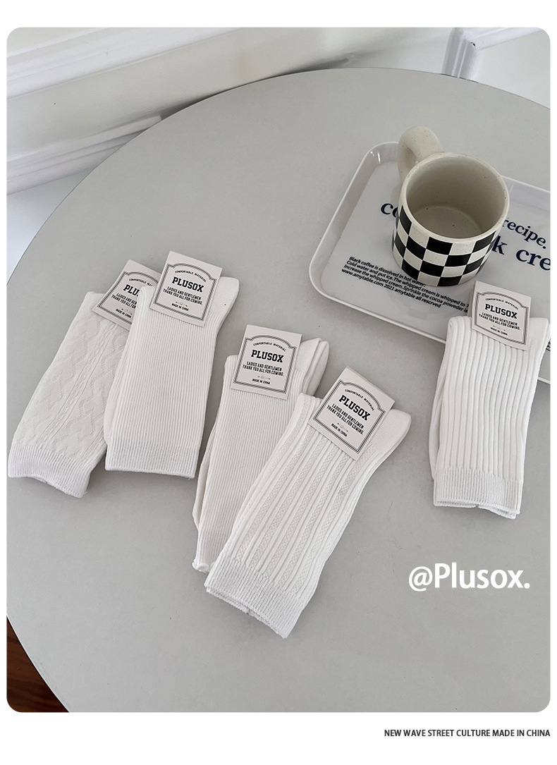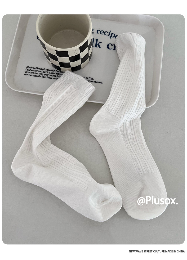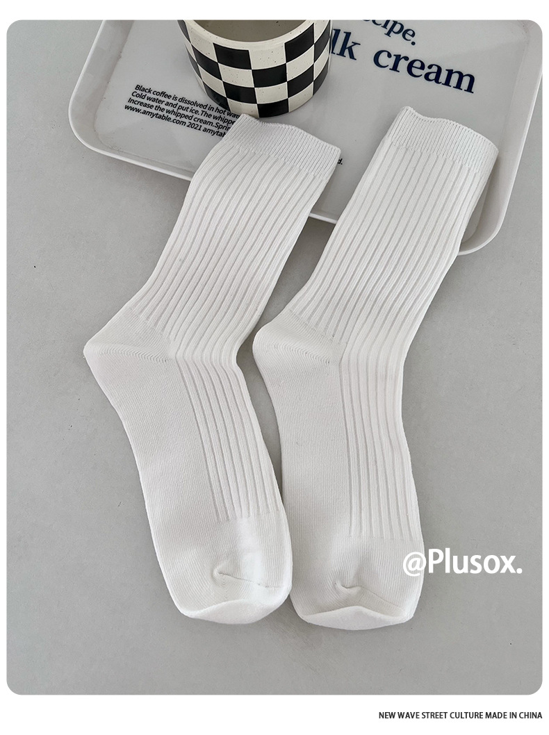 Plusox日系螺纹白袜子时尚百搭纯色袜子女夏季黑白堆堆棉袜女批发
