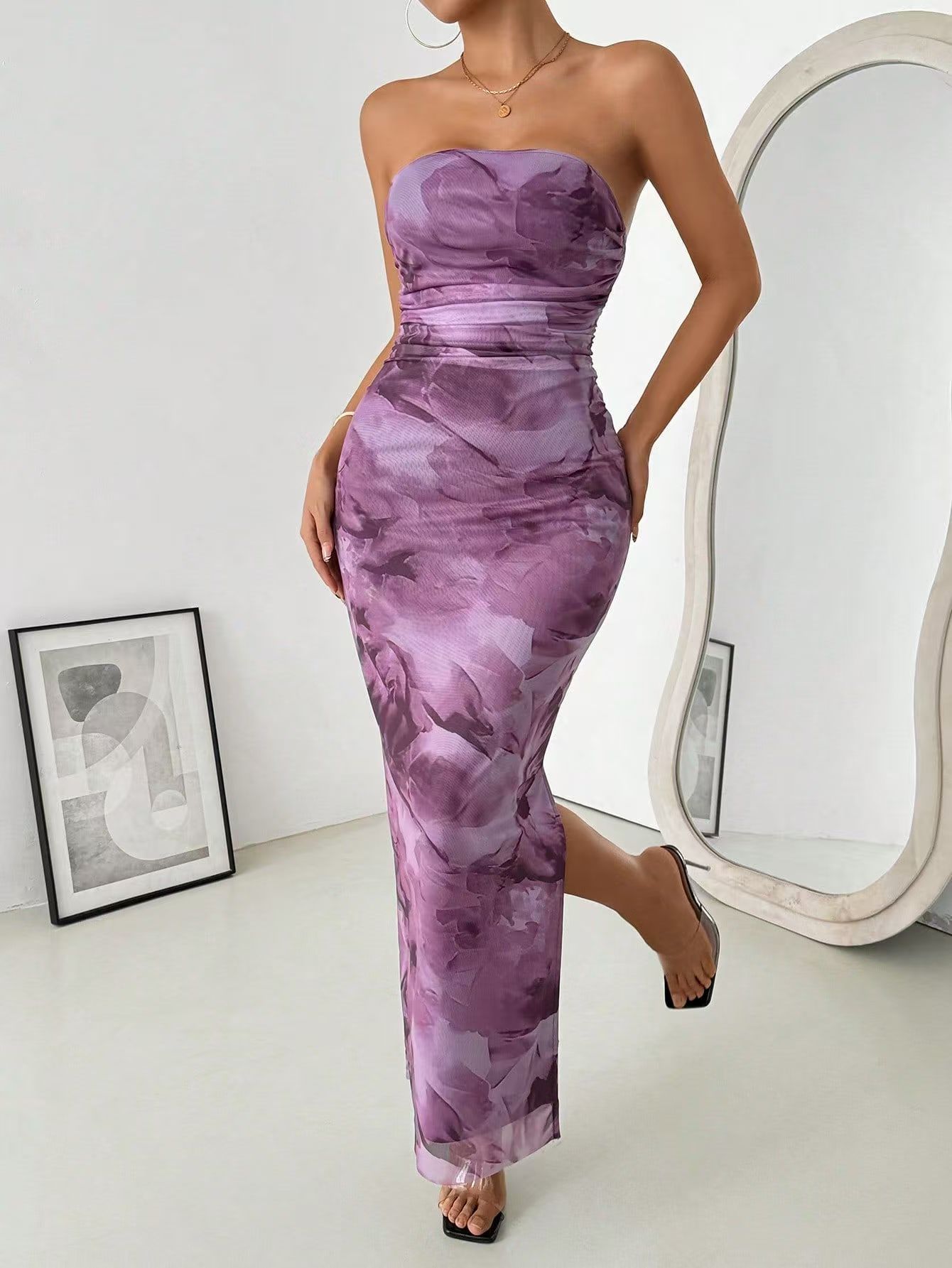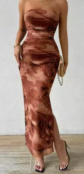 现货跨境2024欧美亚马逊网纱花卉褶饰性感紧身开叉无肩带抹胸长裙