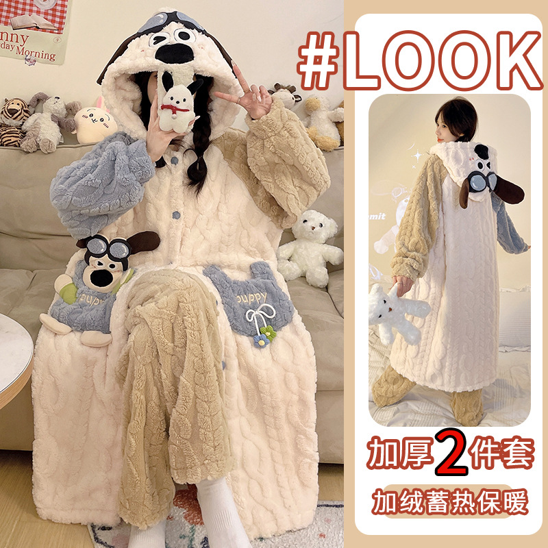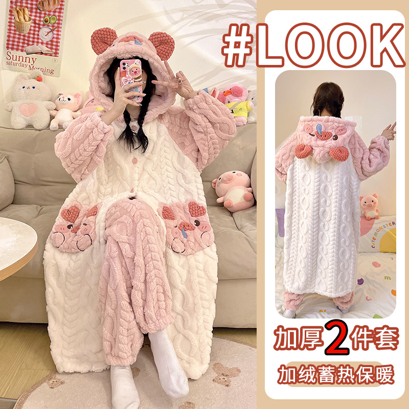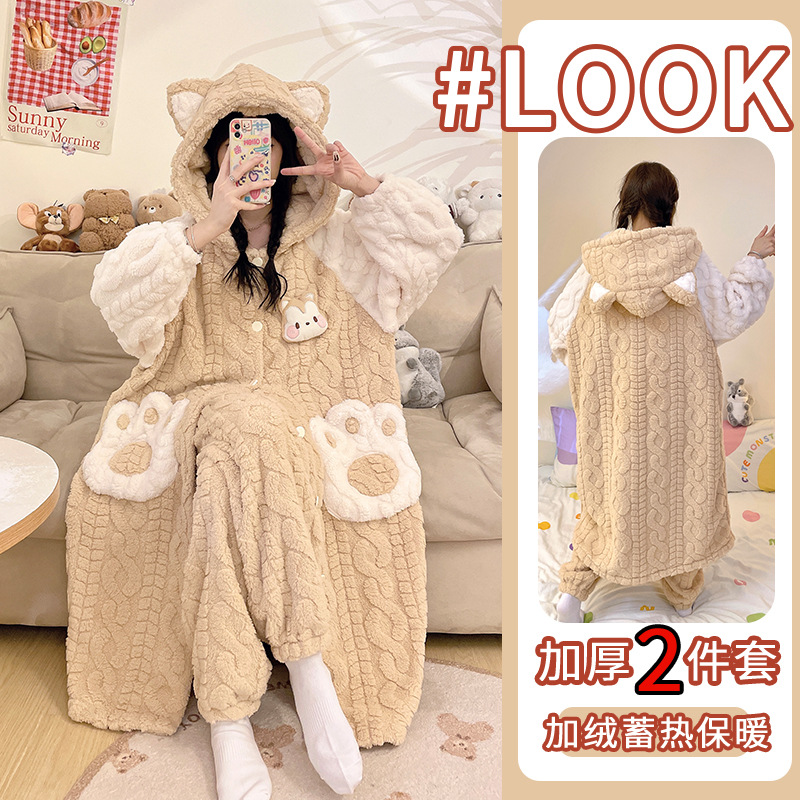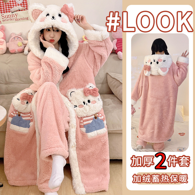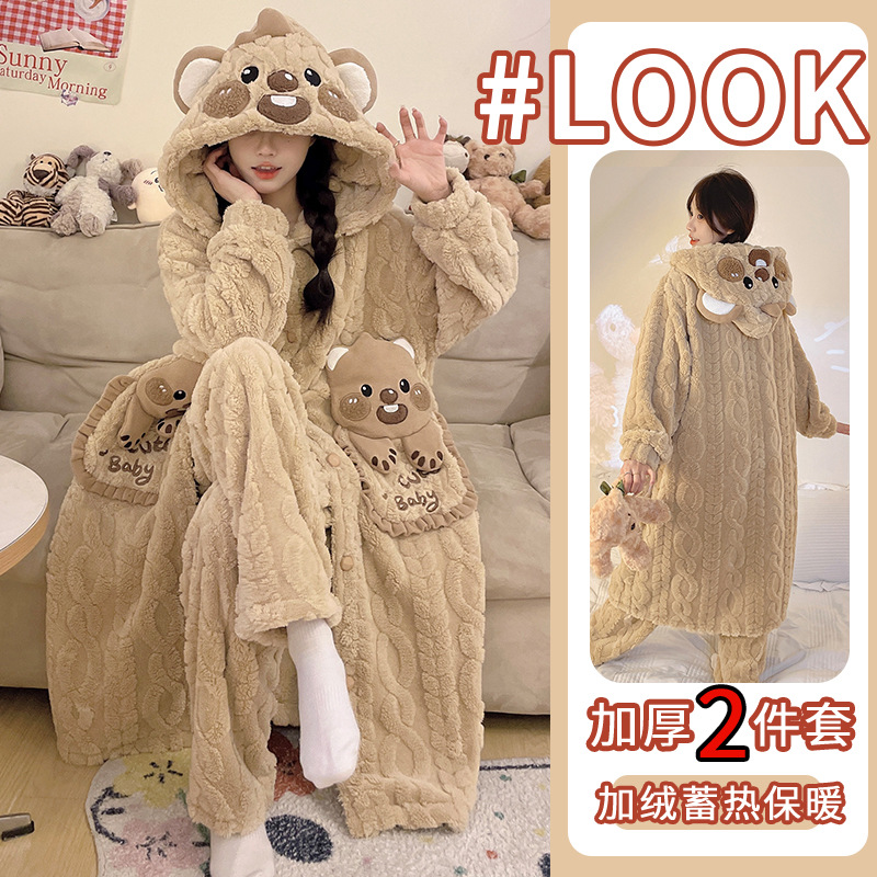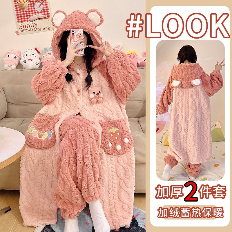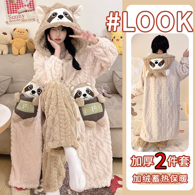 工厂直销珊瑚绒睡袍女秋冬季新款加绒加厚中长款家居服睡衣女套装