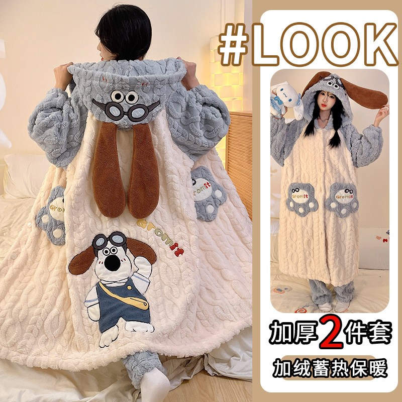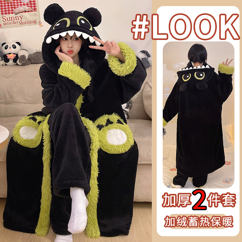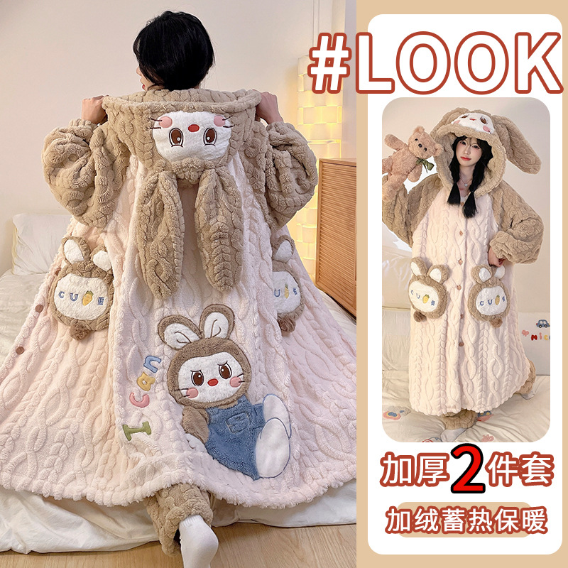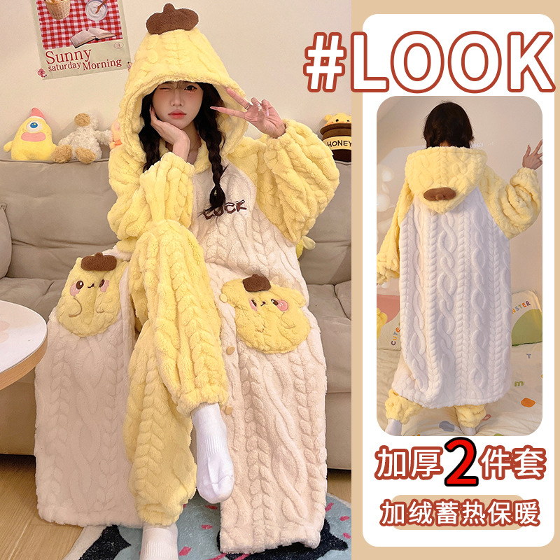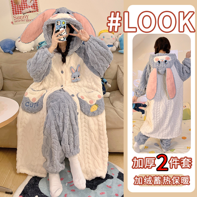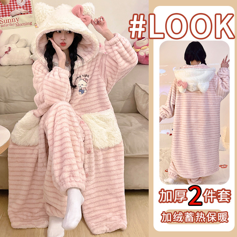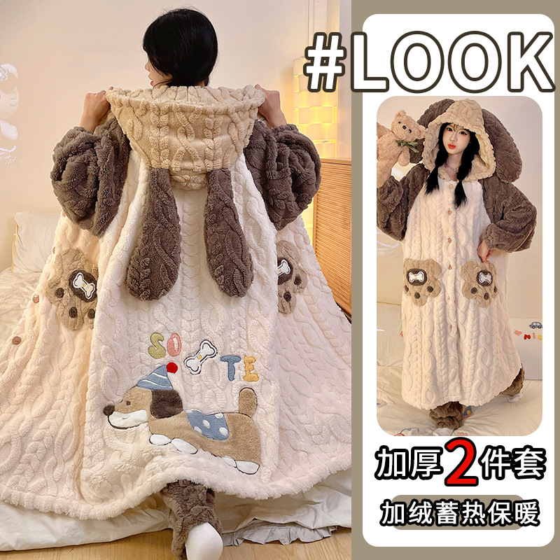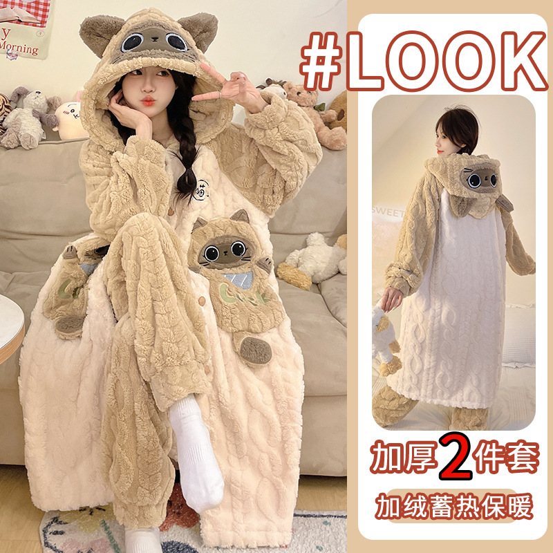 工厂直销珊瑚绒睡袍女秋冬季新款加绒加厚中长款家居服睡衣女套装