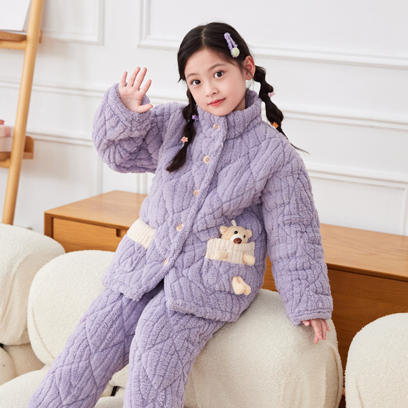 秋冬季儿童睡衣法兰绒三层加厚款夹棉套装宝宝男童女童保暖家居服