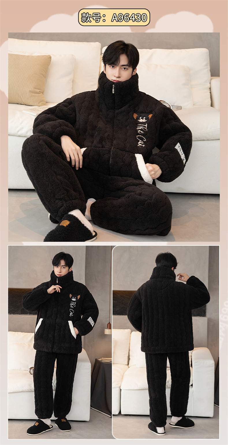 三层夹棉男士睡衣冬季加厚珊瑚绒袄高领拉链保暖可外穿家居服套装