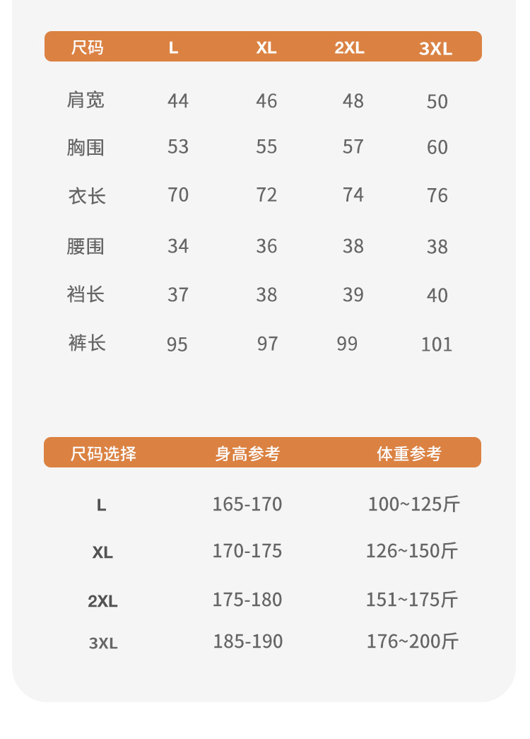 | 2XL(151~170斤) | USD $33.61 | 50 set available |