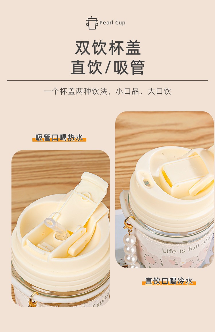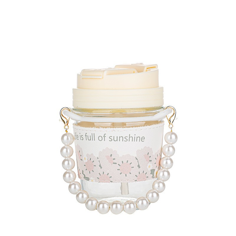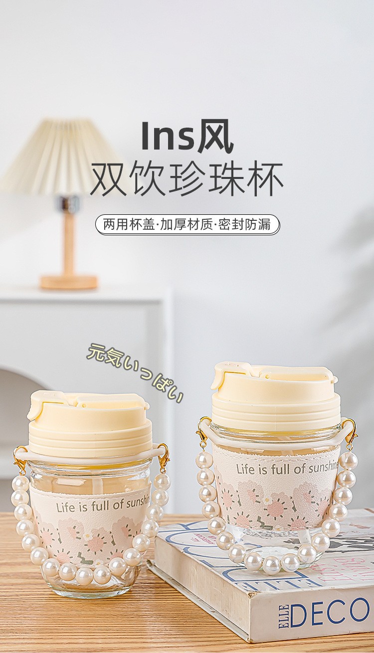 迷你高颜值珍珠手链咖啡杯带吸管玻璃双饮杯便携可爱玻璃水杯
