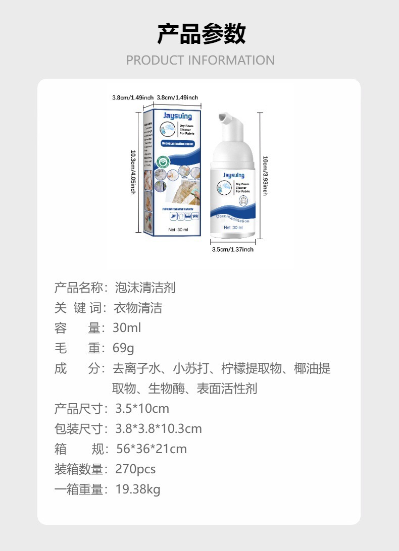 Jaysuing 泡沫清洁剂 清洁羽绒服地毯顽固污渍黄渍衣物去污干洗剂