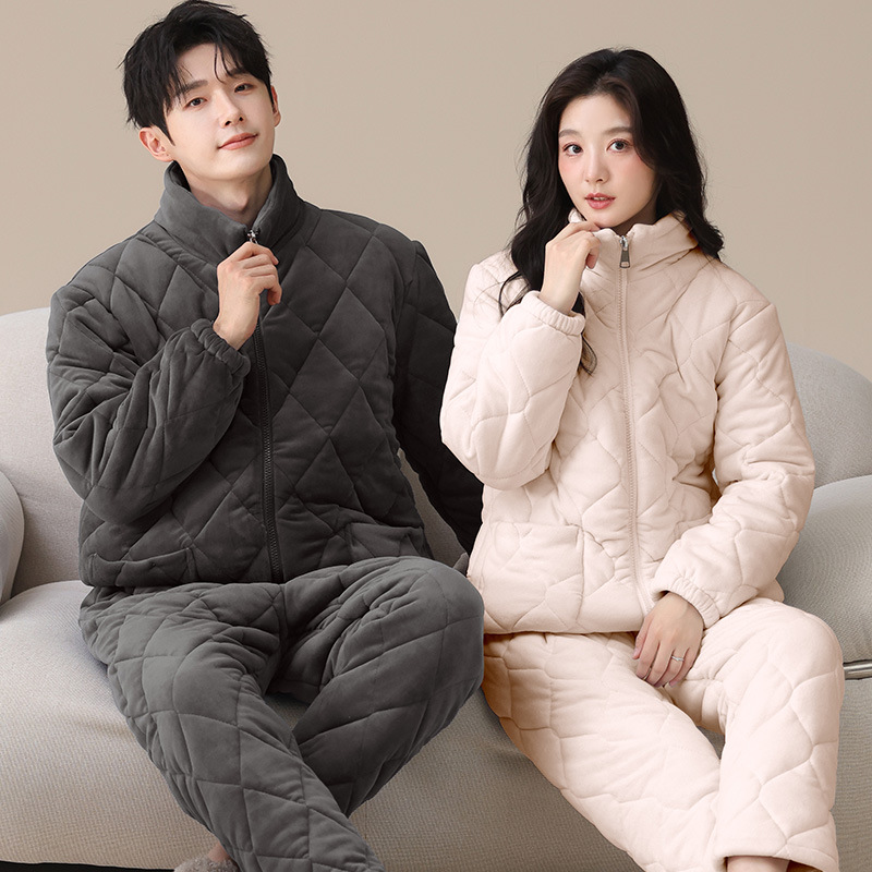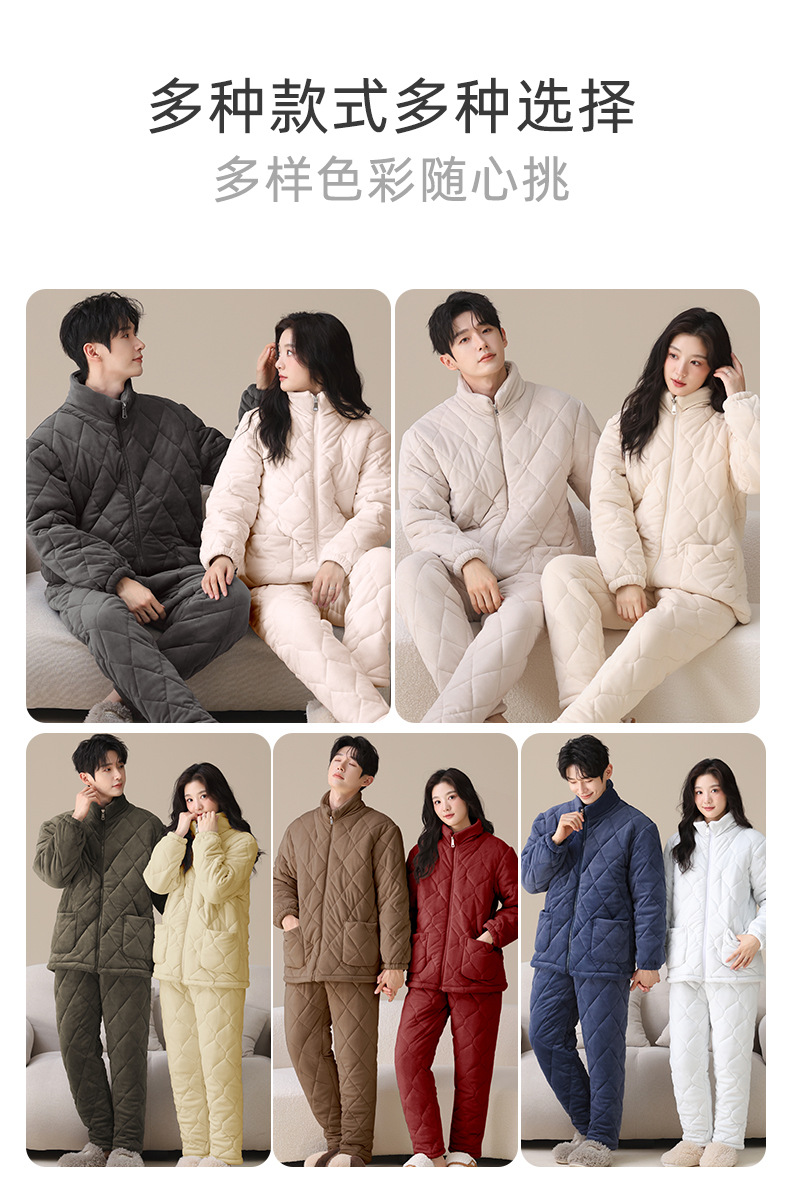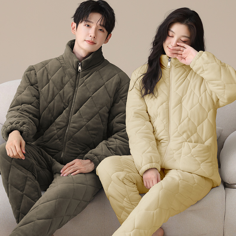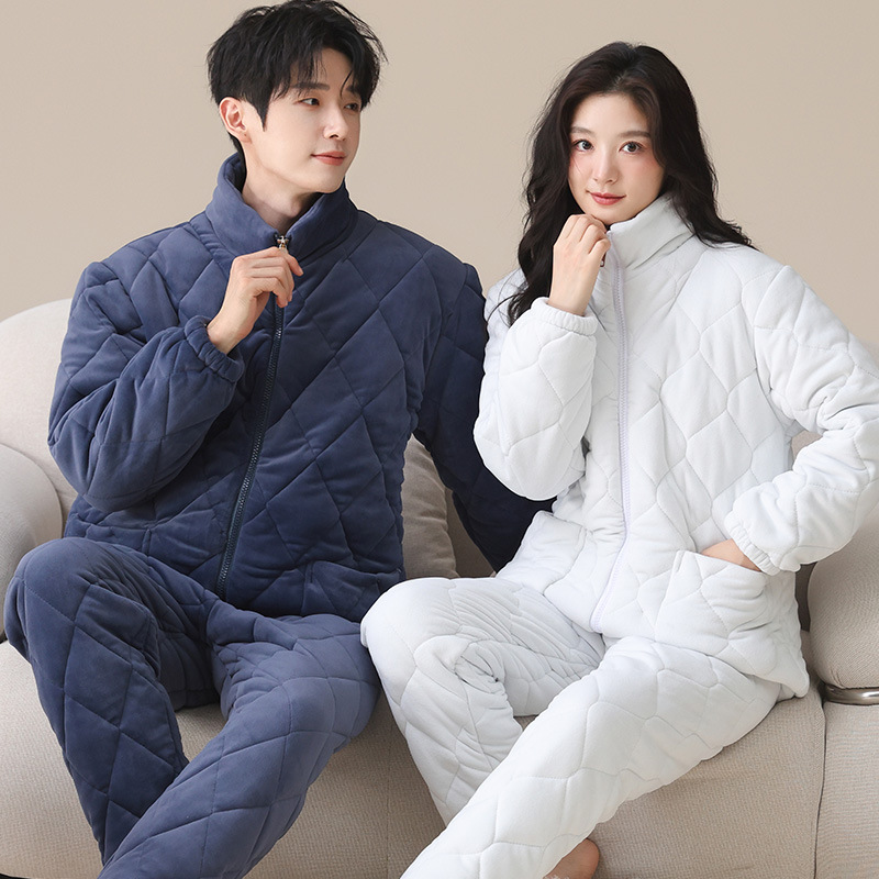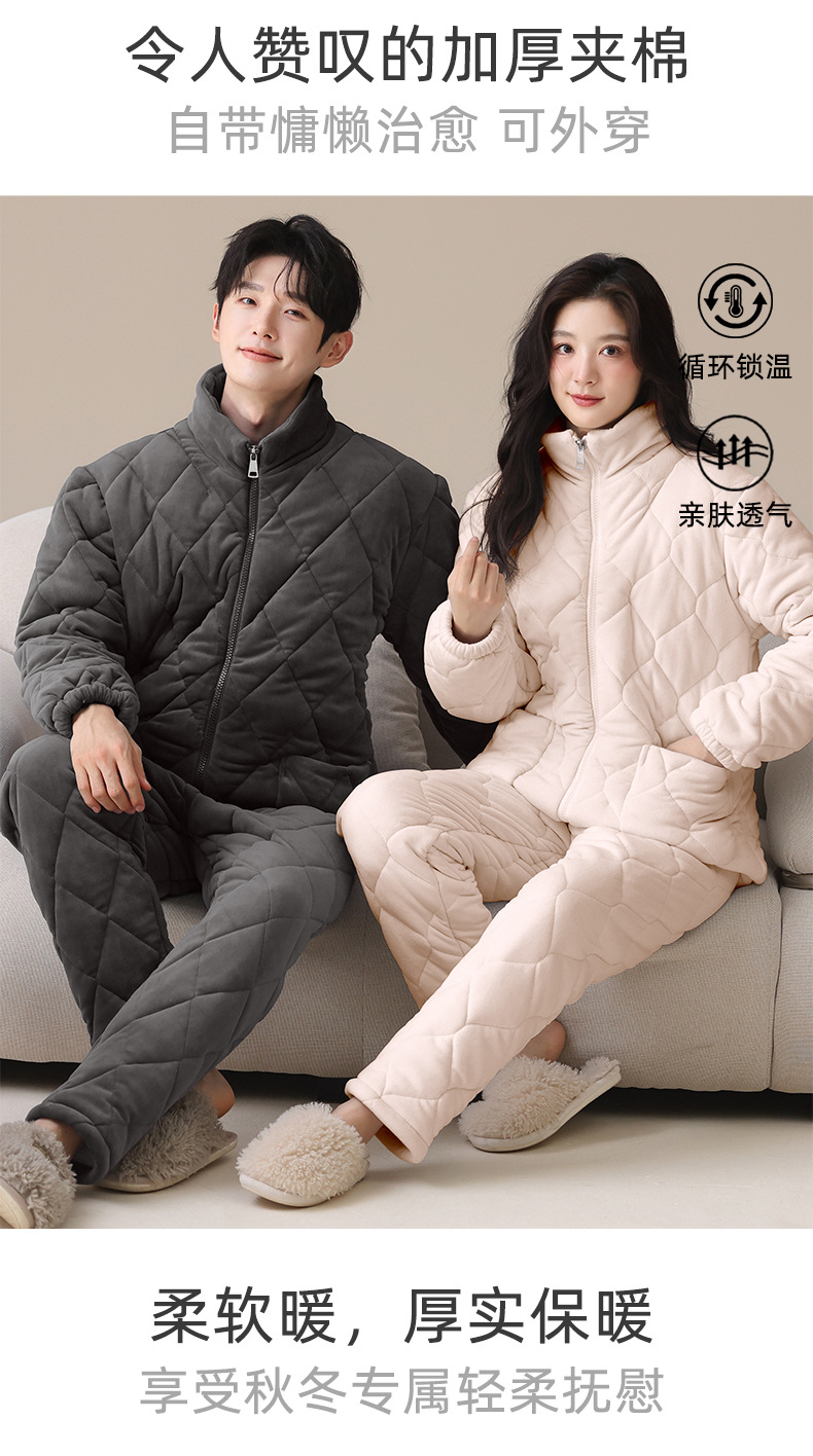 情侣睡衣冬季夹棉拉链款立领保暖三层加厚加绒秋冬款可外穿家居服