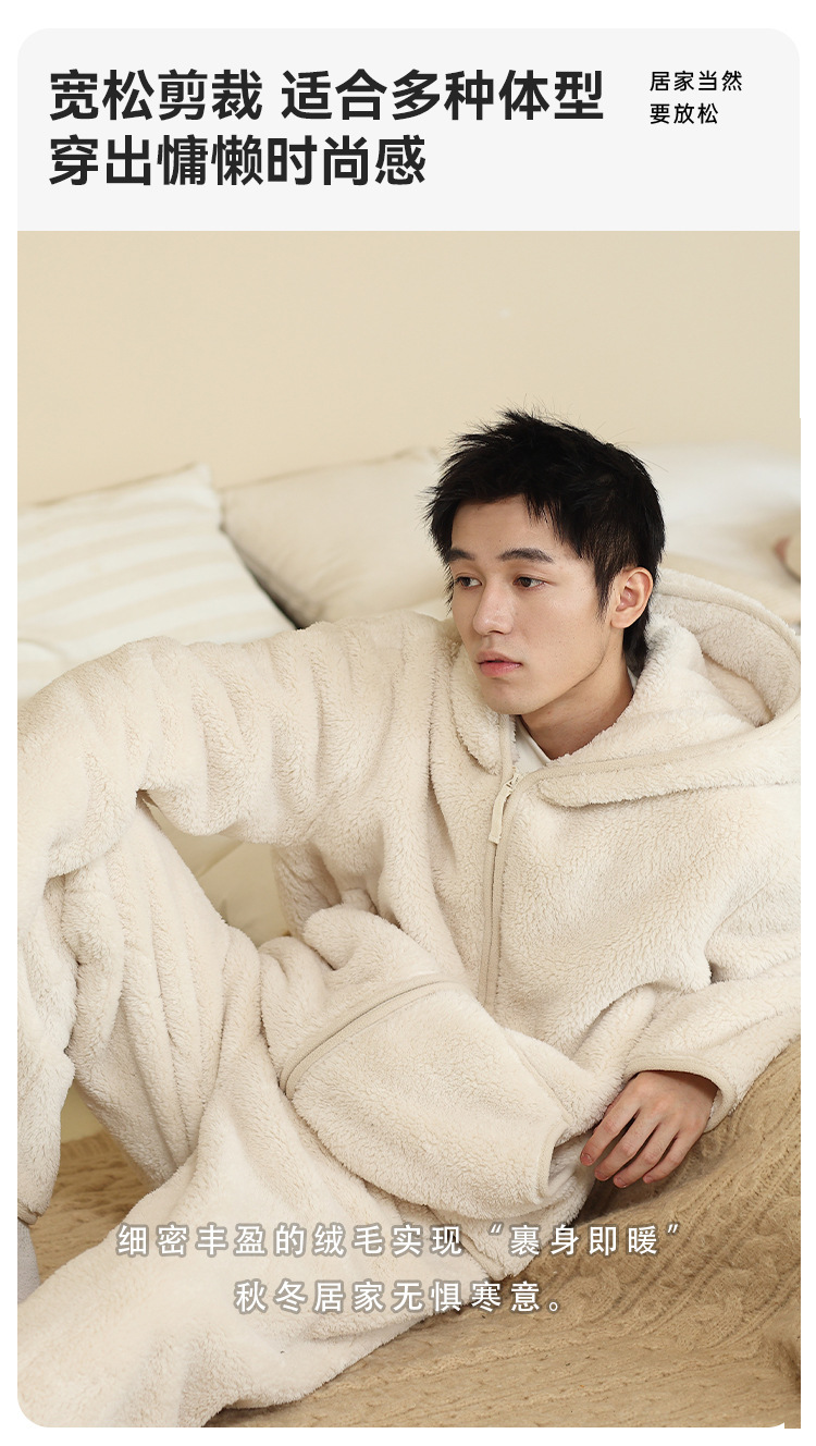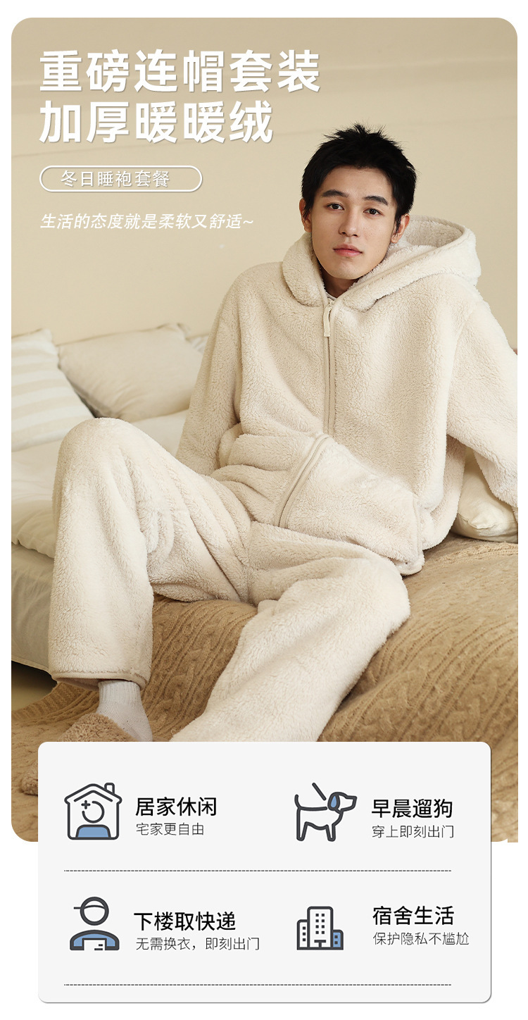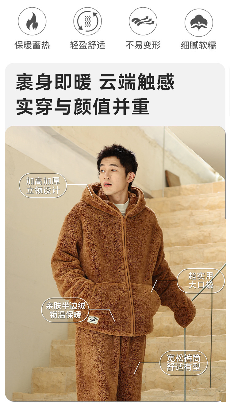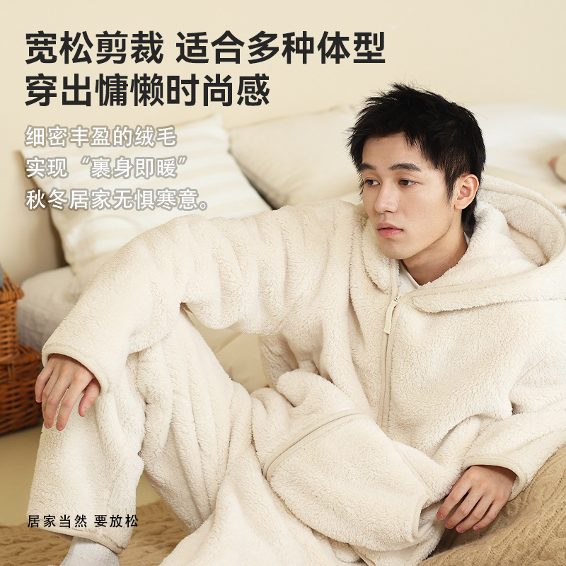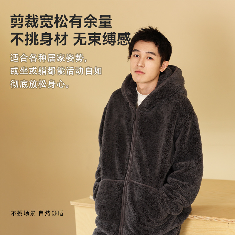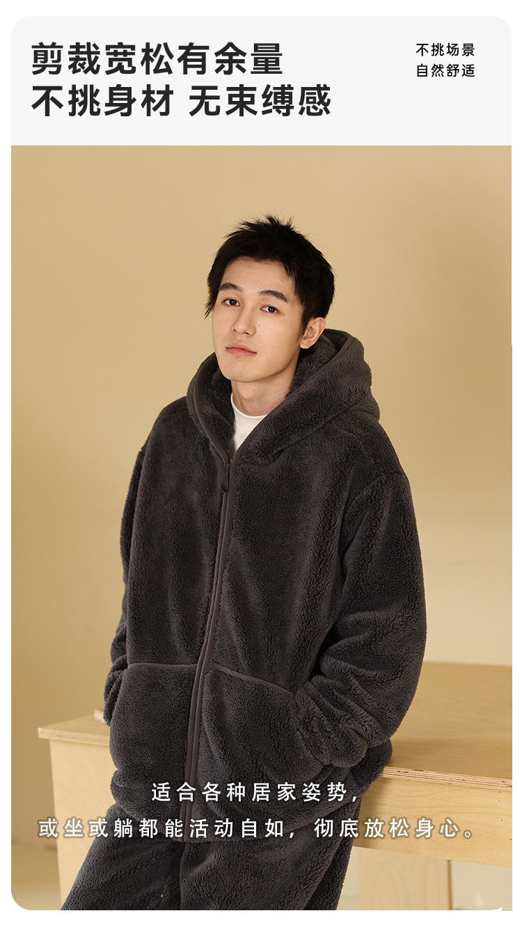 重磅家居连帽睡衣男款加厚暖绒慵懒宽松舒适保暖可外穿男士套装