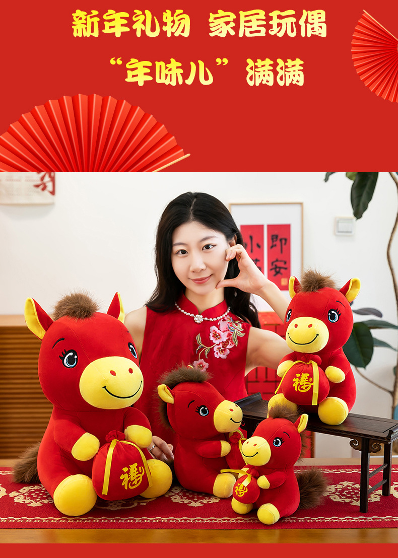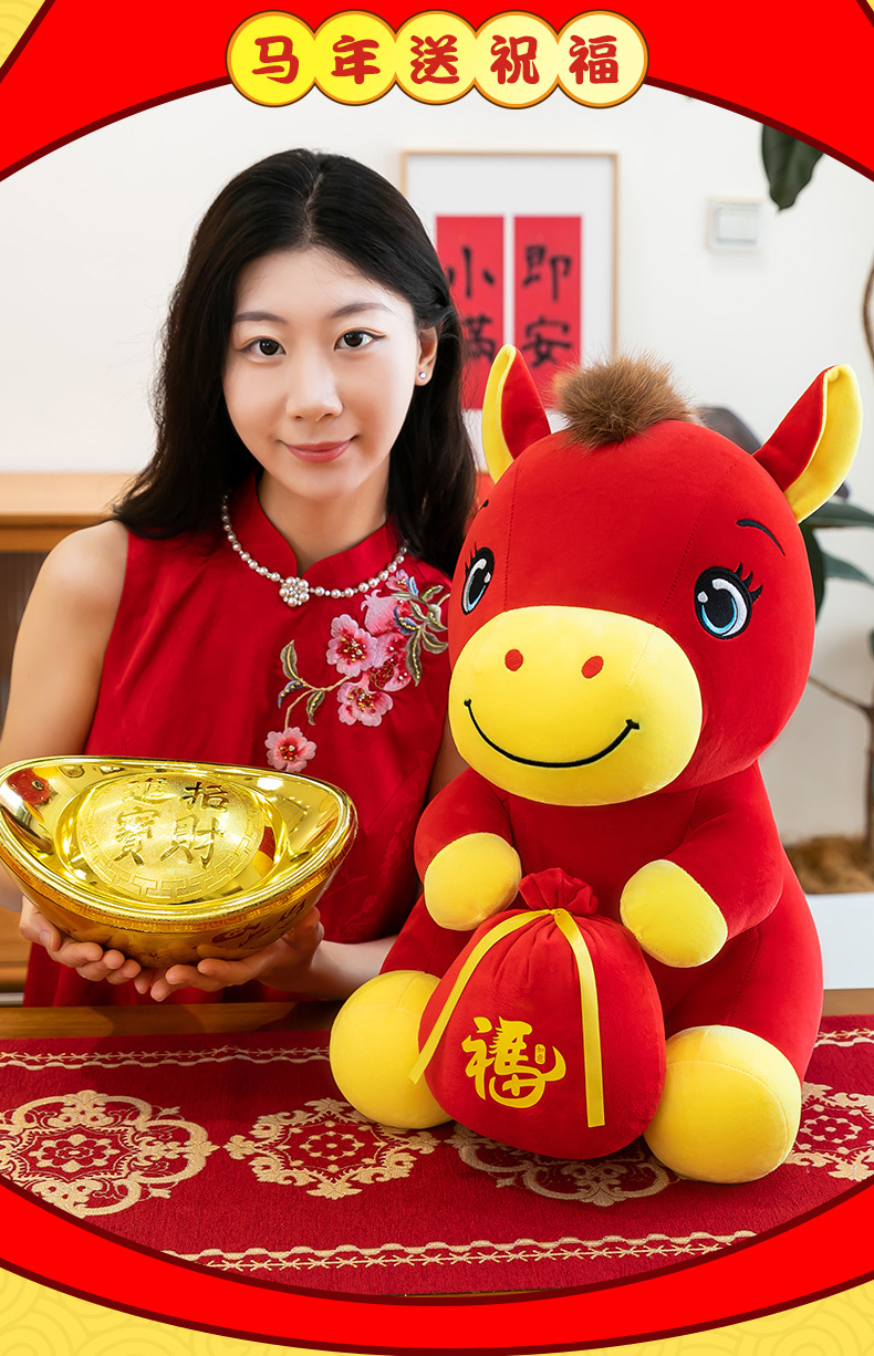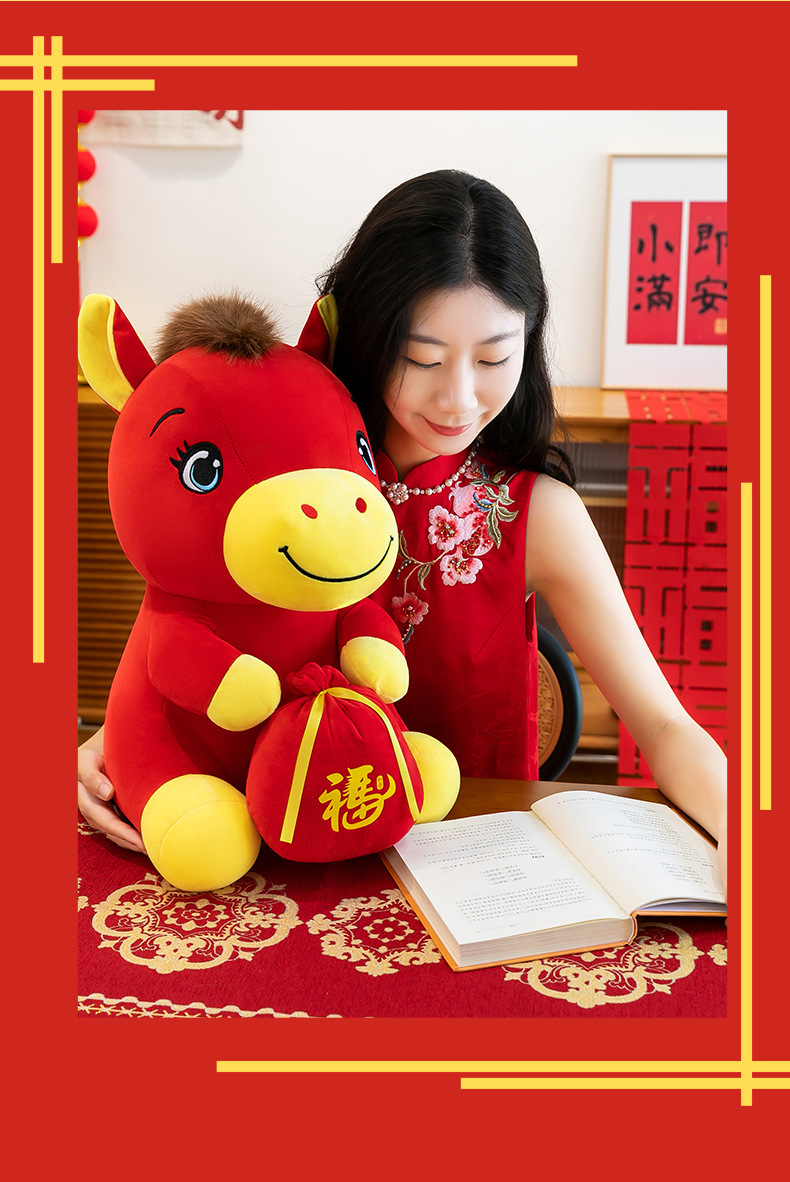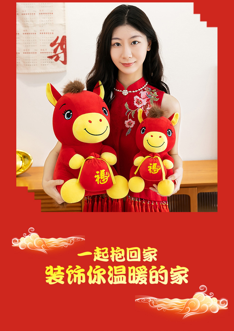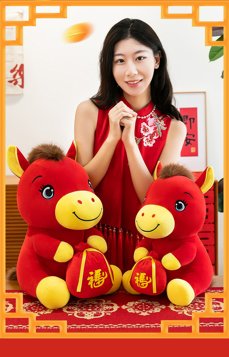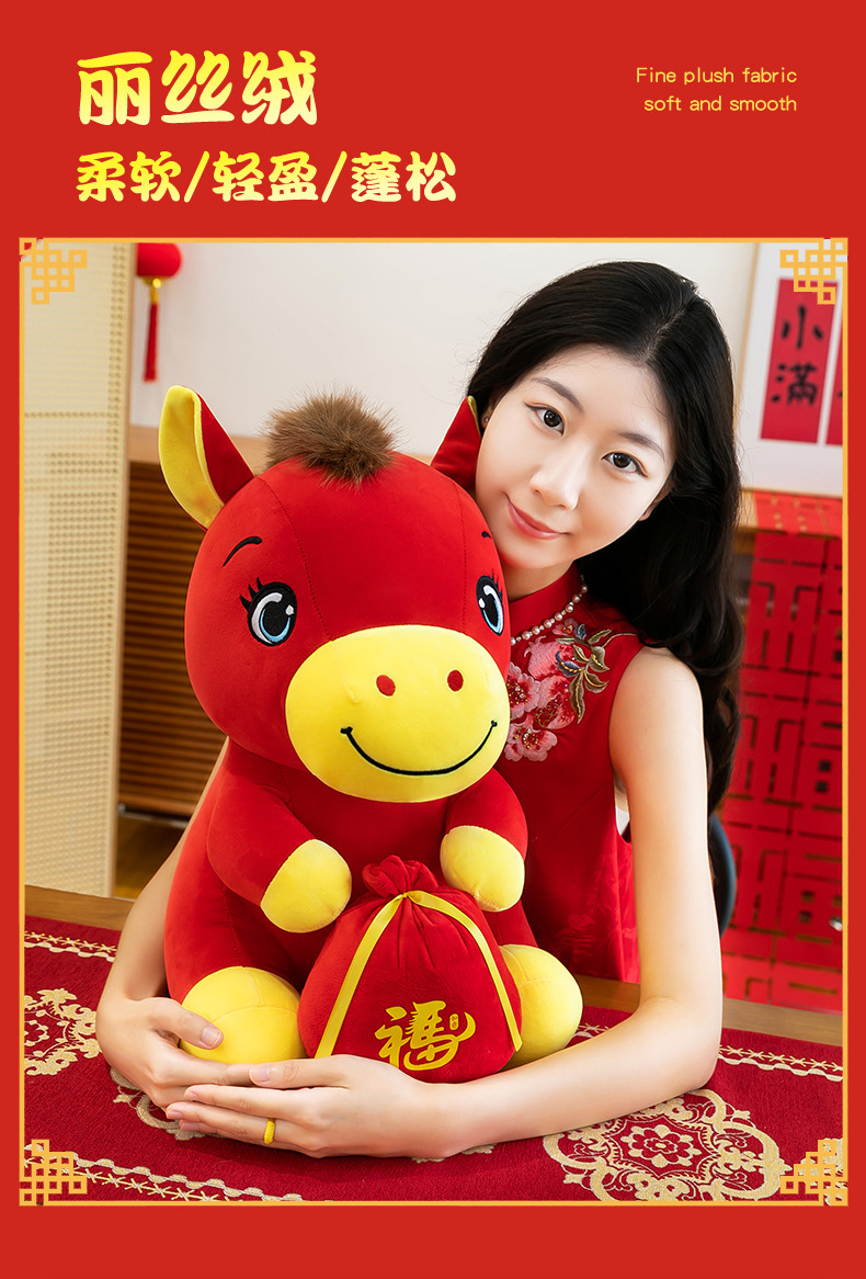 跨境新款马年吉祥物毛绒公仔如意小马抱福袋玩偶公司活动礼品定制
