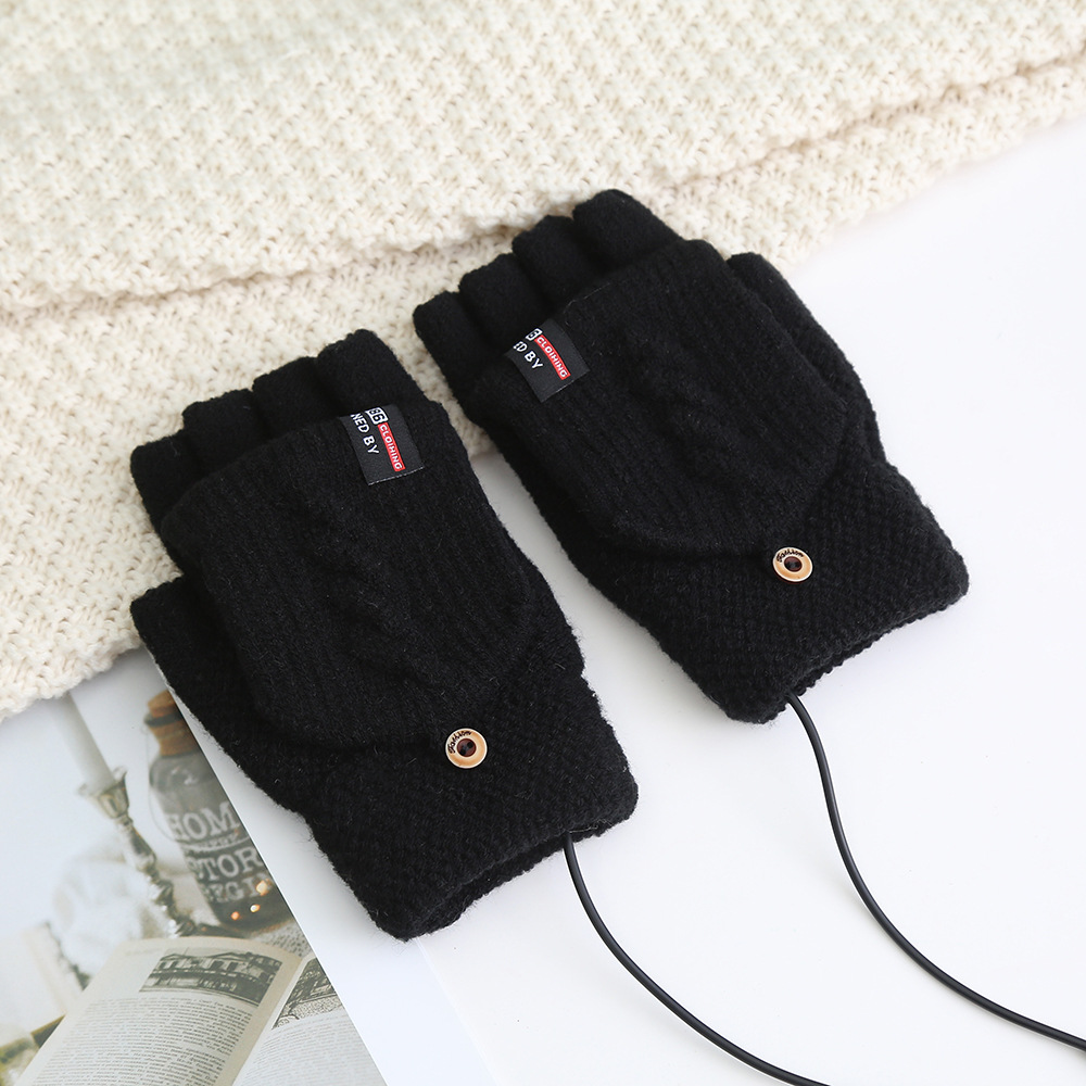 跨境USB加热手套两面电热成人露指翻盖手套加厚保暖半指手套批发