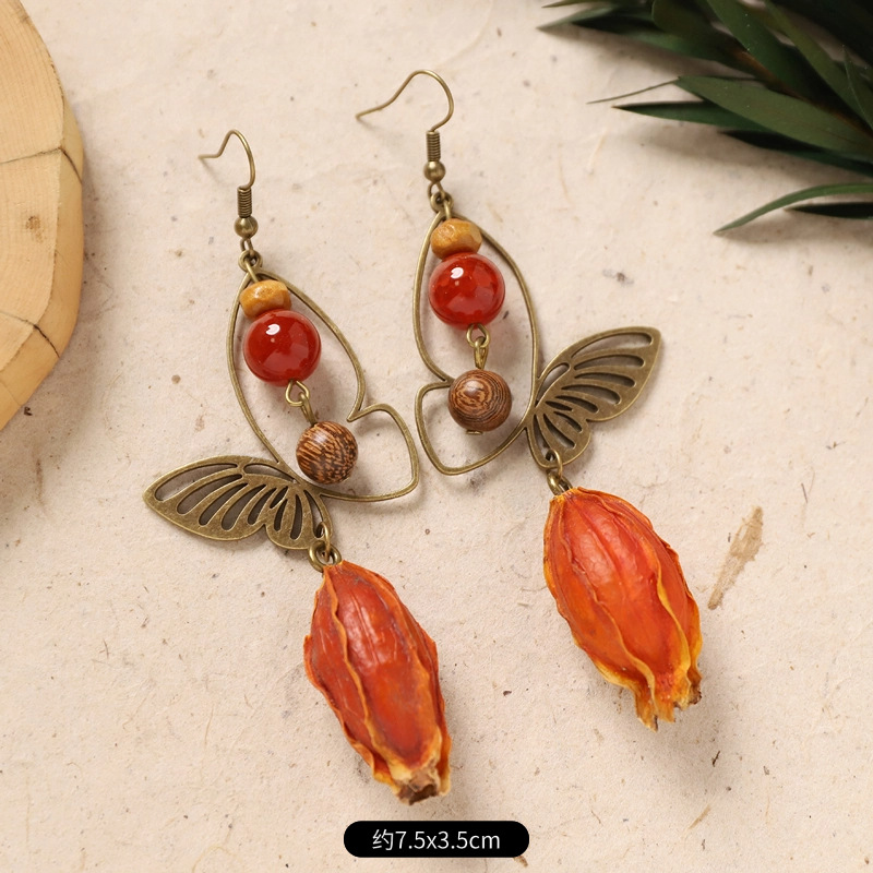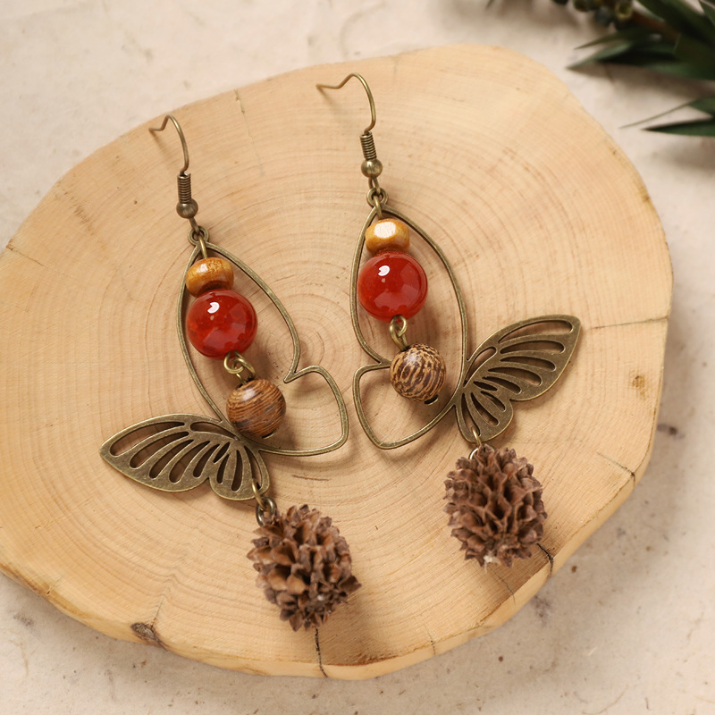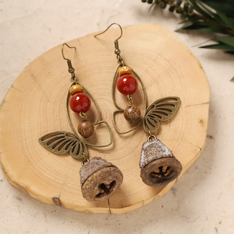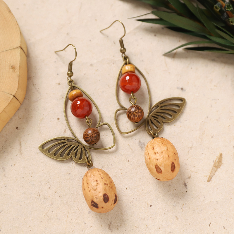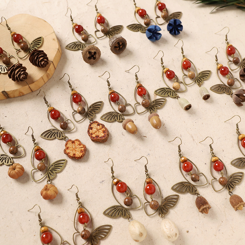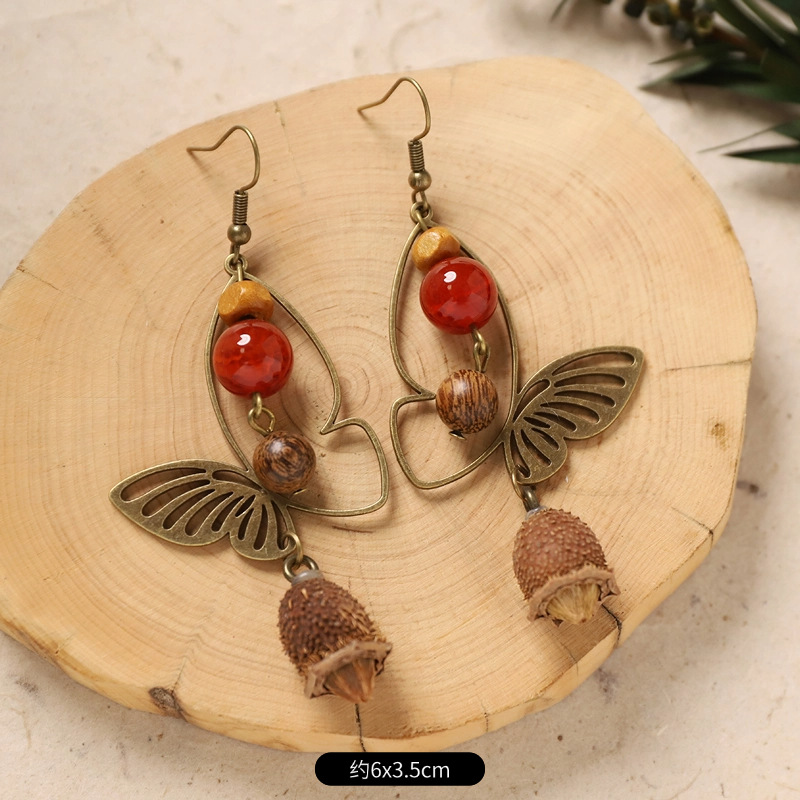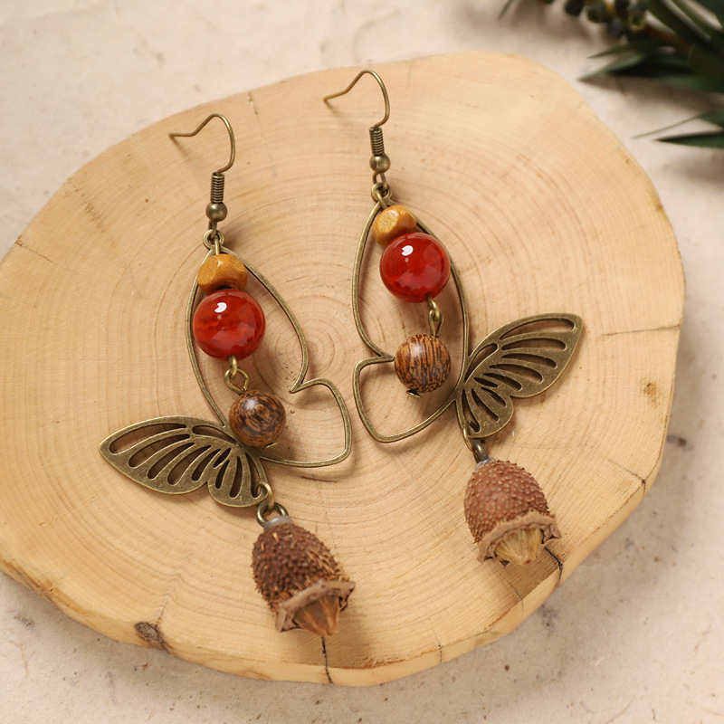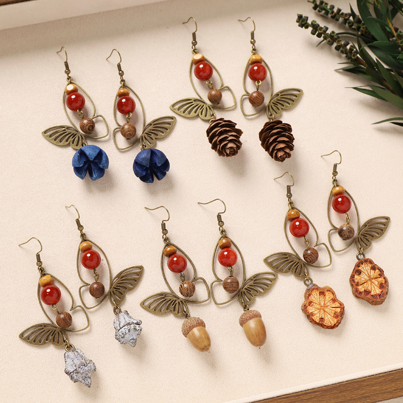 原创蝴蝶植物果实耳环森系复古小众设计橡果文艺民族风长款耳饰女
