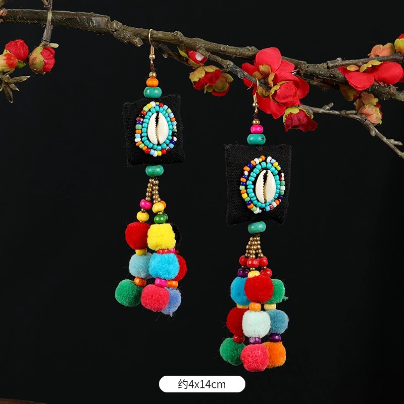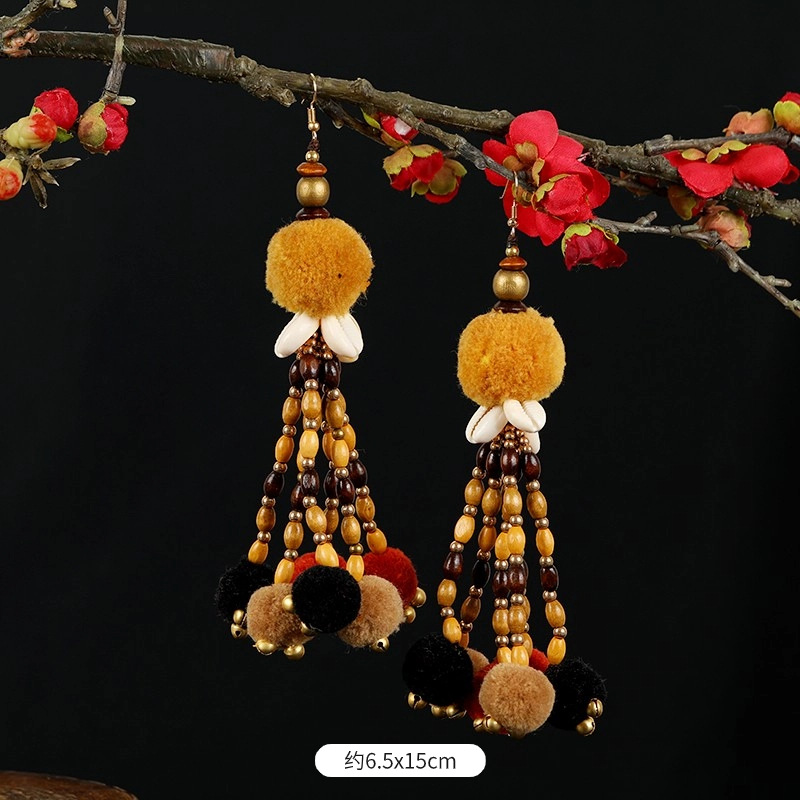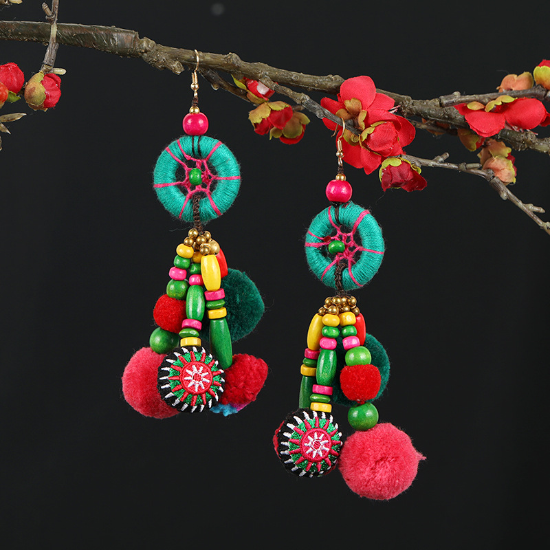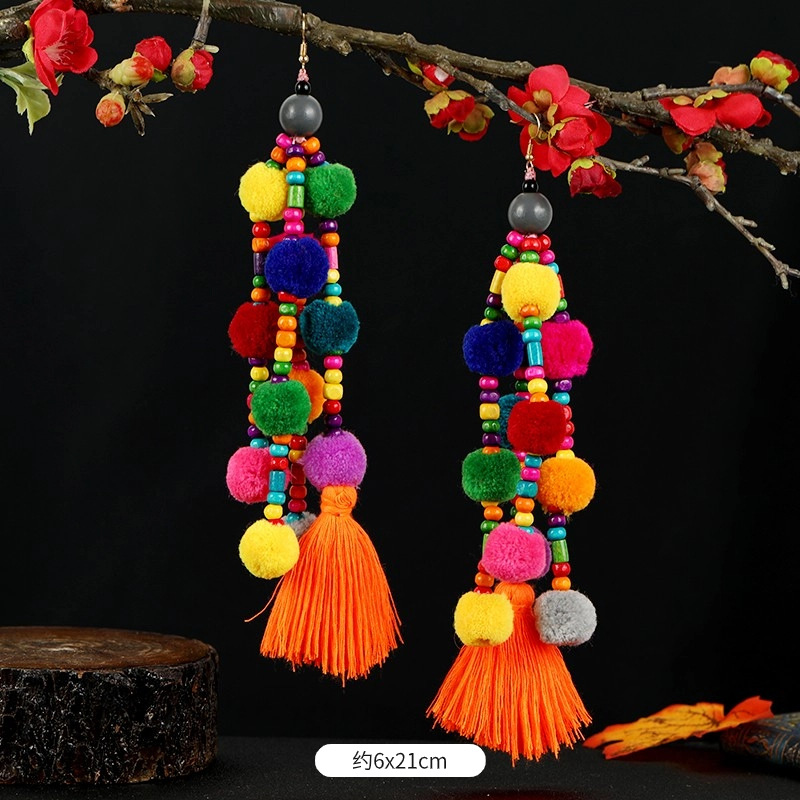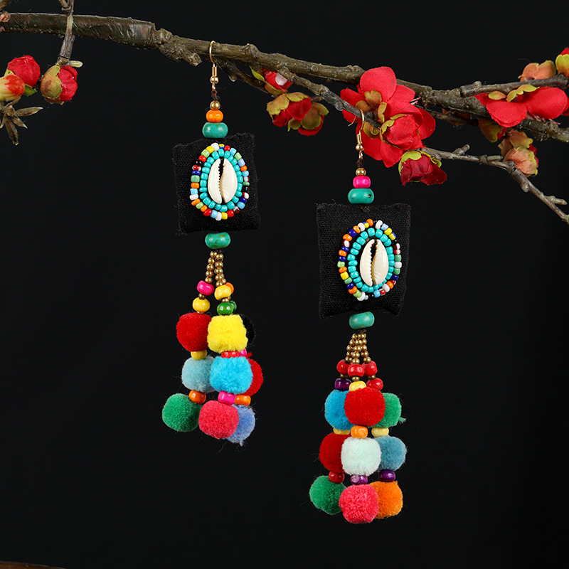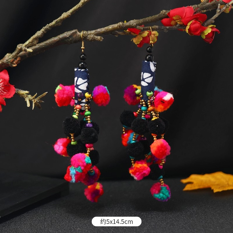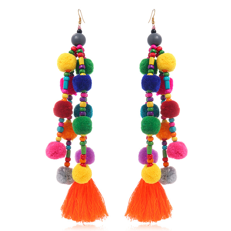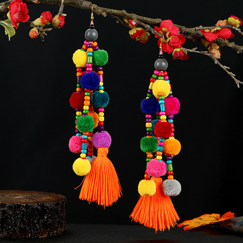 复古民族风撞色绒球耳环个性夸张波西米亚度假长款流苏气质耳饰女
