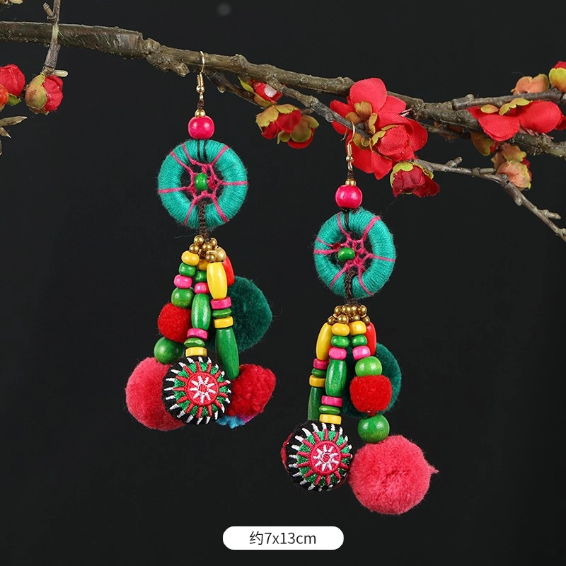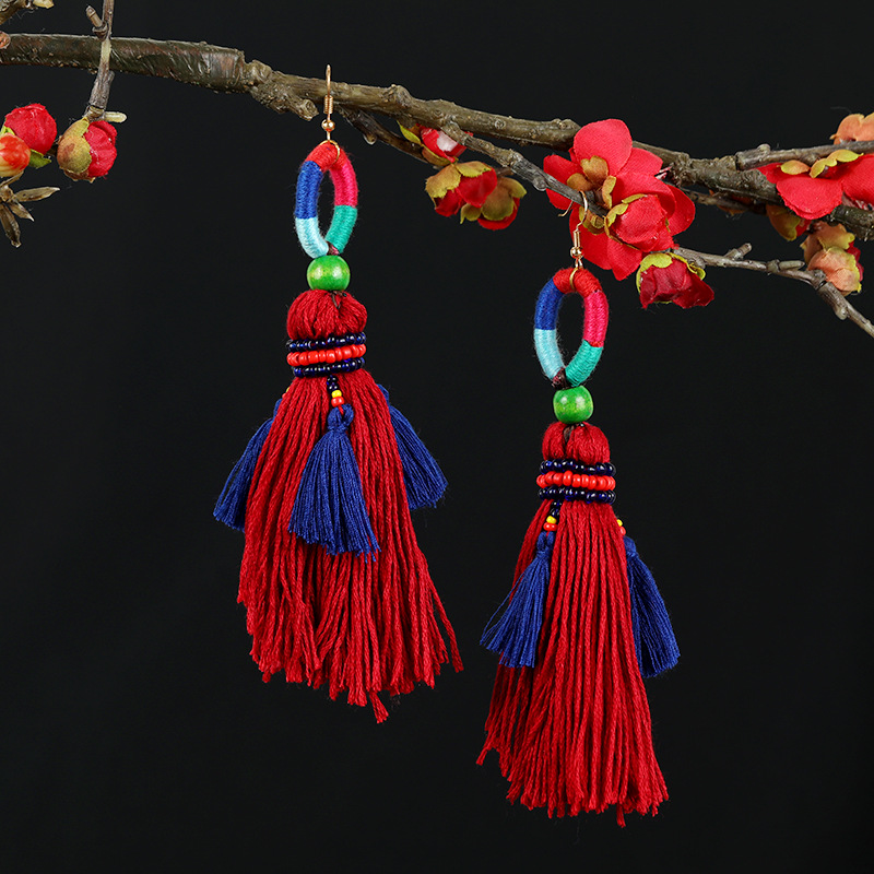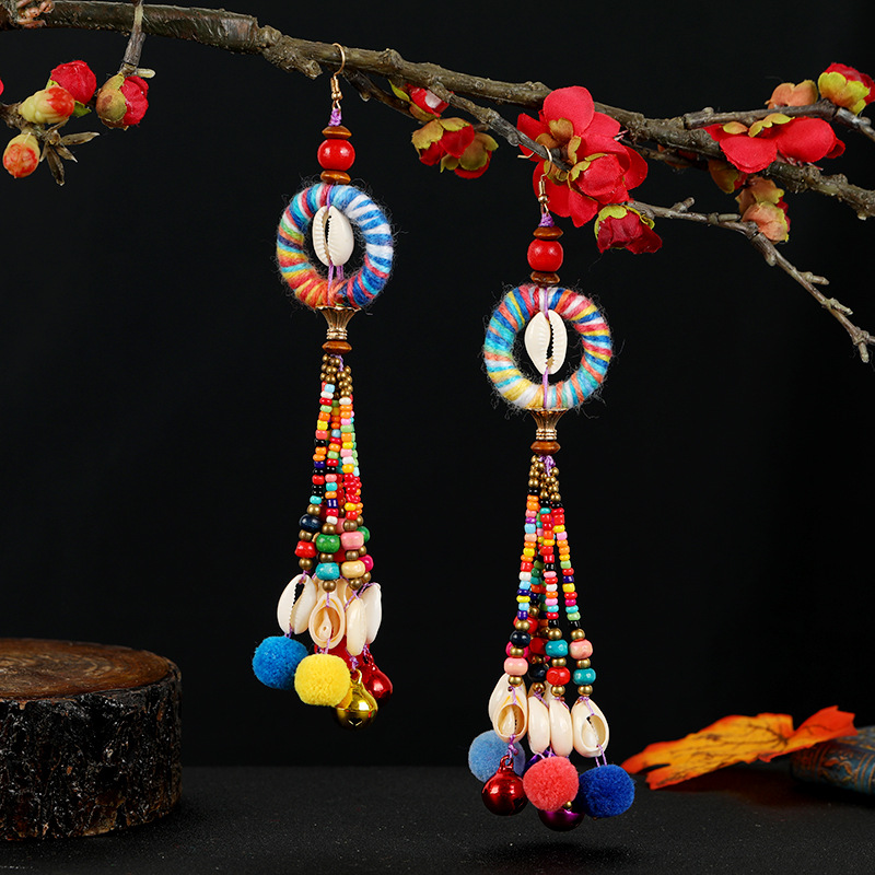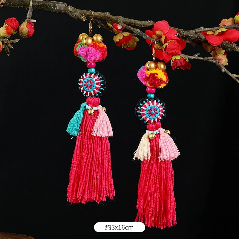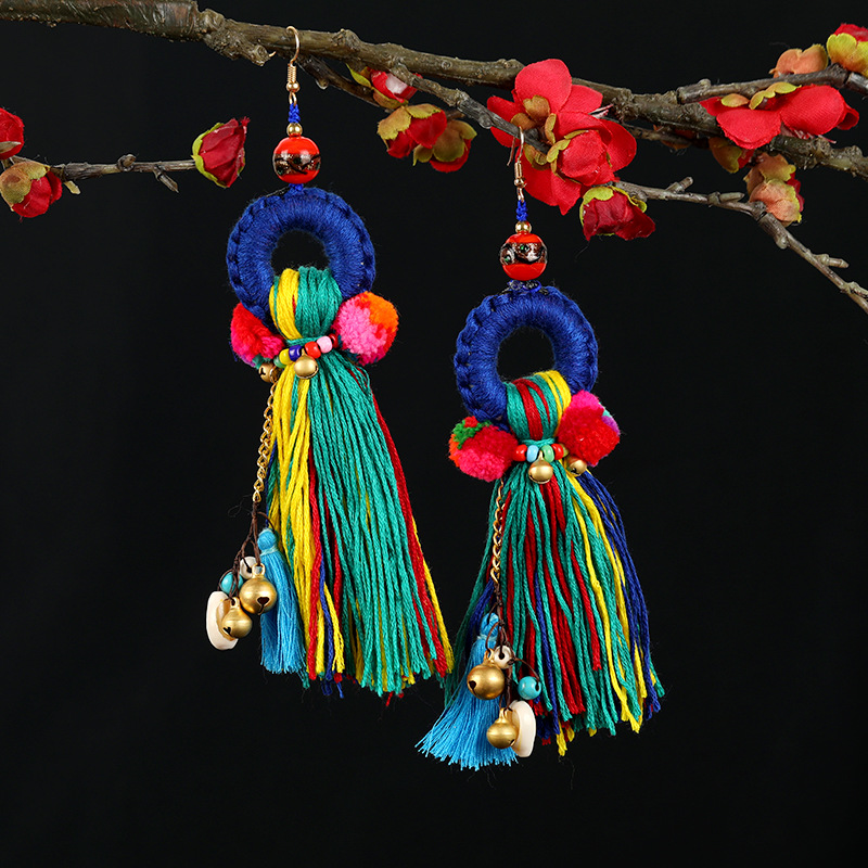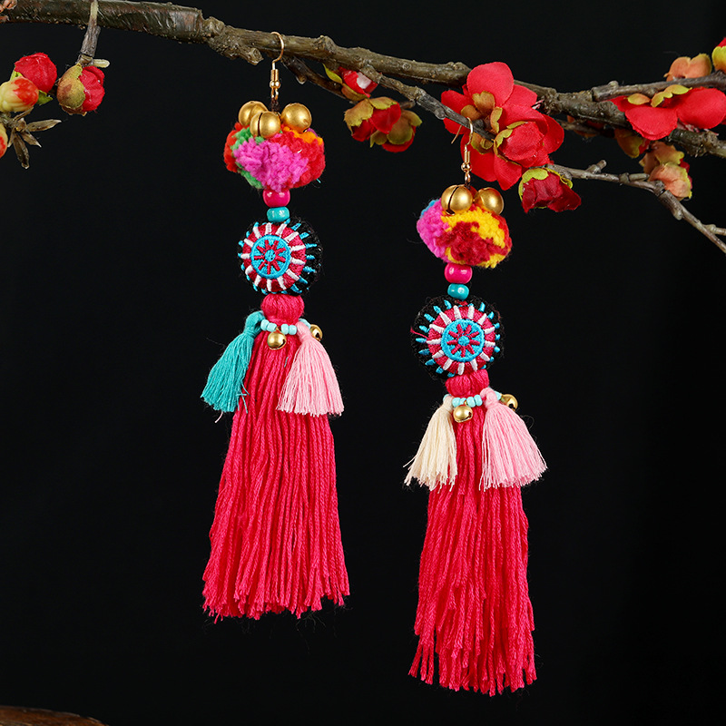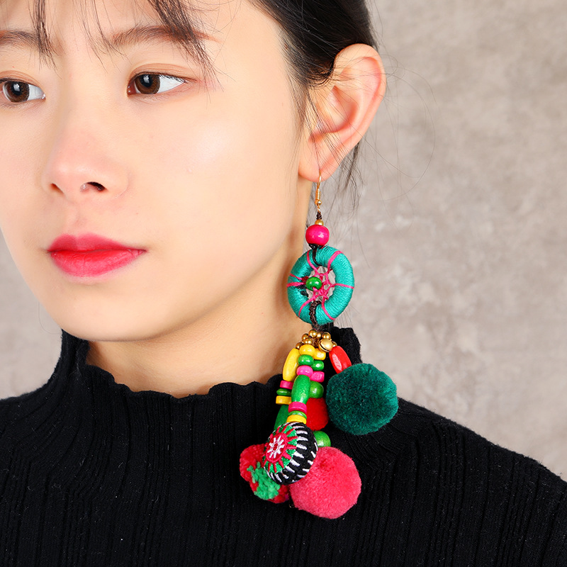 复古民族风撞色绒球耳环个性夸张波西米亚度假长款流苏气质耳饰女