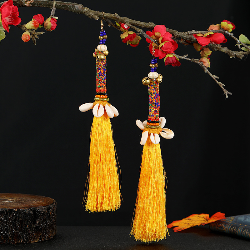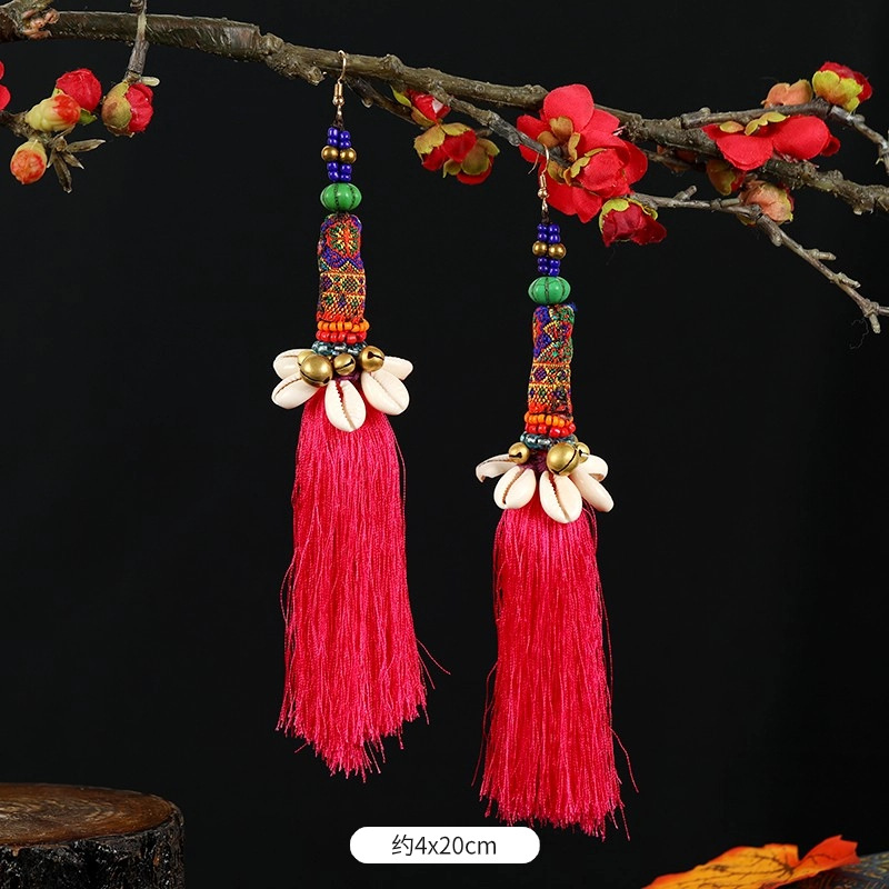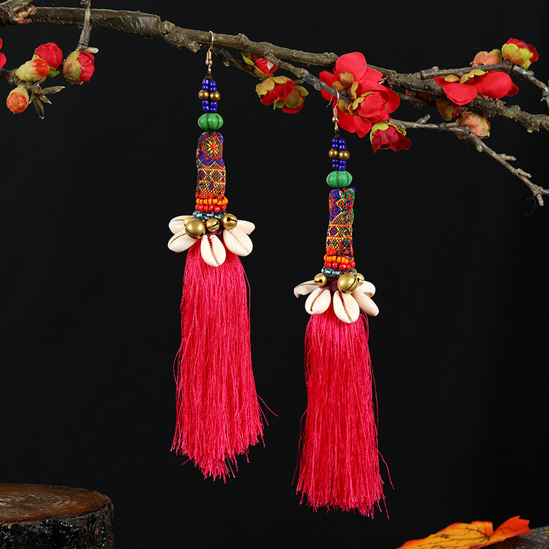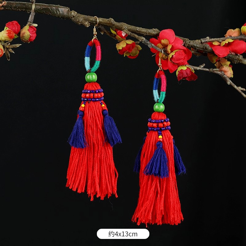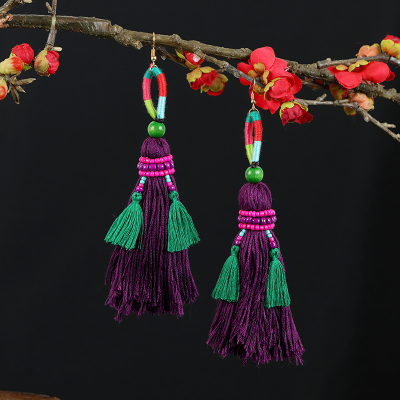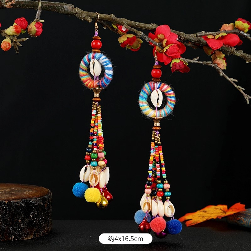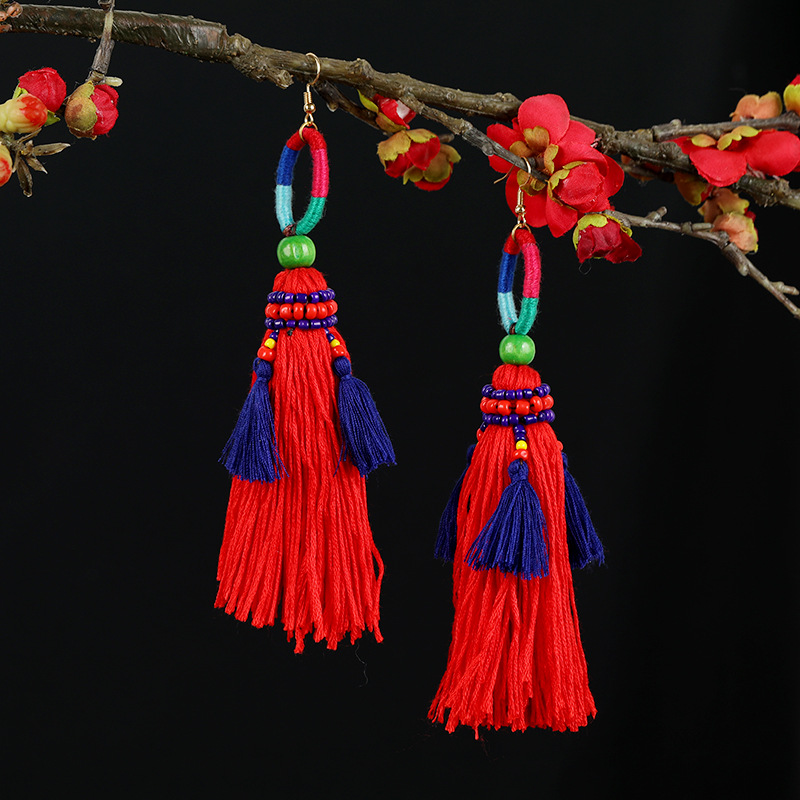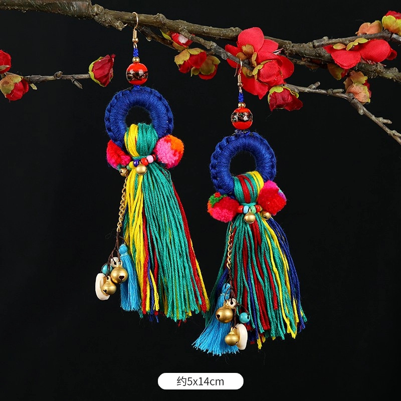 复古民族风撞色绒球耳环个性夸张波西米亚度假长款流苏气质耳饰女