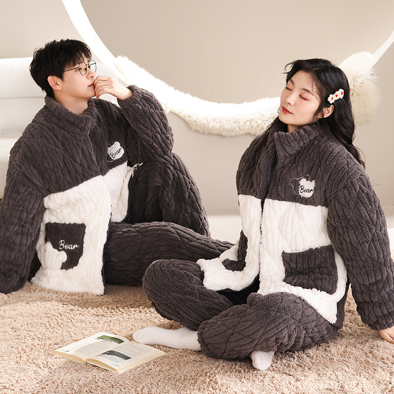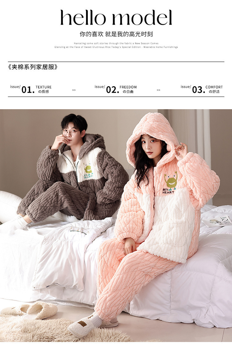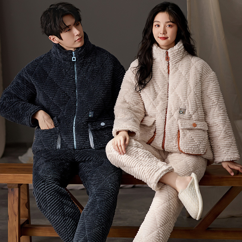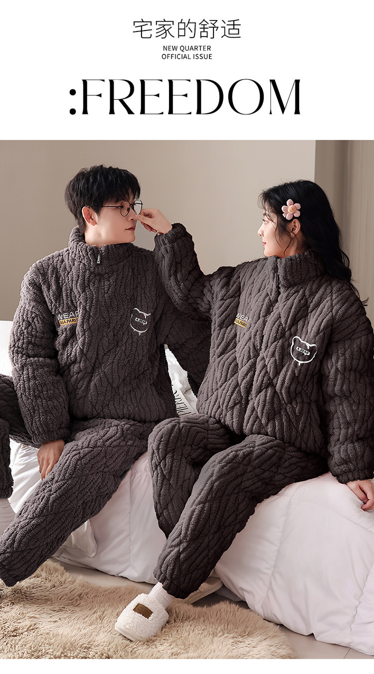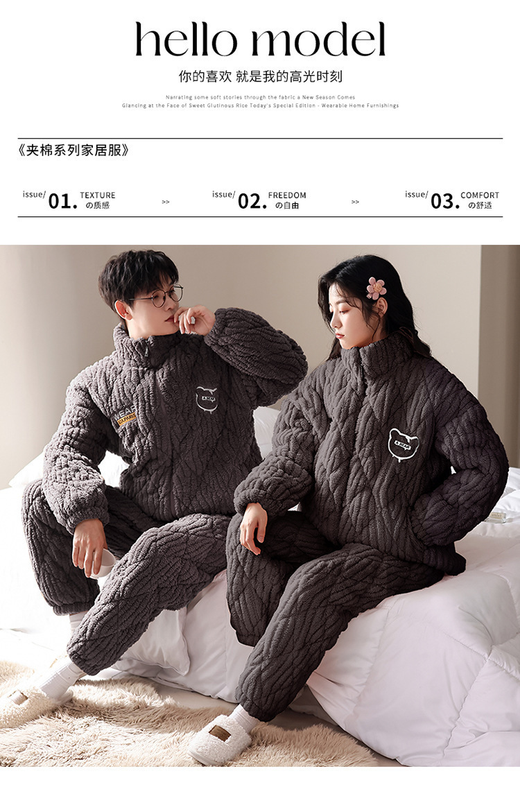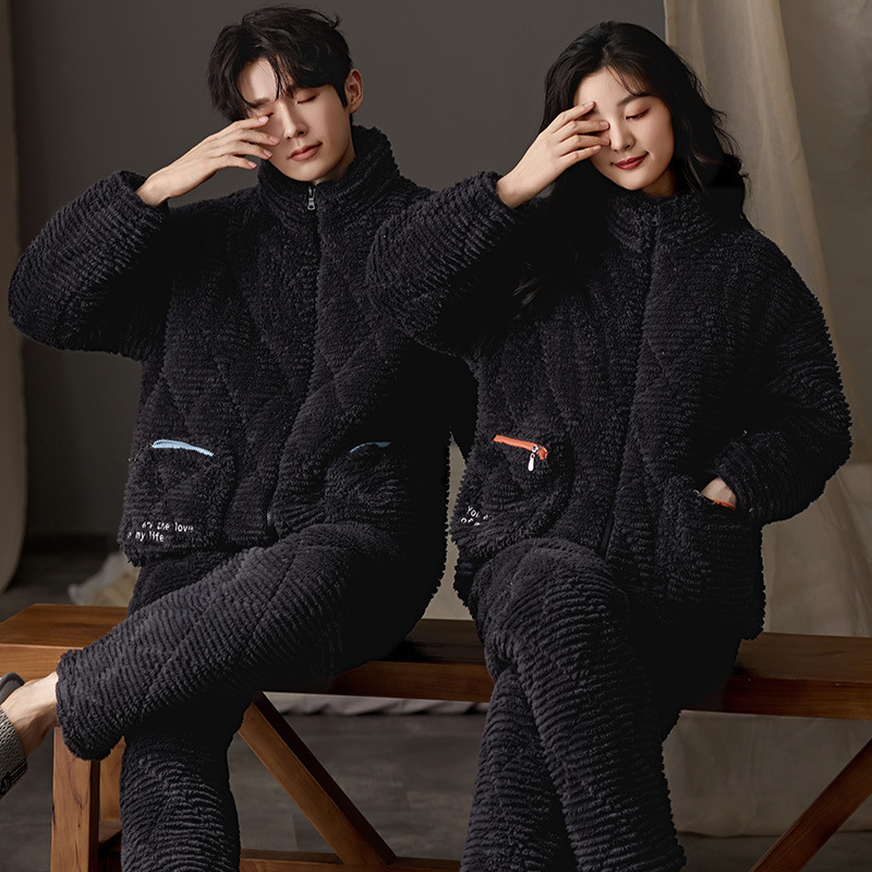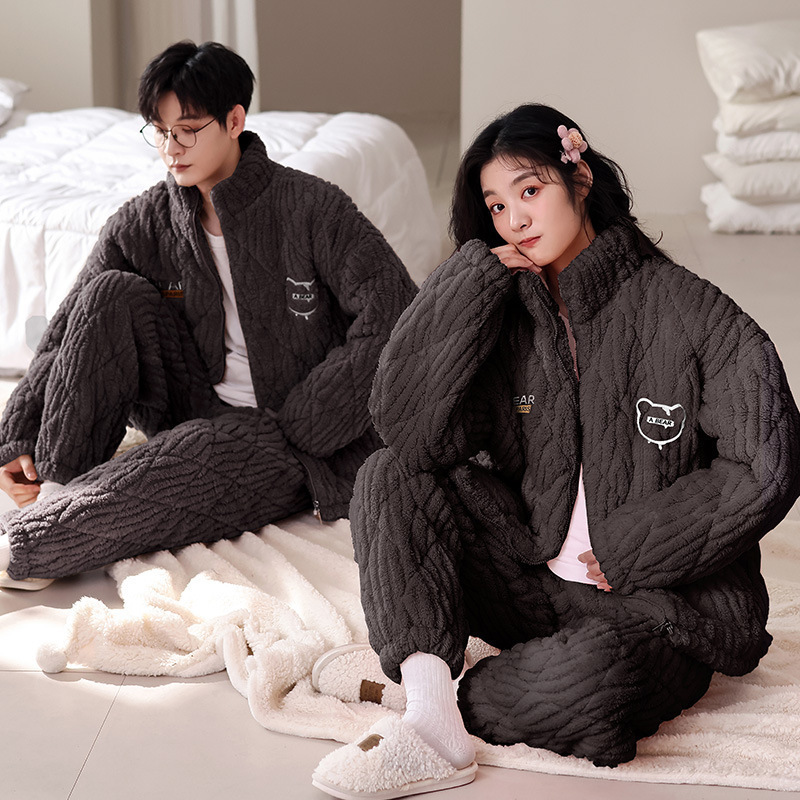 冬季情侣睡衣女珊瑚绒开衫三层加厚夹棉加绒法兰绒男生棉袄家居服