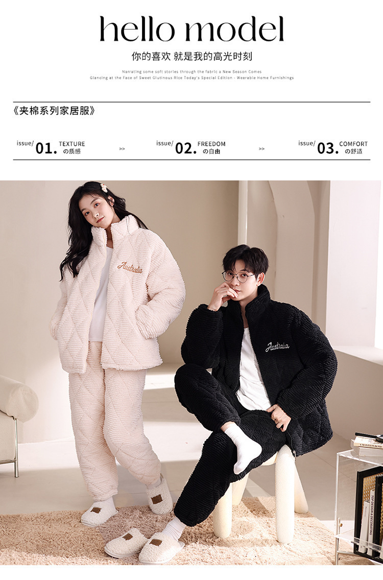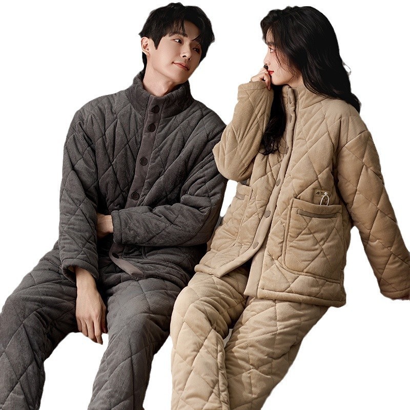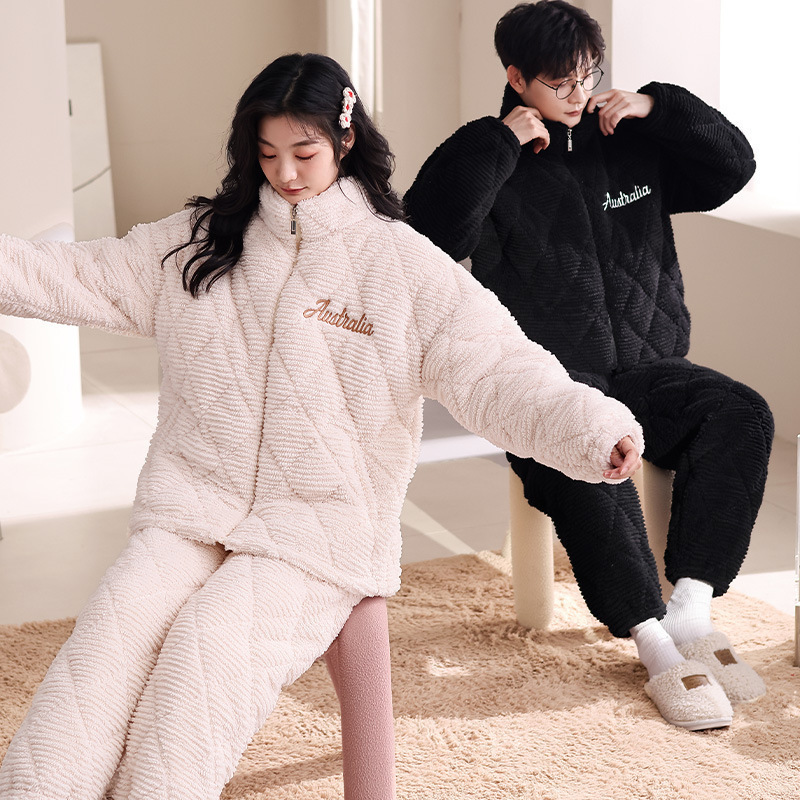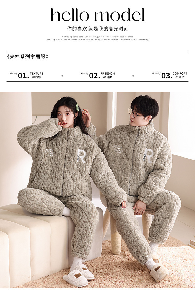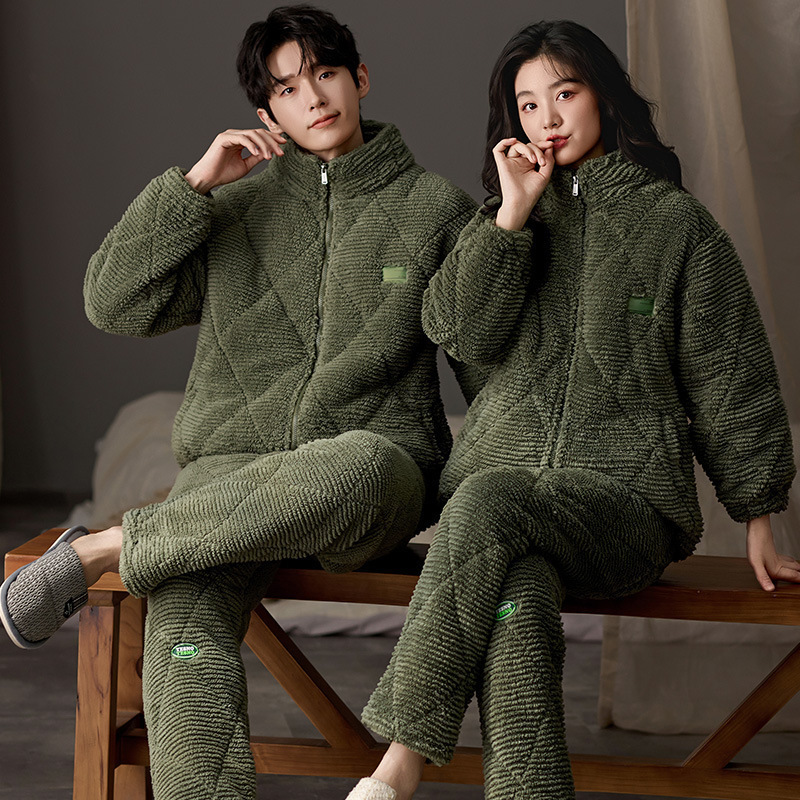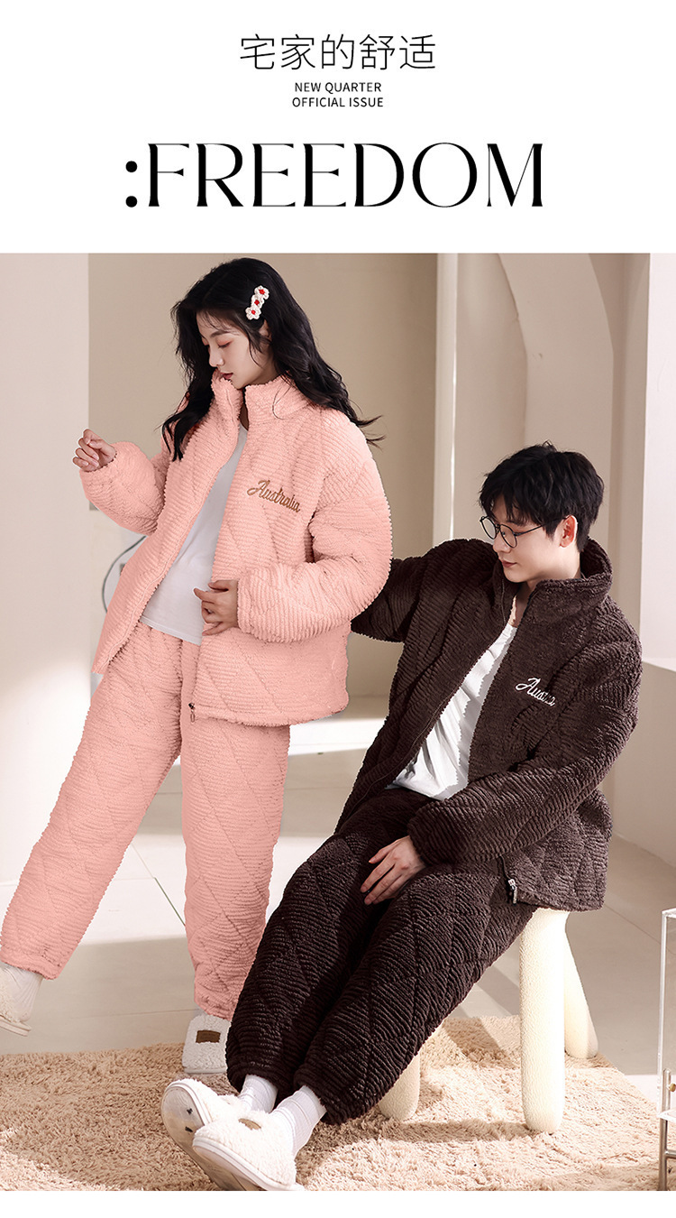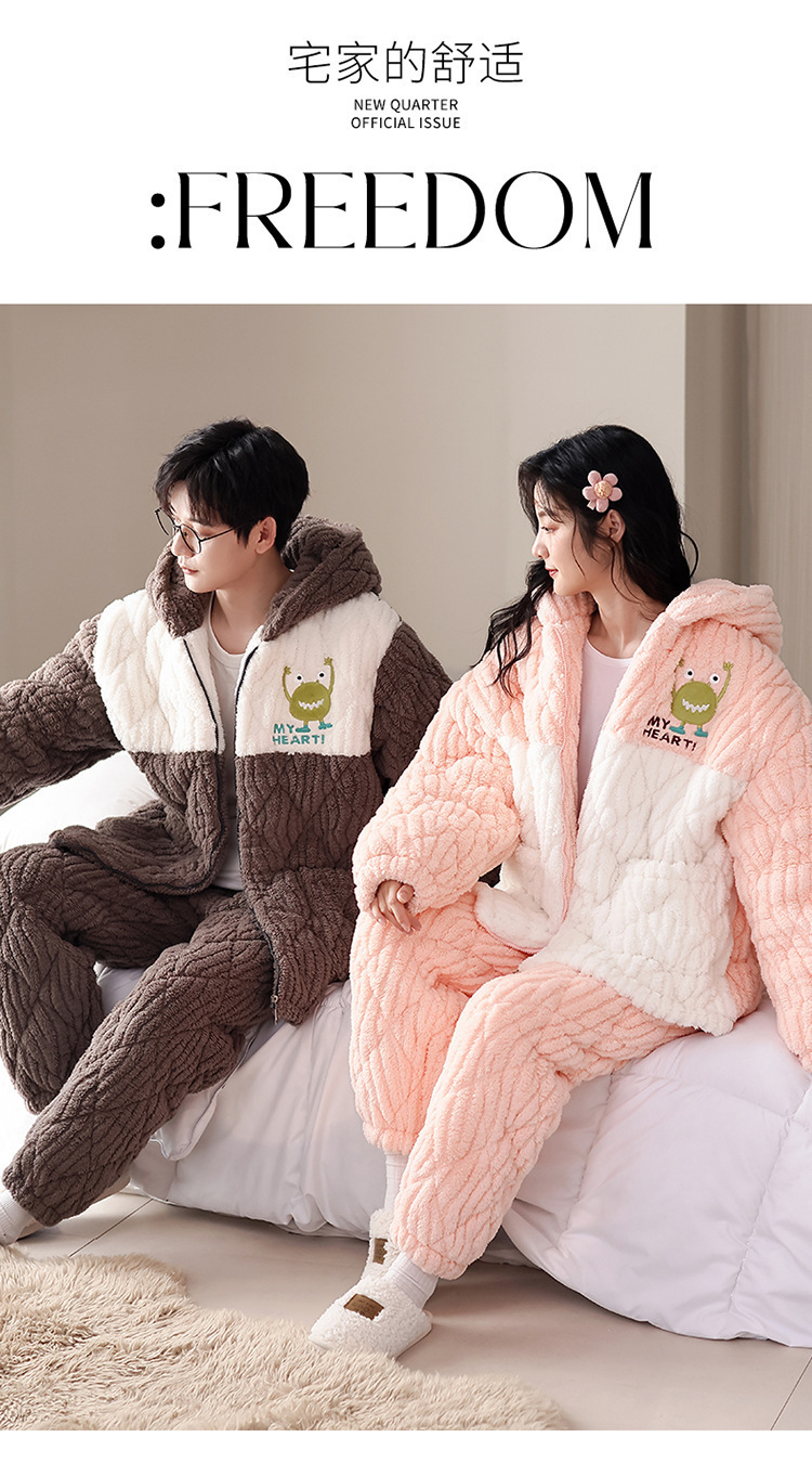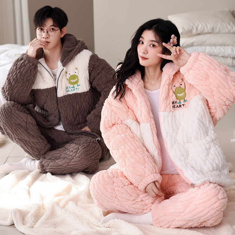 冬季情侣睡衣女珊瑚绒开衫三层加厚夹棉加绒法兰绒男生棉袄家居服