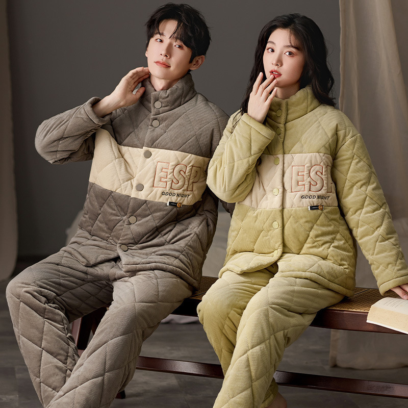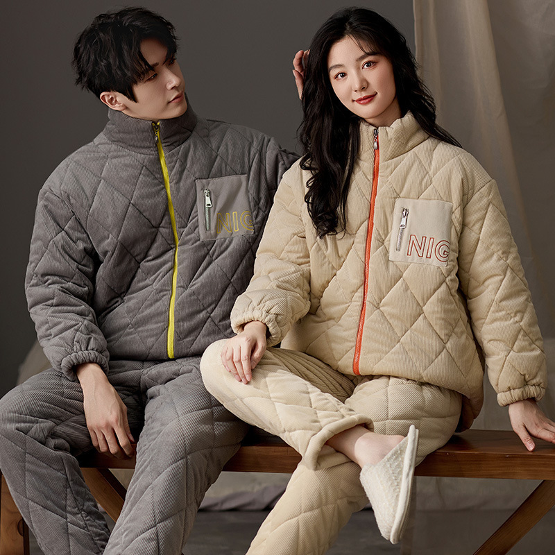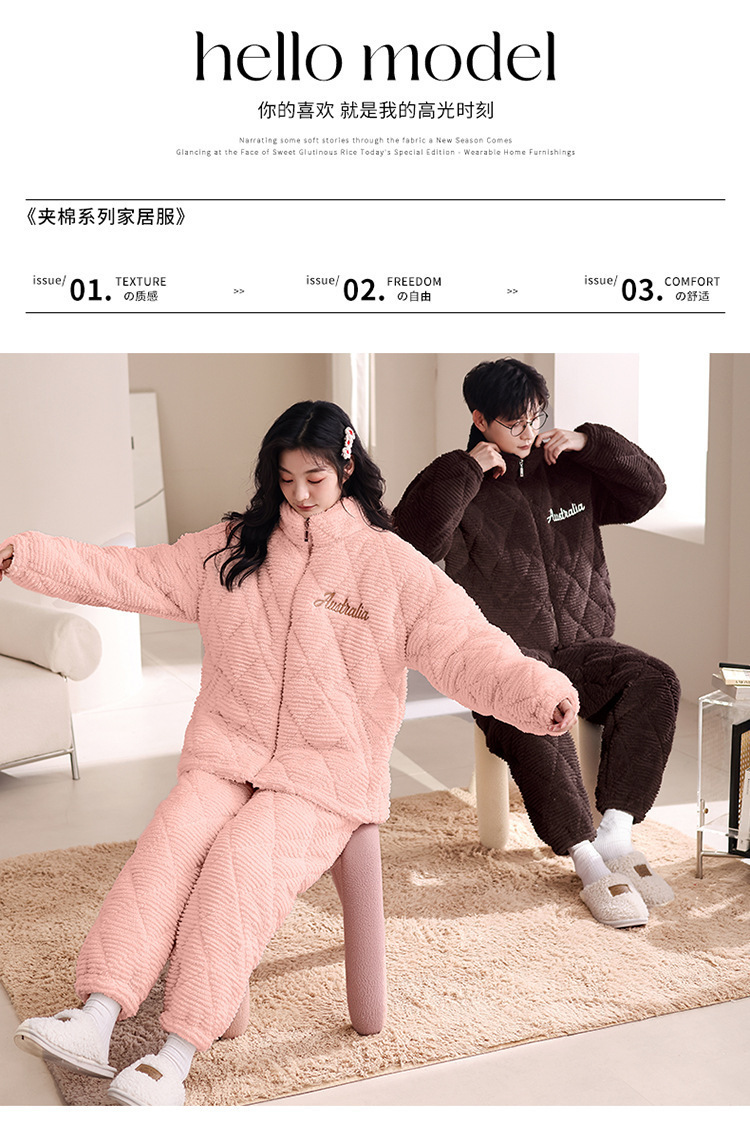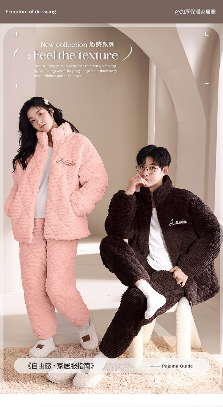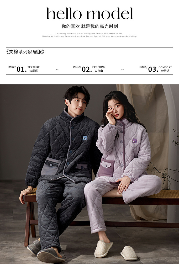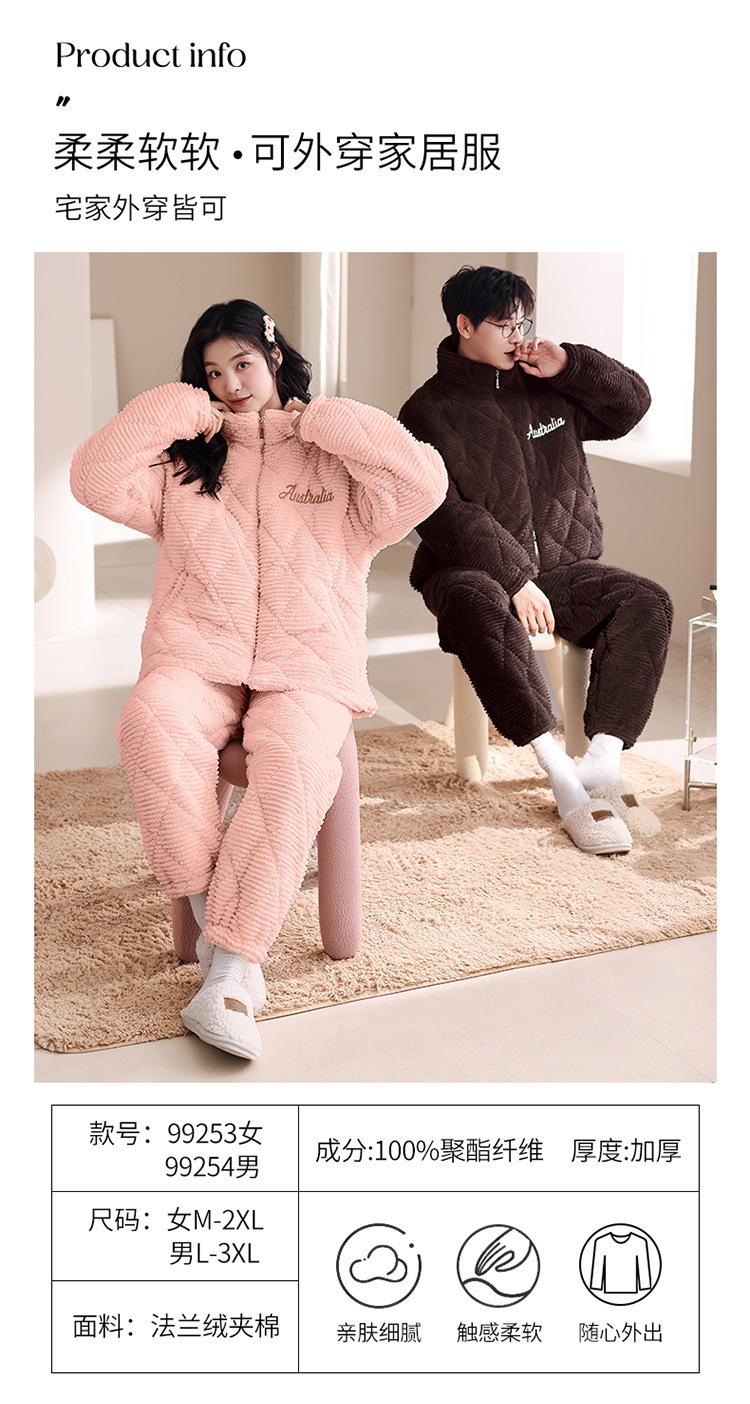 冬季情侣睡衣女珊瑚绒开衫三层加厚夹棉加绒法兰绒男生棉袄家居服