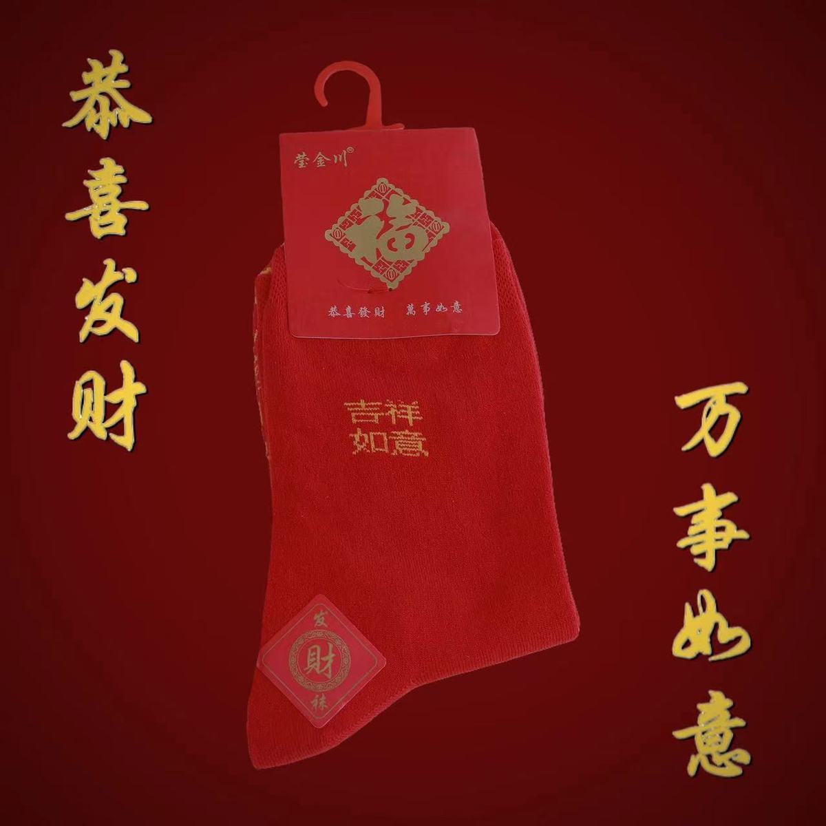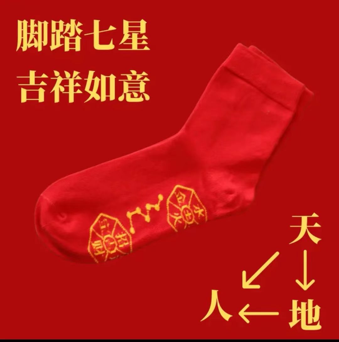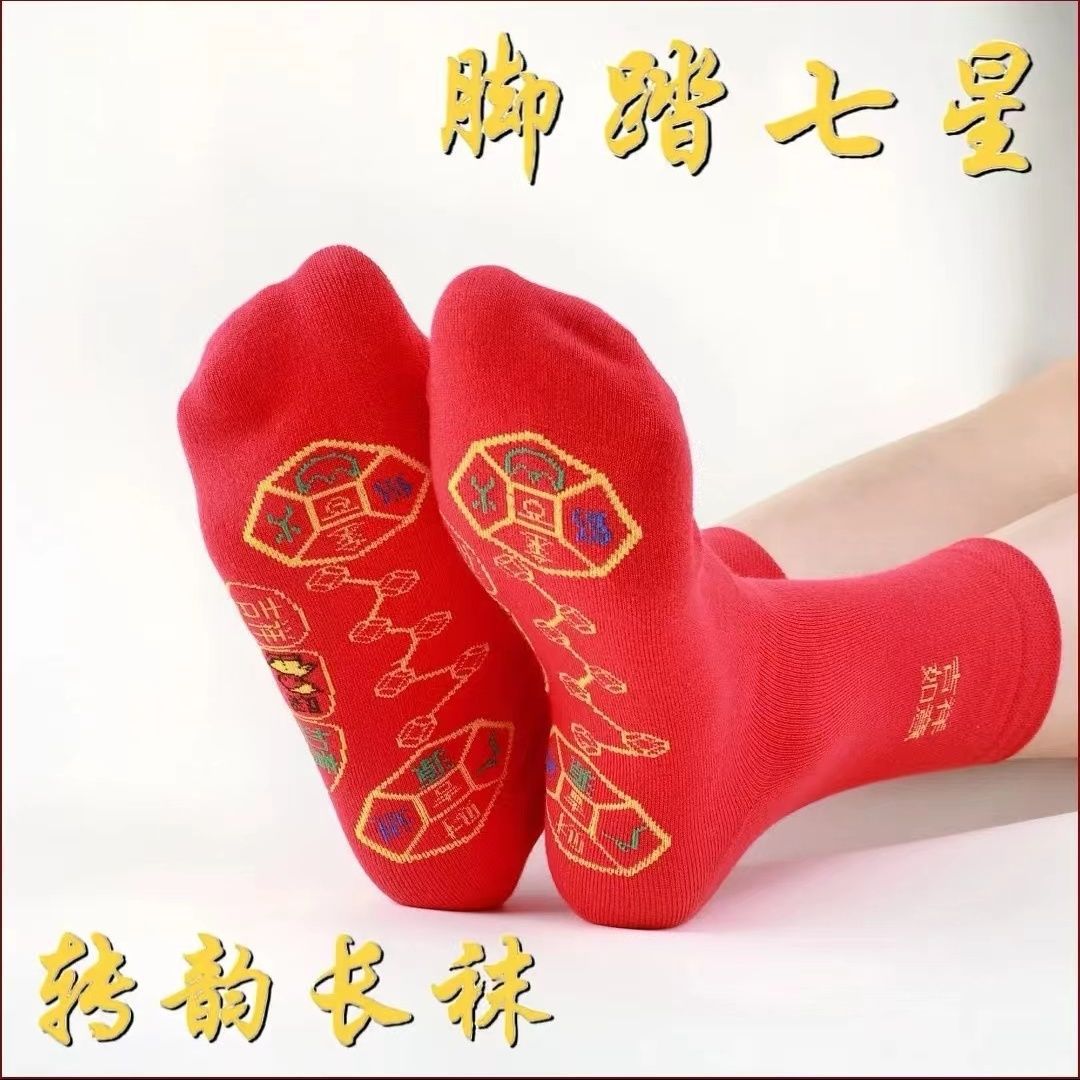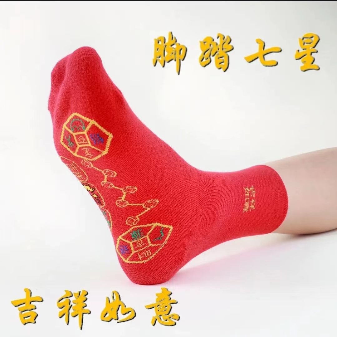脚踏红色七星袜子过本命年刺绣中筒袜喜庆防臭吸汗加厚新款运动袜