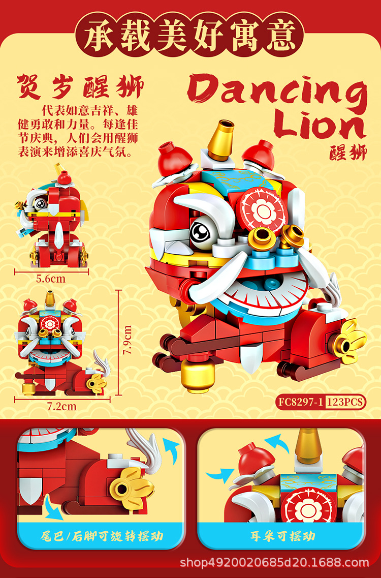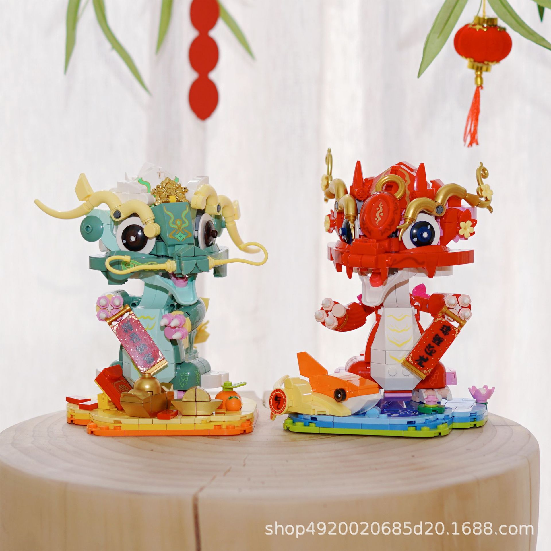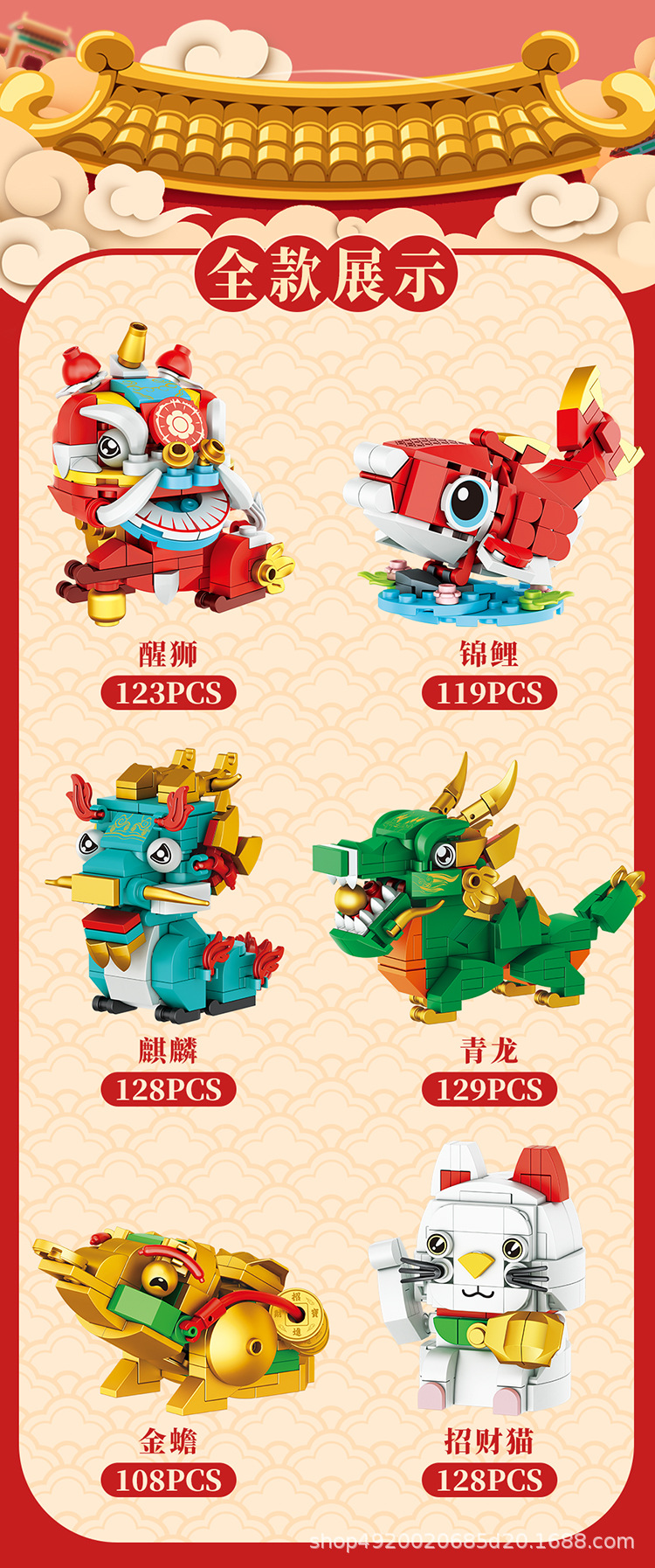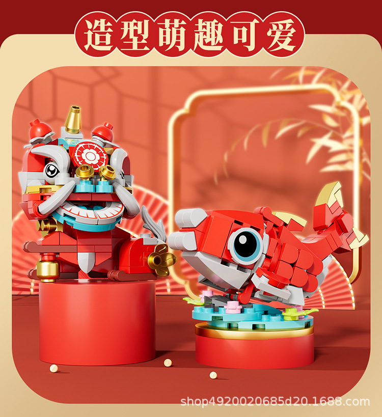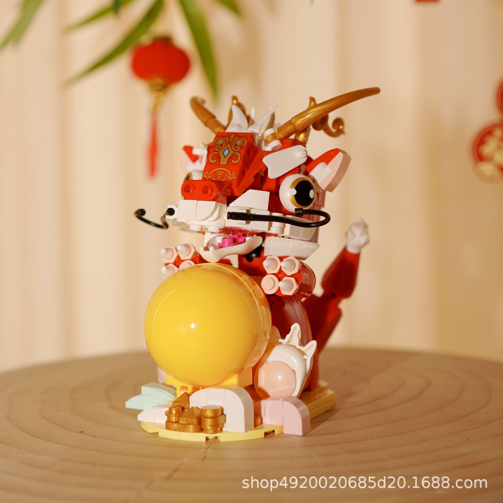 国潮积木神兽中国风摆件醒狮兼容乐高龙年伴手礼新年元旦礼物玩具