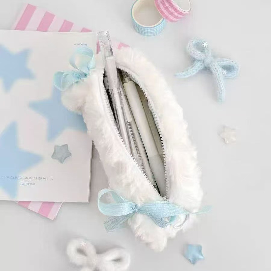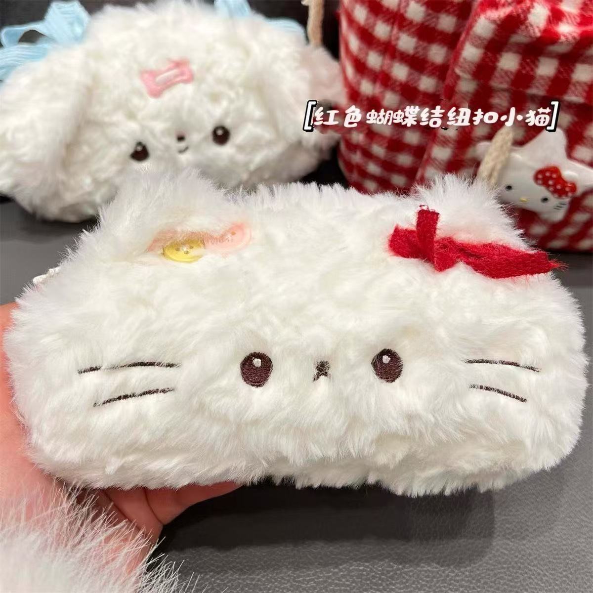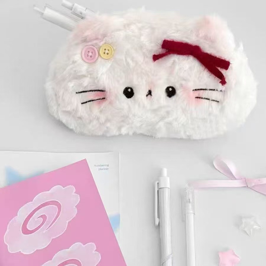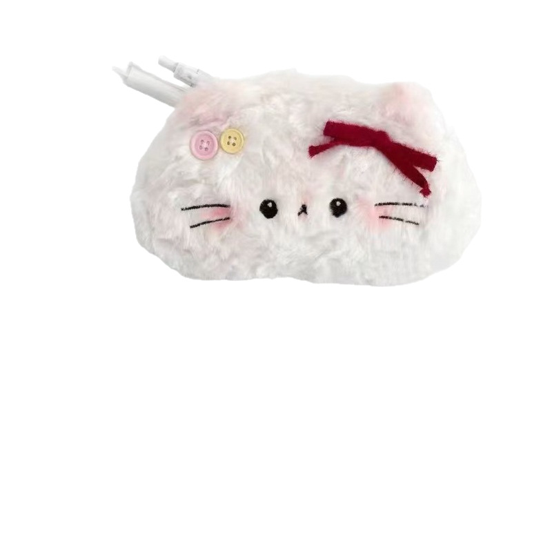 毛绒笔袋高颜值卡通可爱纽扣猫大容量收纳袋小学生铅笔袋毛绒玩具