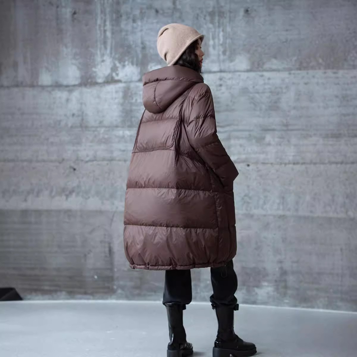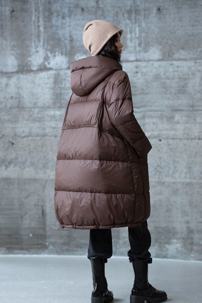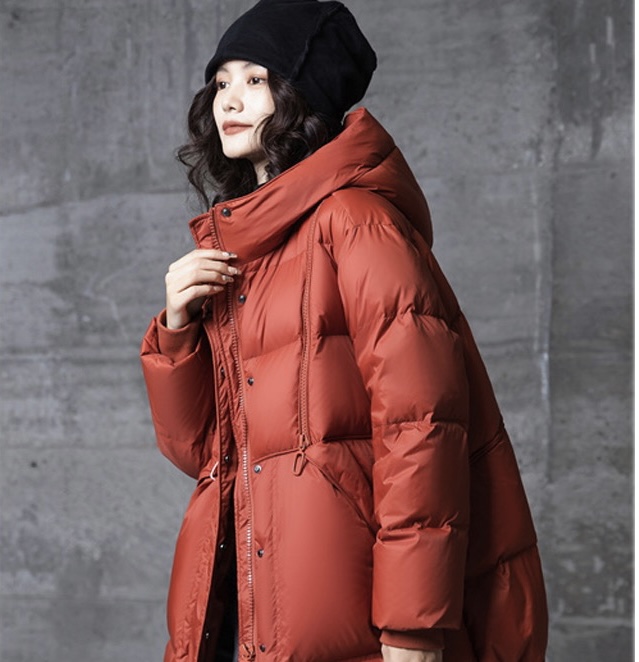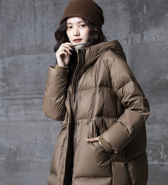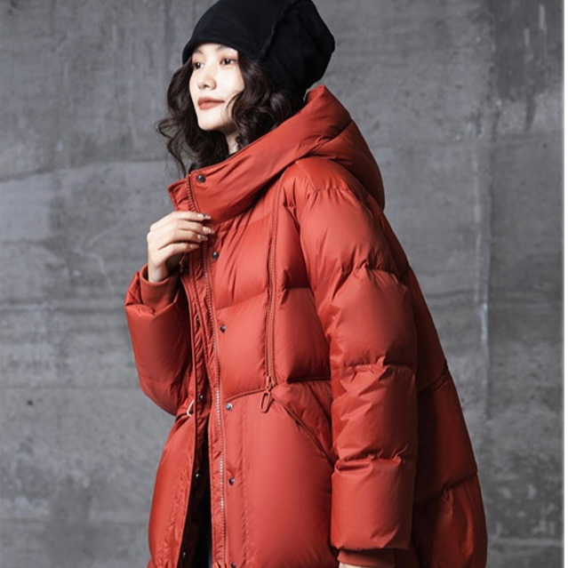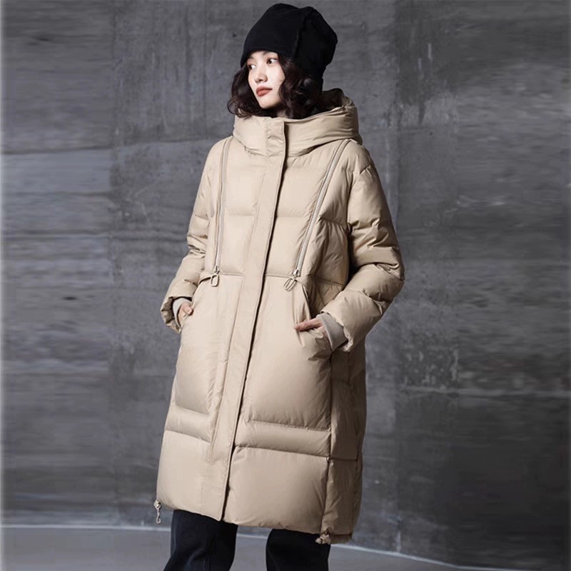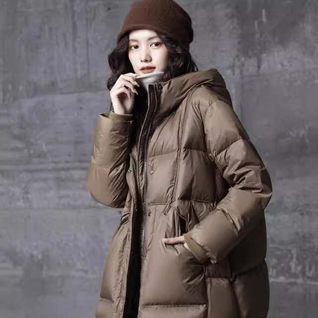 拾货出品2023冬季新款中长款连帽纯色羽绒服大口袋白鸭绒休闲外套