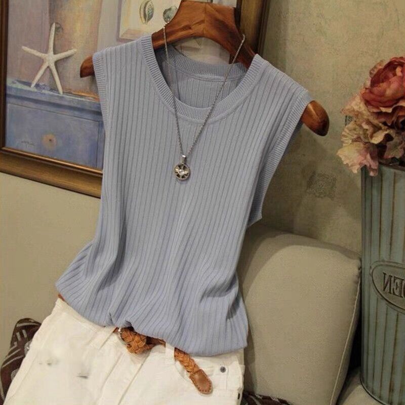 2024夏季新款女装女式宽肩带圆领佰搭薄款无袖冰丝上衣纯色针织衫