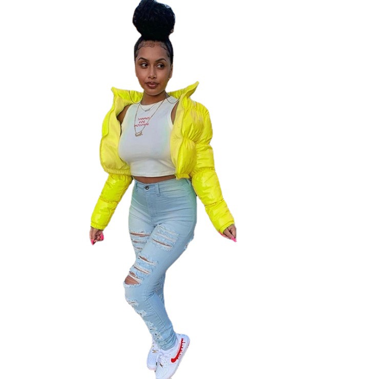 外贸亚马逊速卖通秋冬爆款棉服欧美亮色金属短款女装棉衣外套
